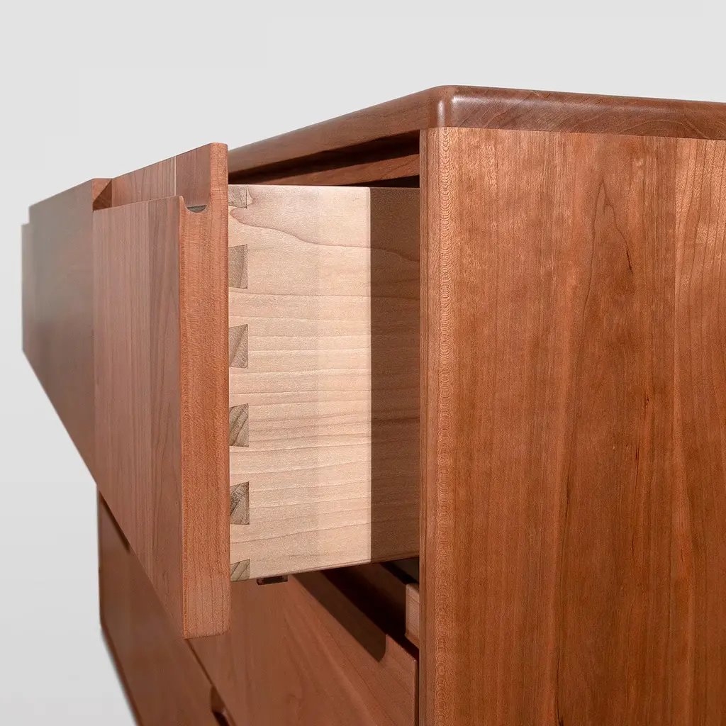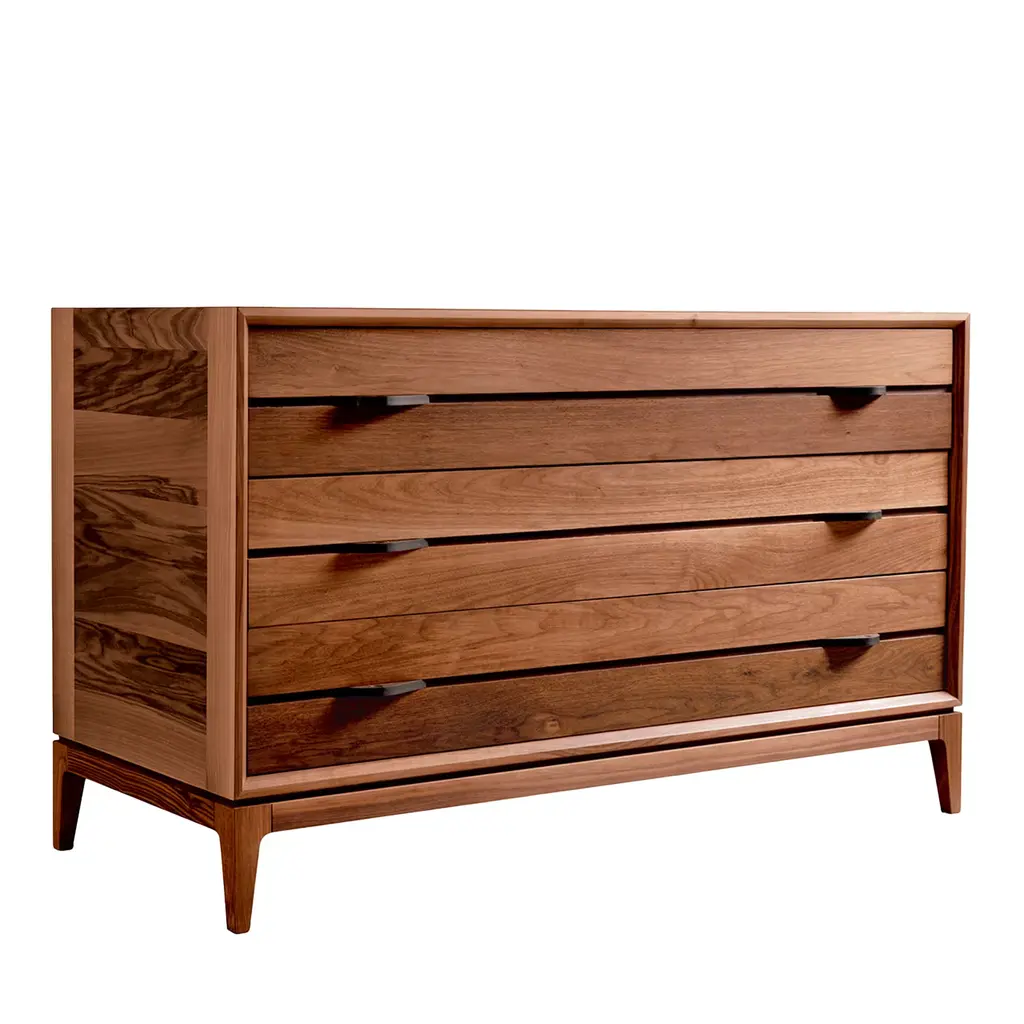 Boasting pure and simple lines, the Nordic Chest of Drawers represents modern Italian cabinetry at its finest. Handcrafted of solid cherry wood, it features three drawers with a Blumotion slow closing system, whose front panels showcase the wood’s exquisite grains in alternating vertical and horizontal panels, conferring a suggestive geometric effect. Beveled edges, dovetail joints, and strategically placed, concealed cut-out handles complete this minimalist piece. Finished with ecological water-based paints and final beeswax hand-polishing.