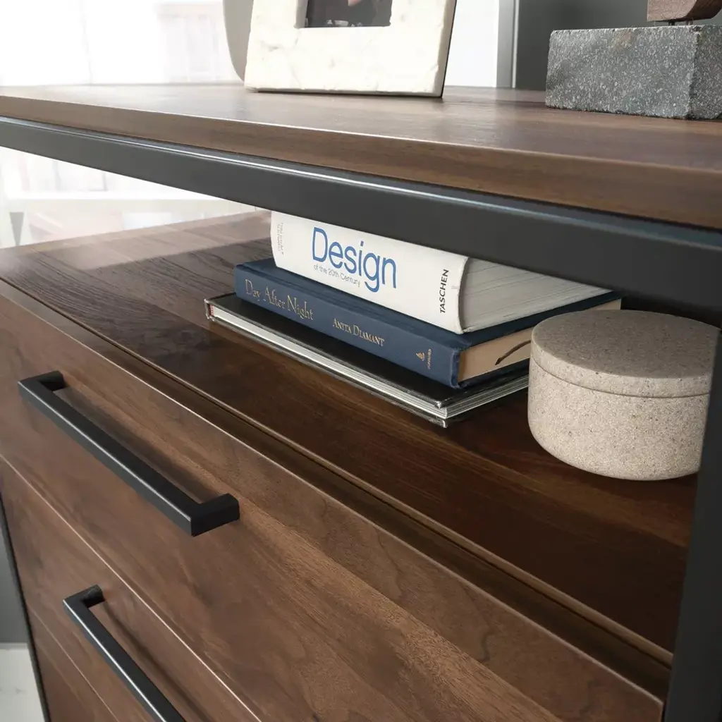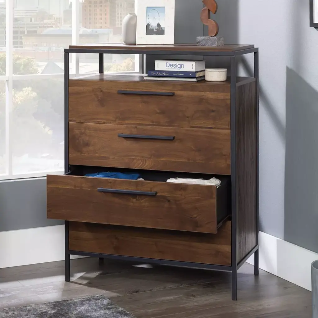 Is your abundance of clothes and accessories beginning to get a little overwhelming? We can fix that! Add some much-needed storage space to your bedroom while adding the modern design of this 4-drawer chest from the Nova Loft® collection. This metal and wood dresser features four spacious drawers with metal runners and safety stops that are ideal for convenient storage of all your favorite wardrobe options like stacks of slacks and your favorite blouses. There is even room for your collection of t-shirts and comfy sweatpants. This bedroom chest of drawers also offers a spacious top surface that provides you with the perfect amount of space to store additional bedroom items and display home décor like an accent lamp, your makeup bag, bottles of perfume, or photos of your loved ones. An open shelf below the top surface of this 4-drawer dresser can house the current book you are reading, your reading glasses, and more. Finished in Grand Walnut® and detailed with stylish attractive hardware, this dresser with open shelf is the solution to all your storage woes.