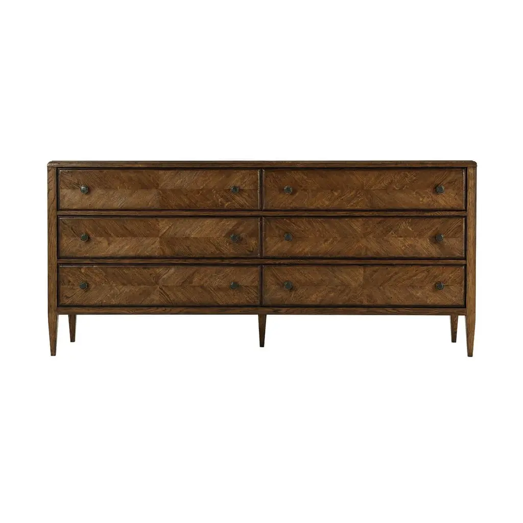 A dark oak parquetry six-drawer dresser in Dusk finish. This beautiful hand-carved oak dresser includes six drawers with mirrored herringbone starburst parquetry finished with Verde Bronze handles on classically tapered oak legs. A perfect dresser for those looking for ample storage. Dimensions: 72" W x 20" D x 33" H