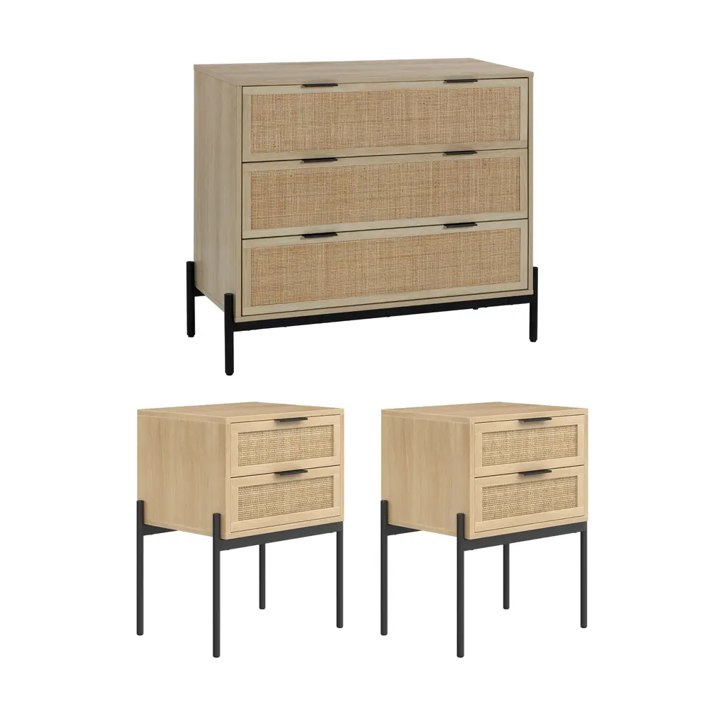 Elevate your bedroom with the Andrew bedroom set, featuring two chic nightstands and one spacious dresser that combine form and function with a touch of unique charm. Each piece stands on a sturdy, powder-coated metal base, accentuated by sleek metal drawer pulls and enhanced with interchangeable leg options, allowing the dressers to sit perfectly flush side-by-side. The natural rattan fronts give each drawer a distinctive look, ensuring no two pieces are exactly alike. The set is not only aesthetically pleasing but also designed with your convenience and safety in mind. Each dresser is equipped with three deep drawers that glide effortlessly on strong metal slides, and a built-in interlock safety mechanism allows only one drawer to be opened at a time, preventing tipping hazards.