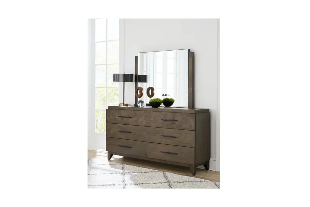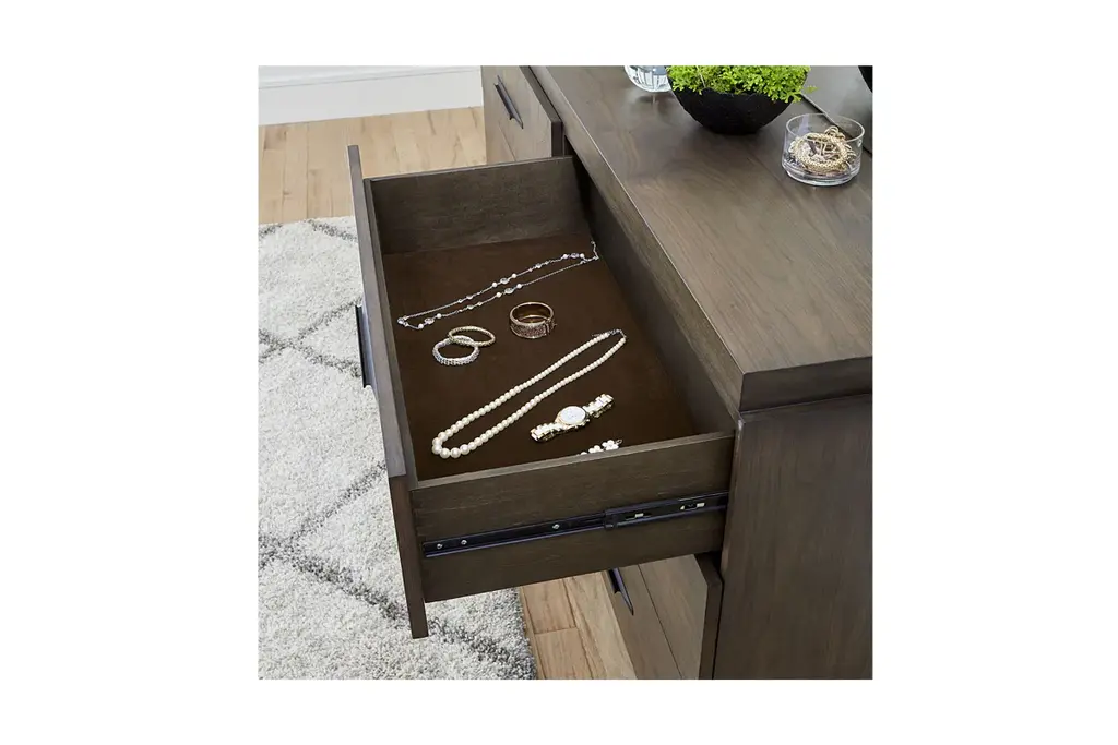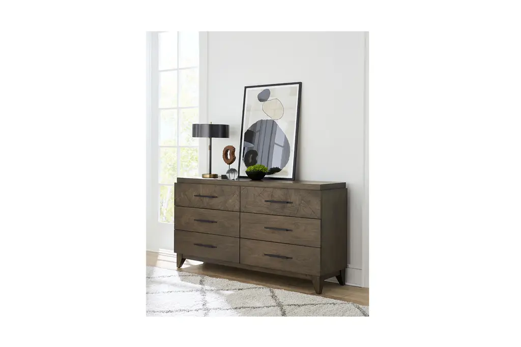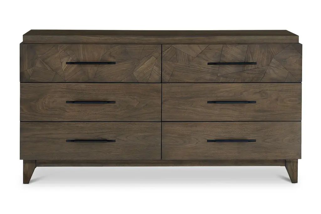 Clean lines, English dovetail joinery, and dark, rich woods give the Oakhill 6 Drawer Dresser a rich, contemporary appeal. It features six spacious drawers, the top two lined in felt, all set on smooth, ball-bearing drawer glides with wing-shaped pulls for easy access. The dresser is finished in a rich medium to dark brown with a matte lacquer top coat and sports an abstract geometric design on its upper drawers to add a touch of visual interest. Blending form and function, this dresser effortlessly adds ample storage and Mid-Century Modern charm to your living space.