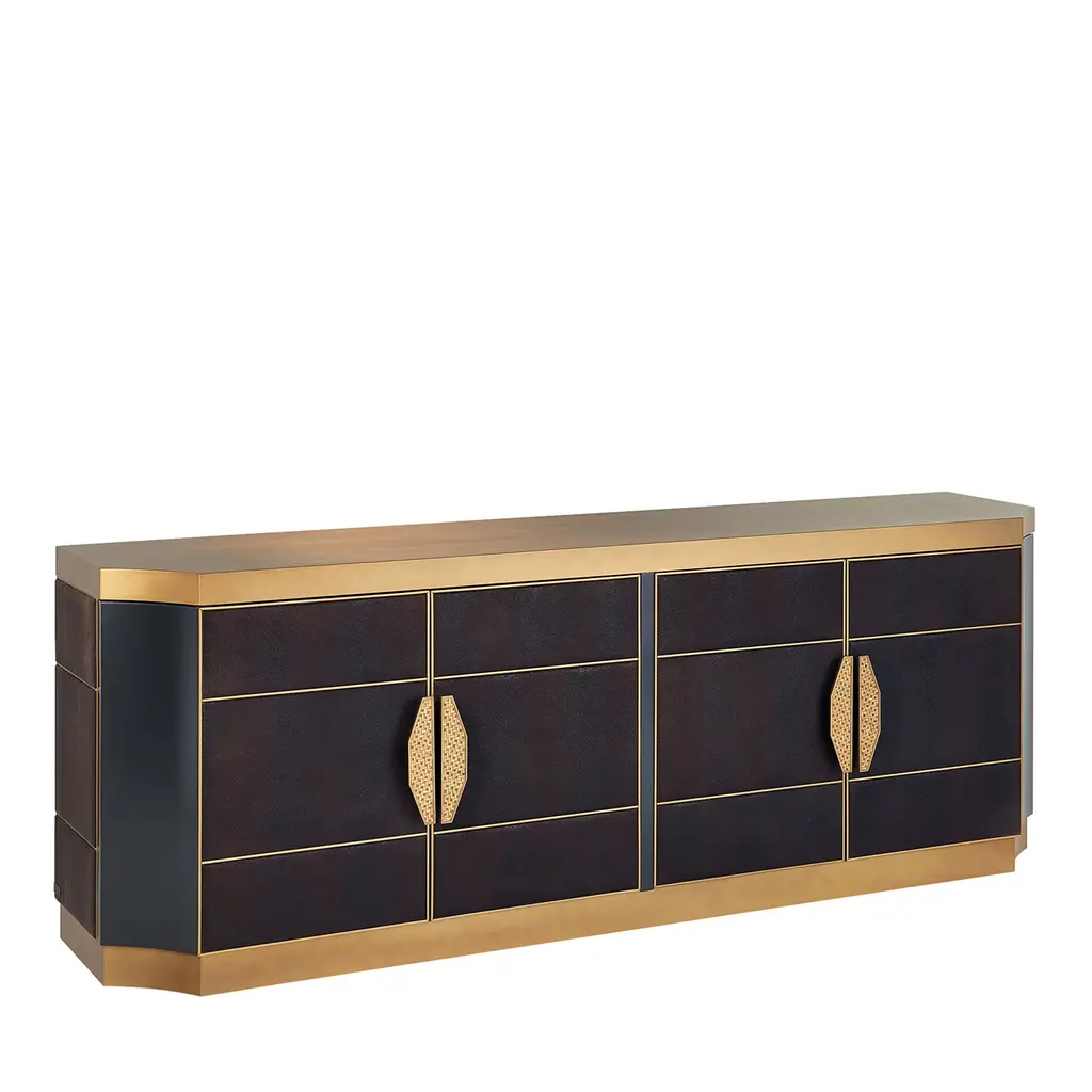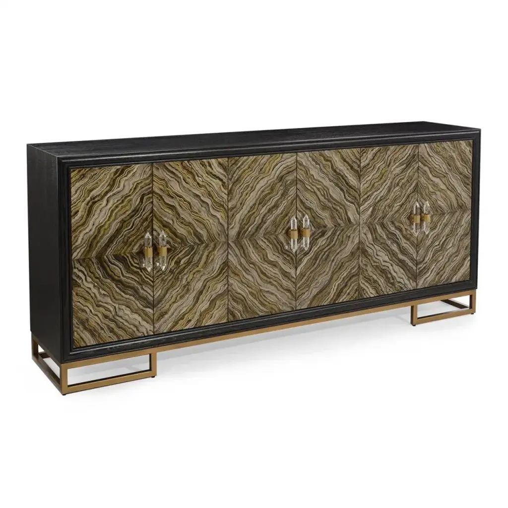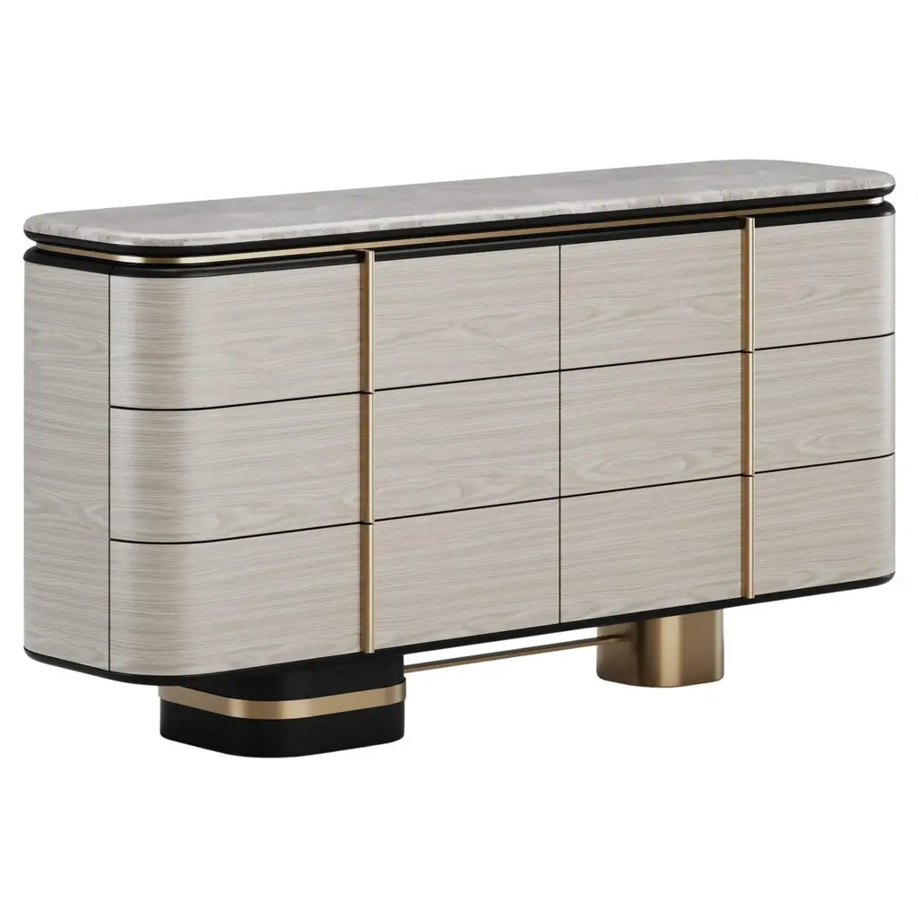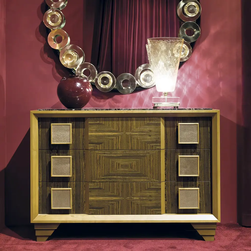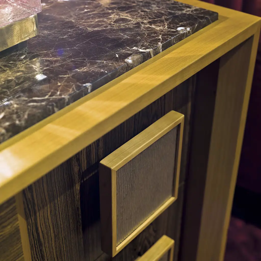 This striking dresser is a unique example of masterful craftsmanship. Entirely made by hand, it features a structure in cherry, with cherry feet mixed with bocote. The combination of these two woods appears also in the front panels of the three drawers that have a central inlay in bocote with brass handles. The dramatic dark brown grain of the bocote wood over its yellow background complements the brass square handles, while the Emperador Dark marble top adds luxury to the piece.