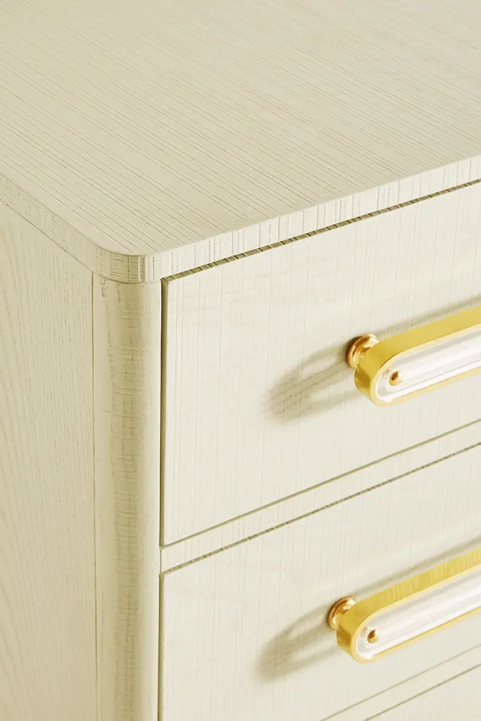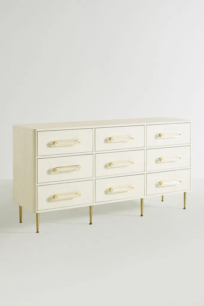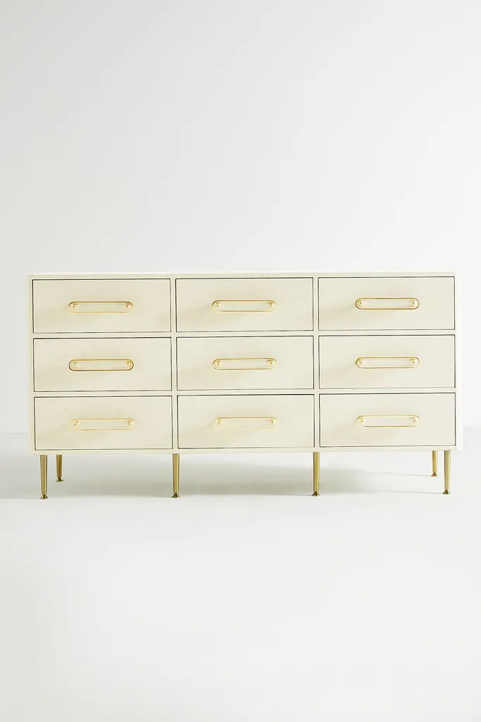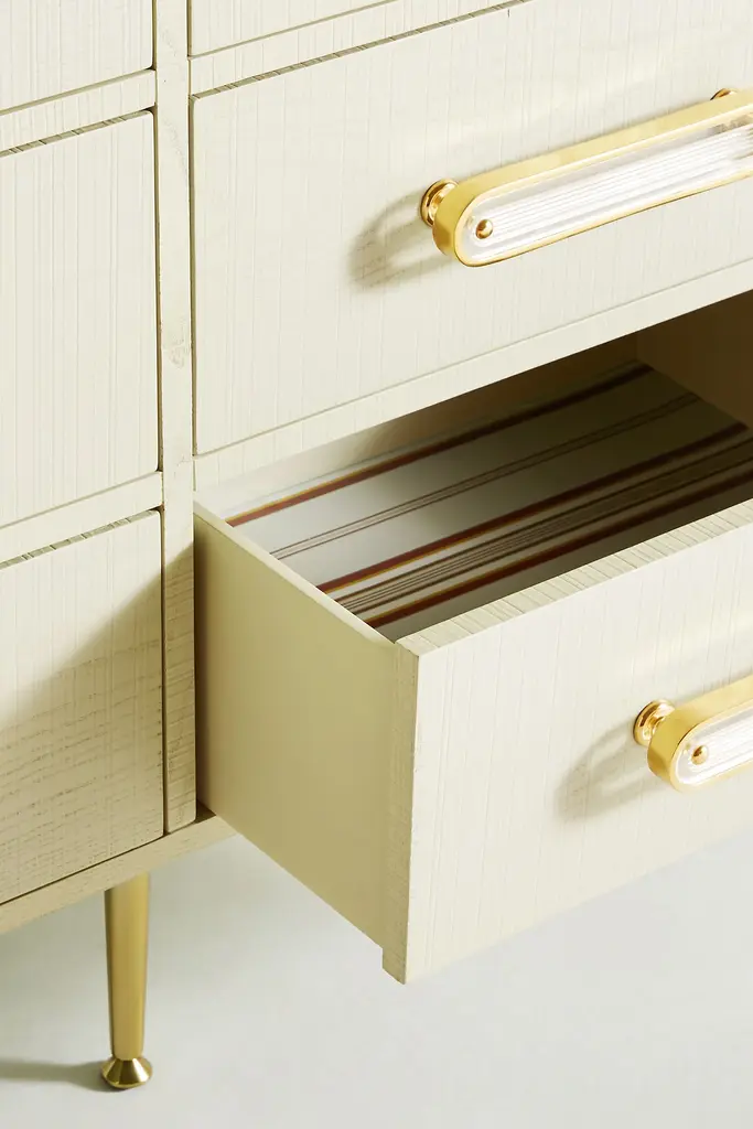 With an elevated grasscloth-inspired texture throughout, our Odetta collection is accented with elliptical brass and lucite knobs etched with the same fine detail as reflected in its veneer. Featuring nine drawers of generous storage, it's a welcome addition to any transitional bedroom space. About Tracey BoydWhether drawing inspiration from her extensive travels or tapping into her background in fashion, Tracey Boyd’s furniture collections for Anthropologie exude an expertise in color, craftsmanship, and unexpected detail. Learn more about her signature techniques in our interview with this celebrated designer. For ordering assistance and more, please contact us. For aesthetic advice and tips to help decorate your space, enjoy our complimentary home styling services.
