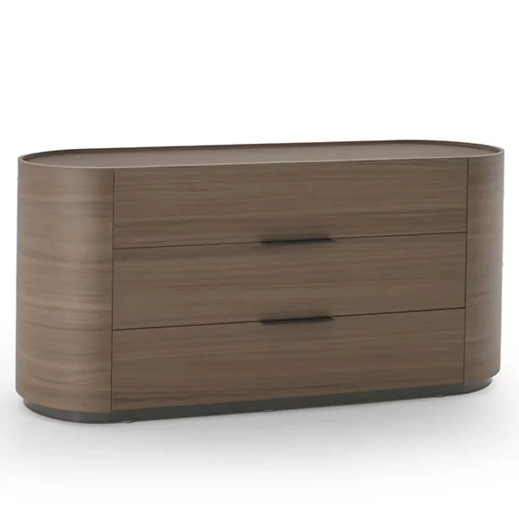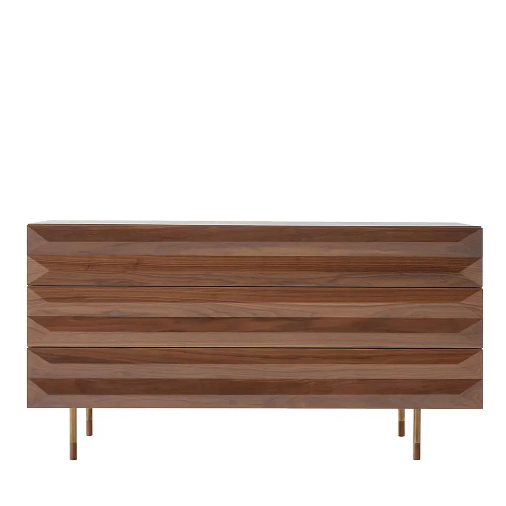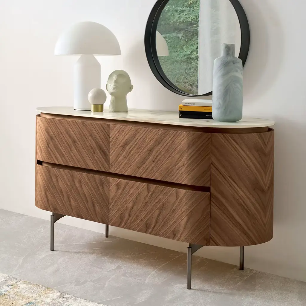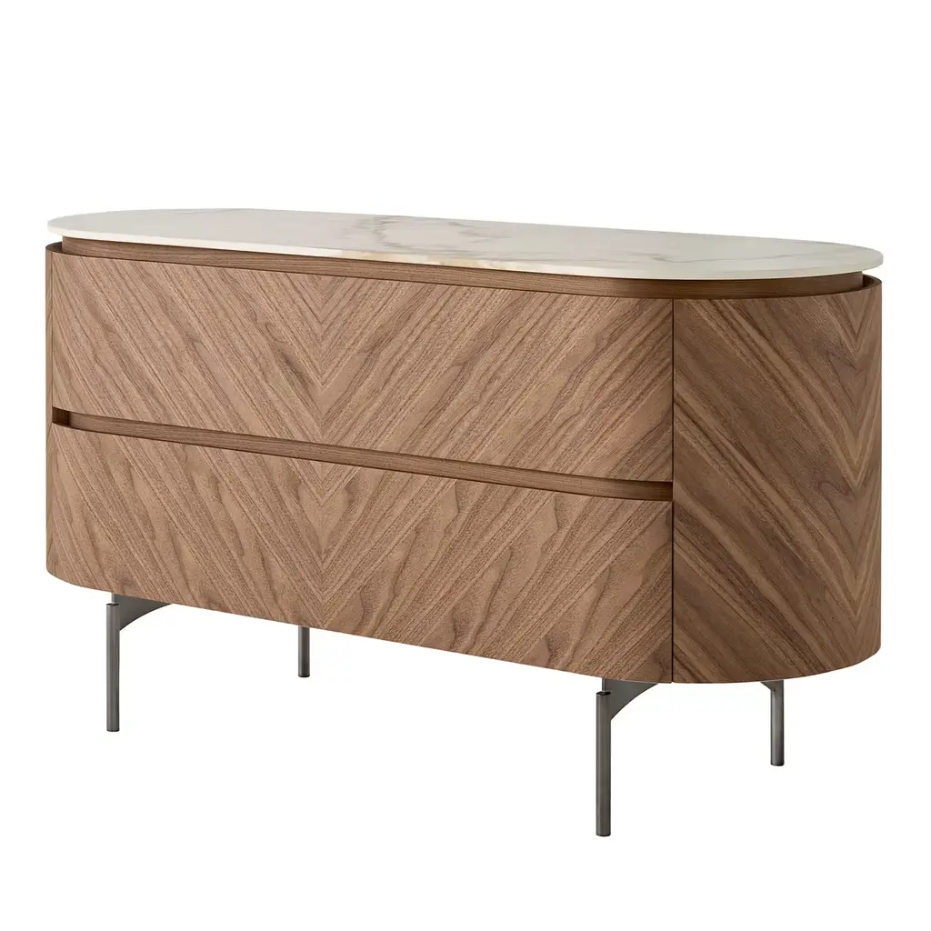 A harmonious blend of materials, this dresser balances the warmth of Havana walnut with the smooth sophistication of a Calacatta ceramic top. The meticulously crafted herringbone veneer flows seamlessly across the curved structure, softening its geometric profile. Two drawers with hidden grooves and cushioned tracks ensure a sleek, handle-free look, while nickel legs provide a lightweight contrast. Designed for spacious living areas, it transforms utility into timeless elegance.