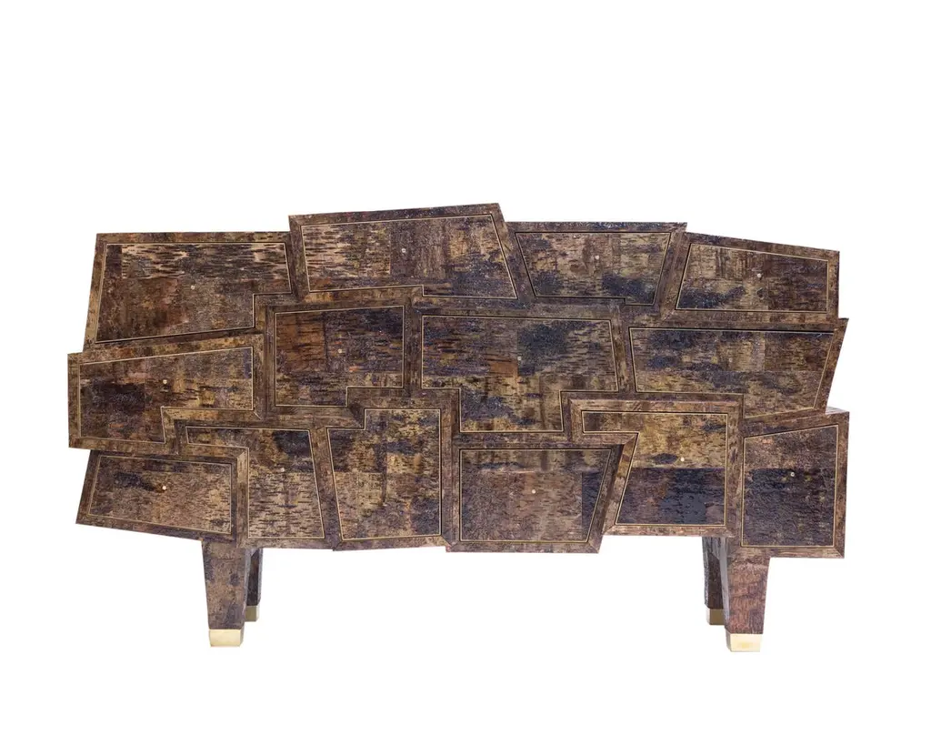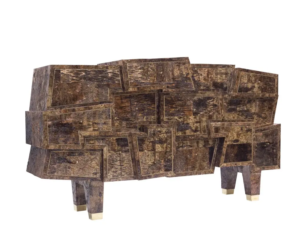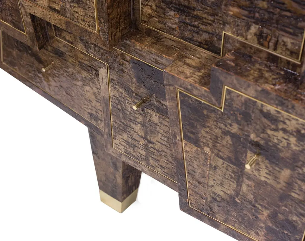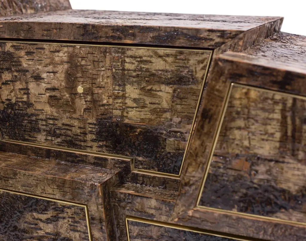 Plywood with dark birchwood.Finished with epoxy and lacquer. Brassfinishing and details.Size: 110 X 220 X 55 cm.Signed Werner Neumann.The Birchwood collection: Werner Neumann found loose pieces of birchwood while hiking in the woods, brought them to hisstudio and started experimenting with it. This resolved in a broad collection of birchwood covered furniture.Werner Neumann, is an internationally recognized furniture designer from The Netherlands, has two new collections of furniture, organic and birchwood, The Organic collection inspired by organic shapes and forms found in nature, was created by upholstering these forms with atypical materials like brass and leather. The Birchwood collection features pieces that were covered in birch bark that Neumann found in the forest.