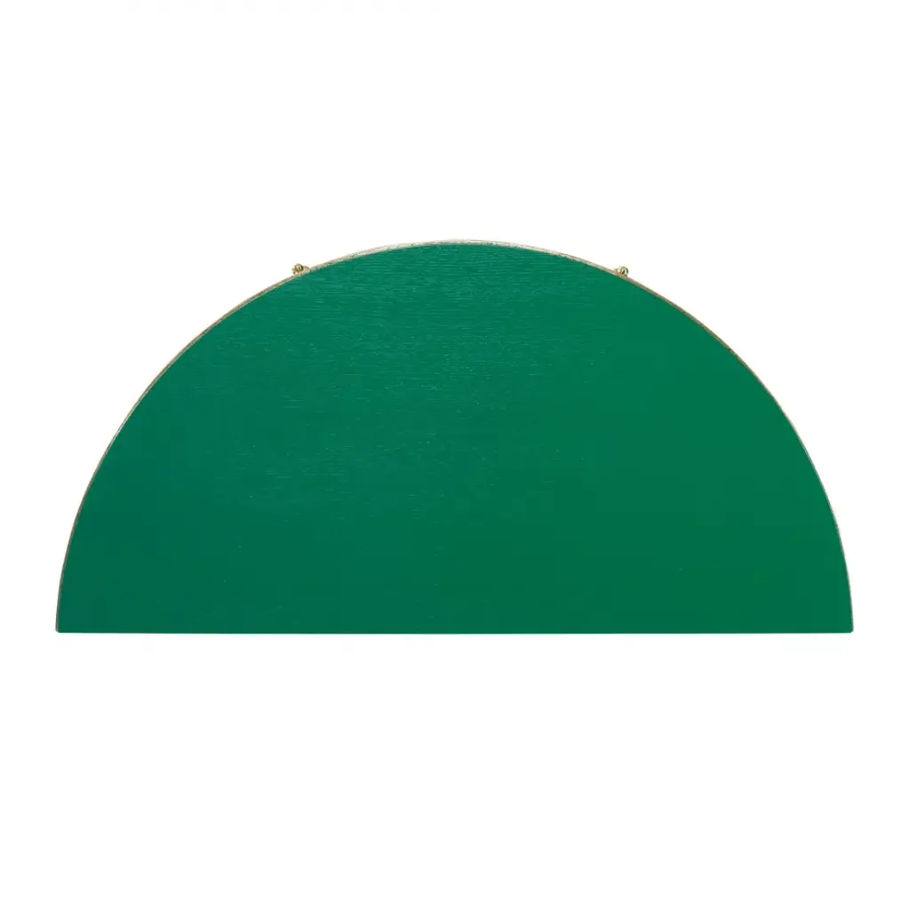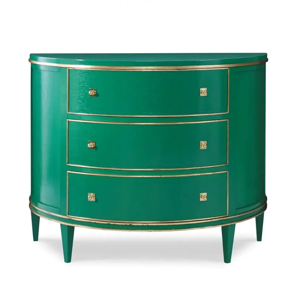This classic demilune is crafted from Oak solids and veneers. The three drawers include brass pulls and soft close metal glides. Finished in emerald green with gold leaf accents.