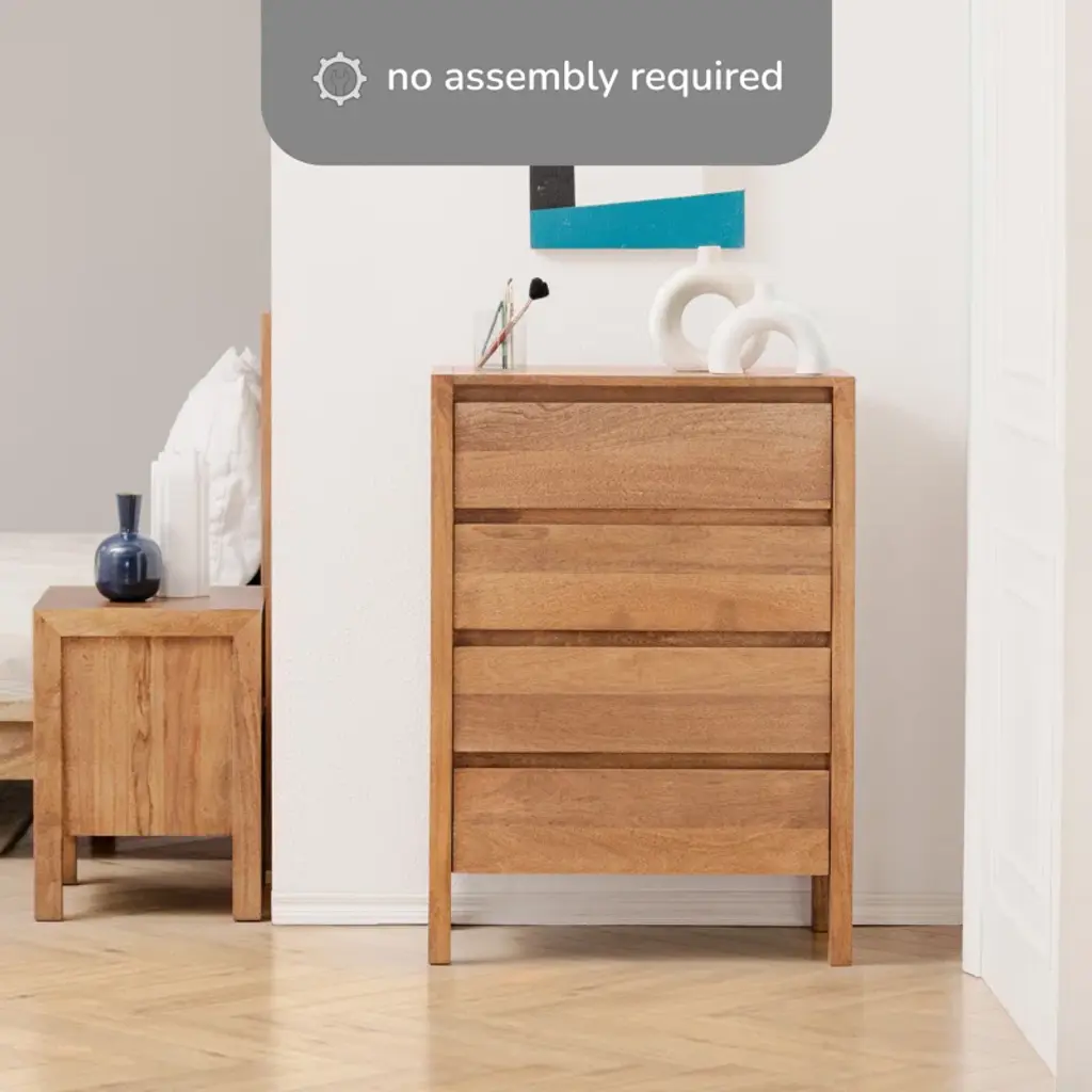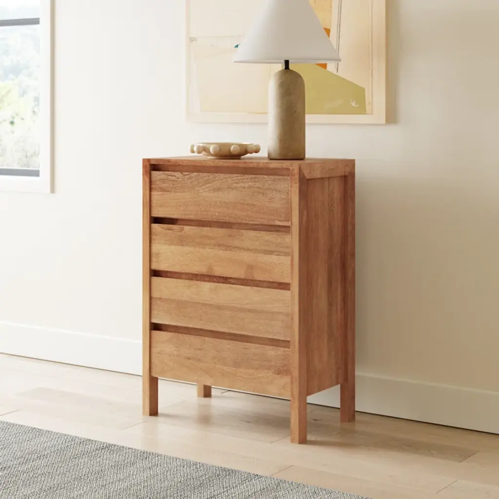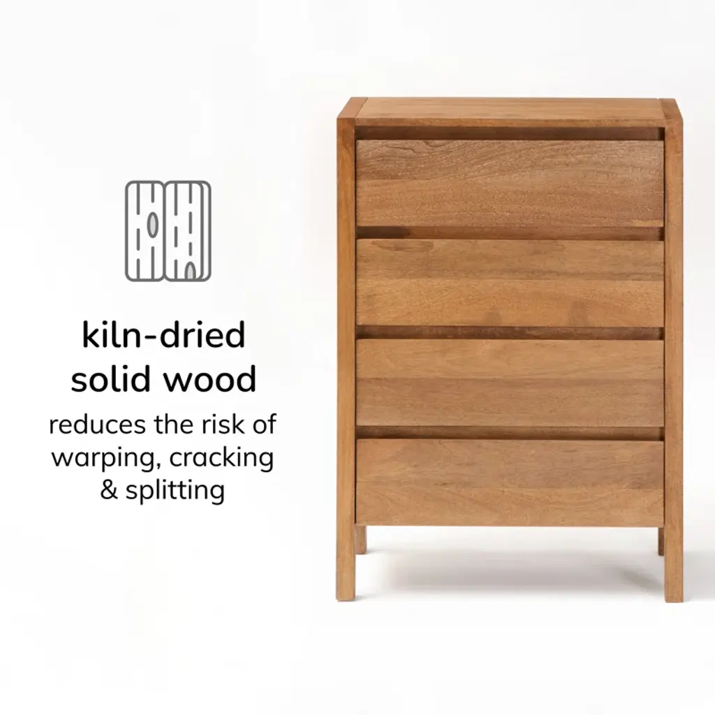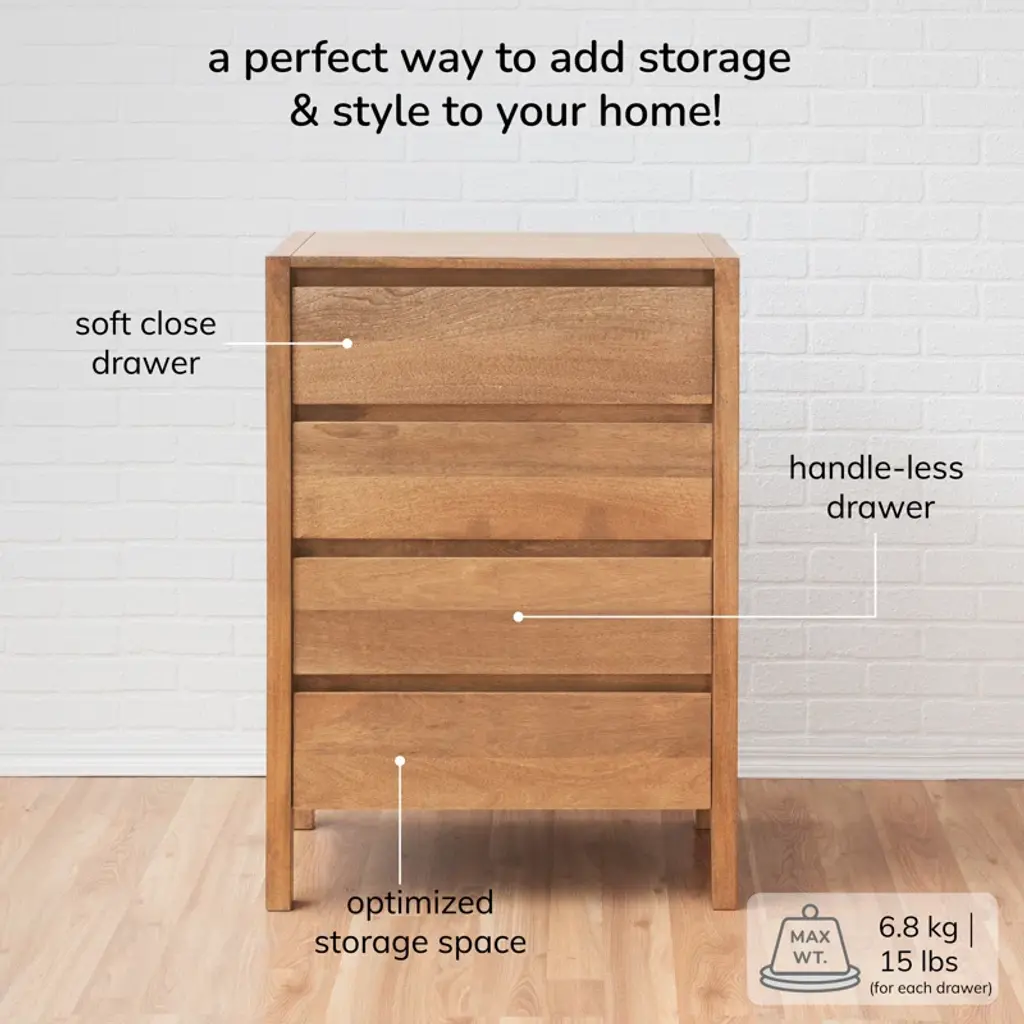 NEAT RETREAT Subtle. Sophisticated. So Scandi. Our chest of drawers keeps decluttering on your tips, keeping your living space organized in style. What more? It blends well with most decors! Crafted with solid wood by skilled artisans, the clean lines and graceful finish is sure to catch attention. The handless & roomy drawers are perfect for handy storage or hiding away your mess! Check out the simple grooves- they make opening and closing the drawers smooth.