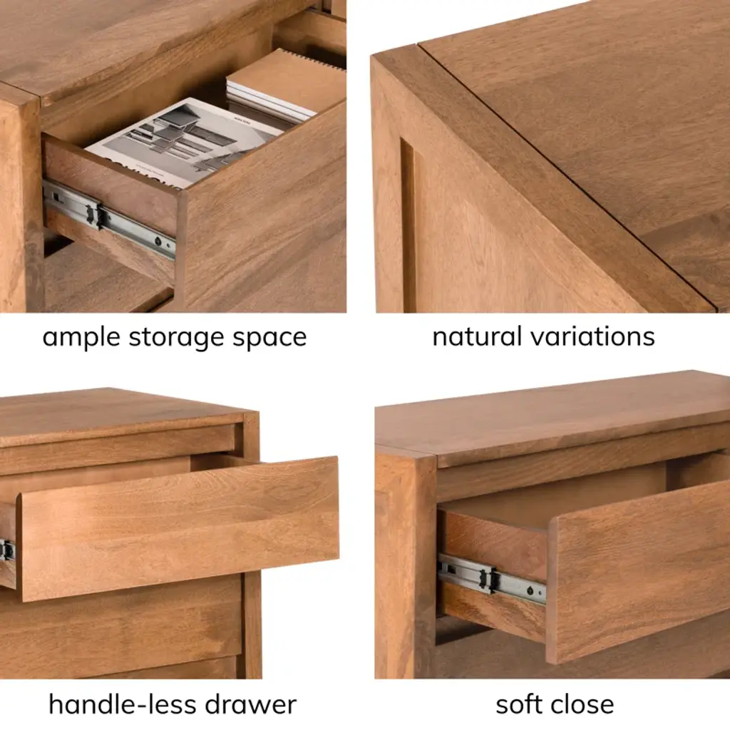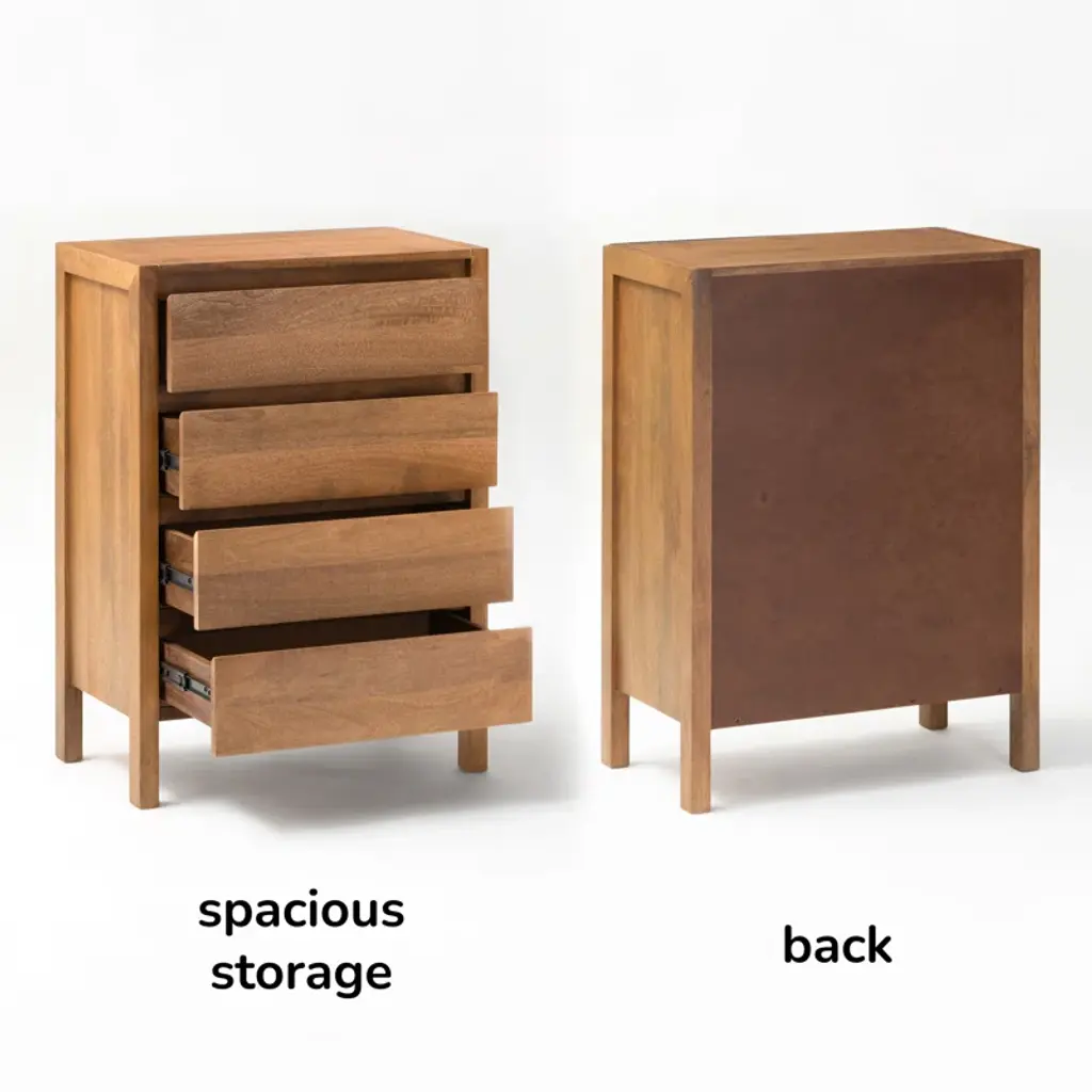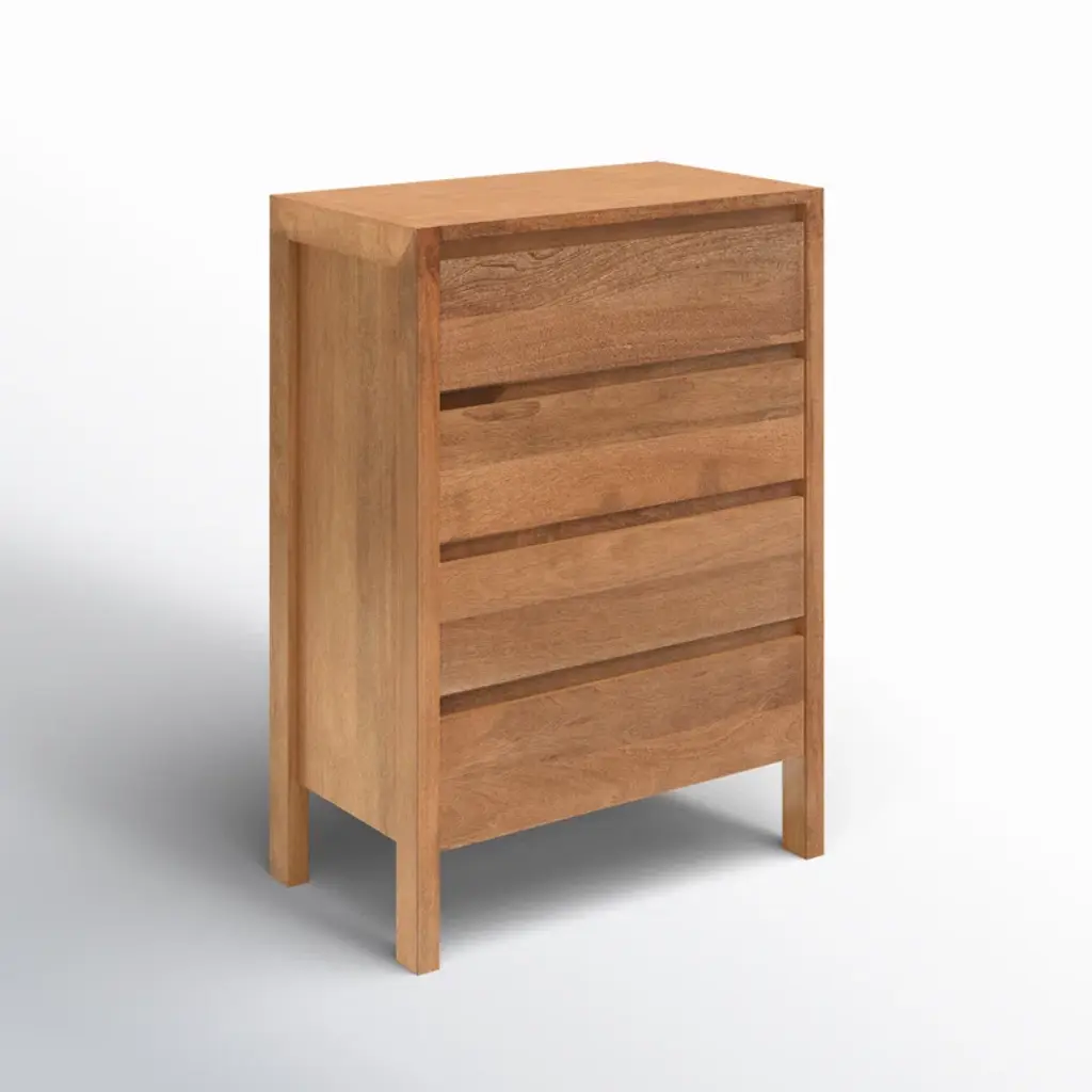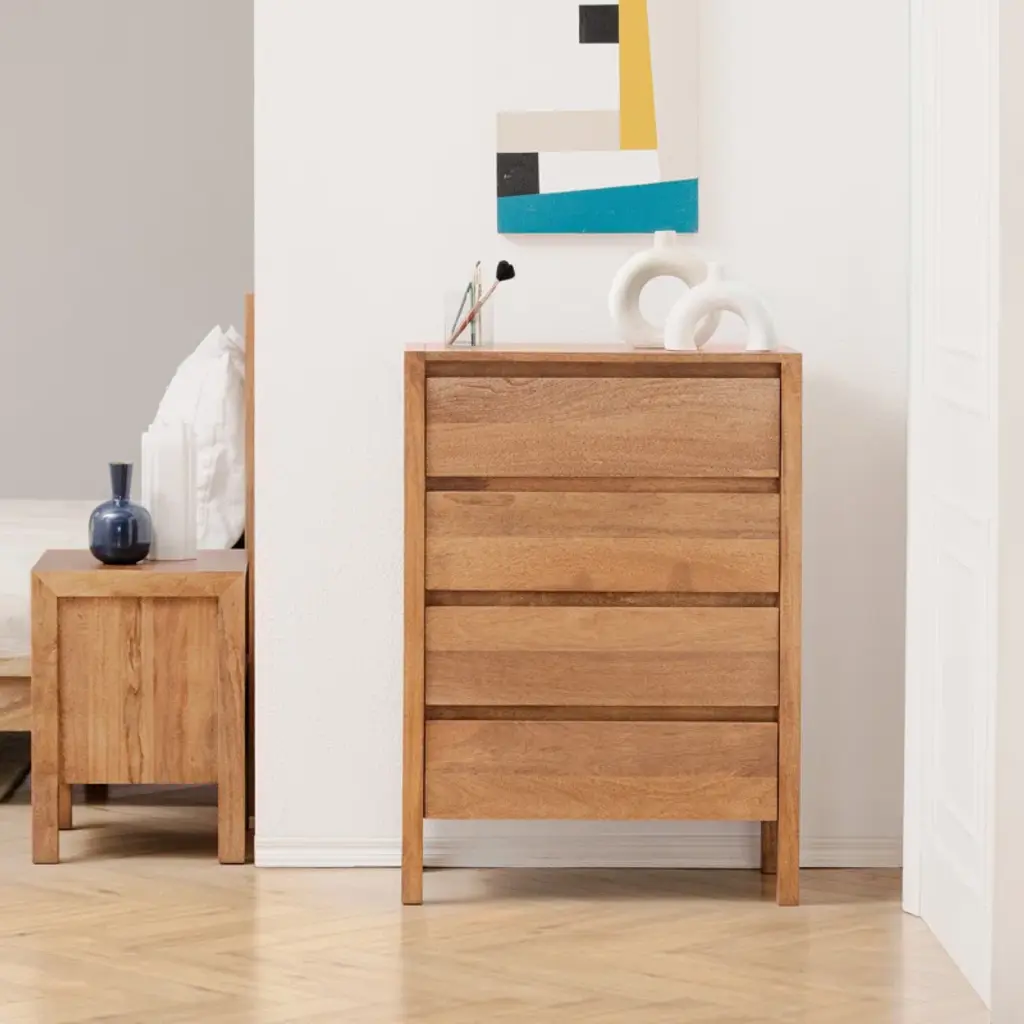 NEAT RETREAT Subtle. Sophisticated. So Scandi. Our chest of drawers keeps decluttering on your tips, keeping your living space organized in style. What more? It blends well with most decors! Crafted with solid wood by skilled artisans, the clean lines and graceful finish is sure to catch attention. The handless & roomy drawers are perfect for handy storage or hiding away your mess! Check out the simple grooves- they make opening and closing the drawers smooth.