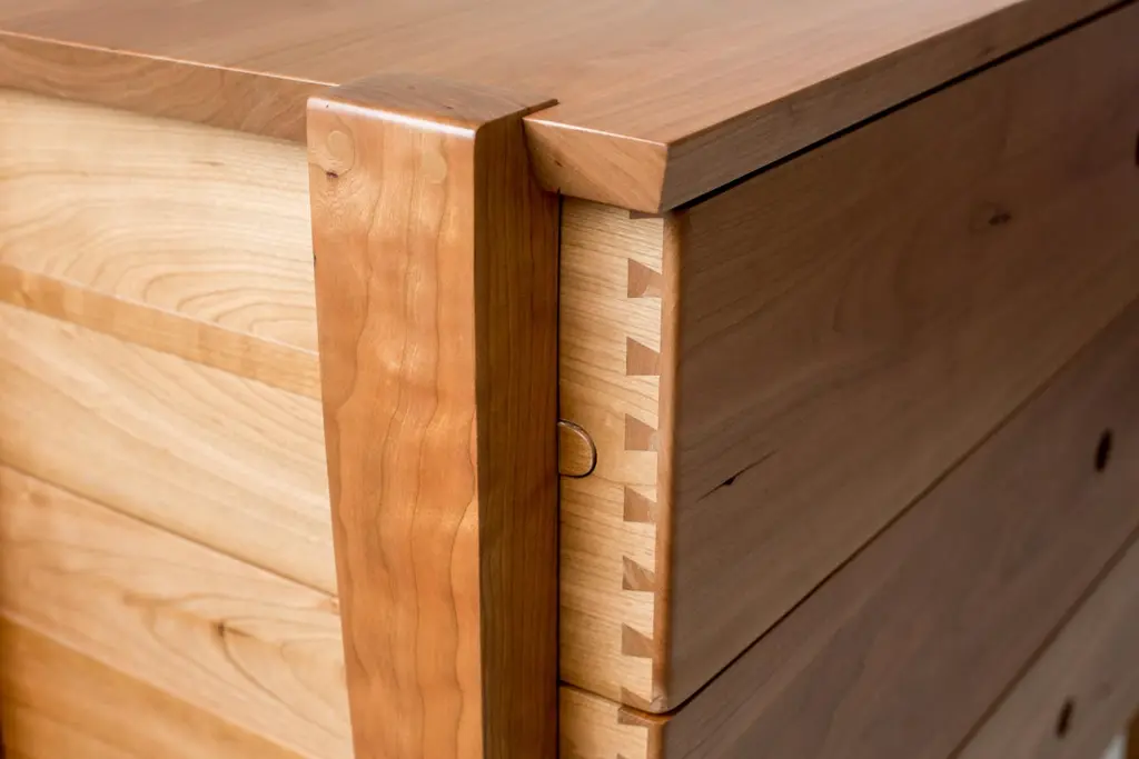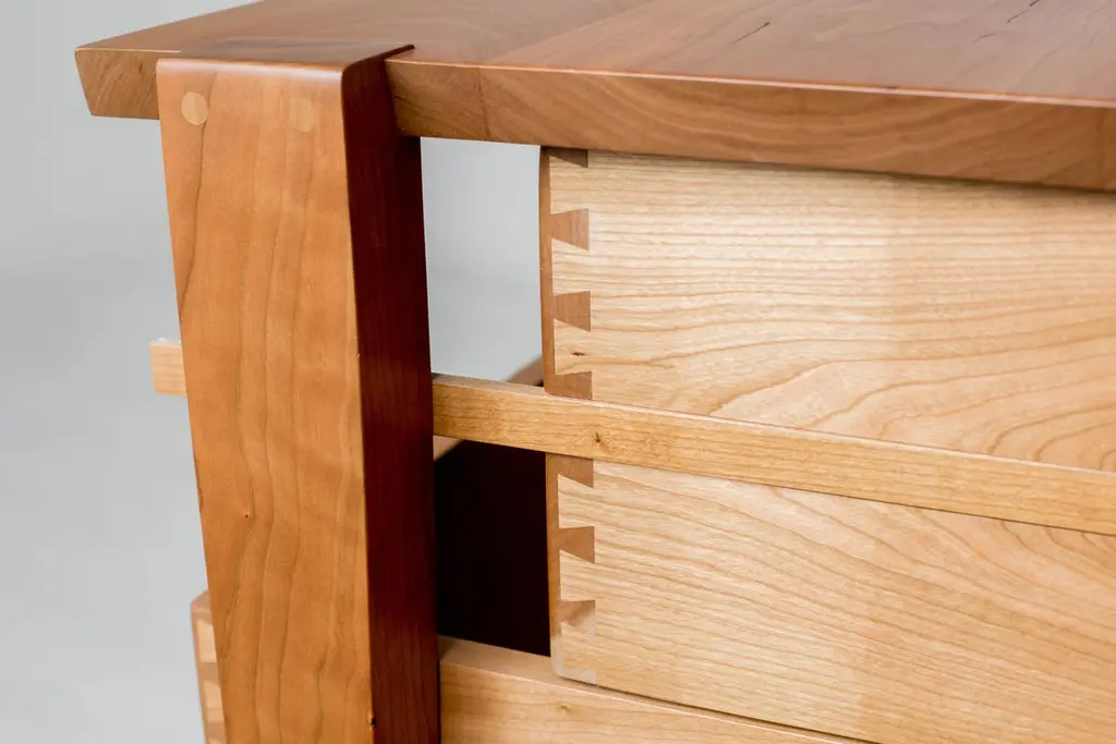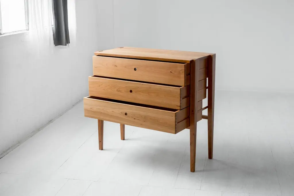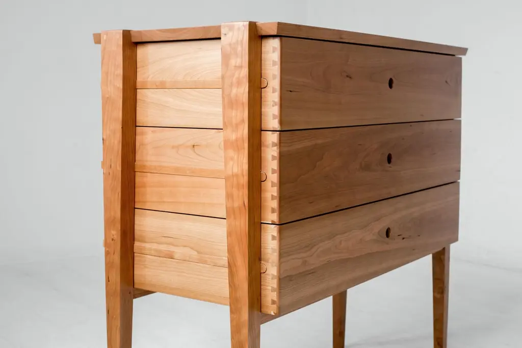 Simplicity and beauty intersect in this modern interpretation of a tradition design. Our Oslo cherry dresser features three deep dovetailed drawers nestled in an open frame. The drawers slide smoothly on waxed wood rails, revealing the mechanism at work and the texture and grain of the wooden drawer sides. Free of handles or knobs, open holes replace traditional hardware giving modern character and timeless detail to the understated elegance of this dresser. This exquisitely handcrafted dresser is one to keep in your family for generations to come.