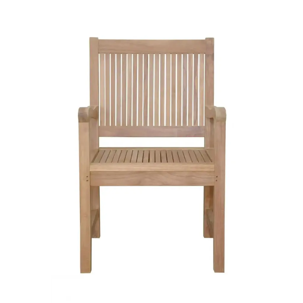 This Chester Diming Armchair designed for restaurant and café purposes is an economical yet durable and comfortable chair for sitting with family and friends for hours. It is generously sized for added comfort and handsomely crafted in solid construction of plantation kiln dried teak, which makes this chair a wise choice for your dining needs. Treated with a waterbase coat and sealer, it ensures added protection againts the weather elements and outdoors. Add any table of your choice for a complete outdoor dining set. Be sure to add cushions from All-Weather Sunbrella Fabrics for even more comfort.