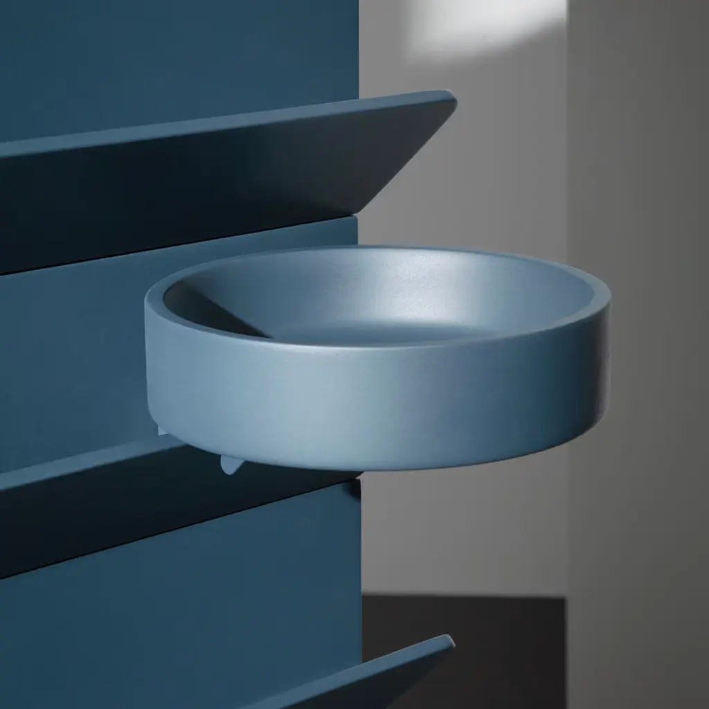 This totem-like structure was designed by Lorenzo Damiani as part of the Overlooking collection, a series of solid Canaletto walnut pieces whose shape evokes the concept of a home, with the internal space containing everyday necessities, and the sculptural elements of the handle, with their protruding diagonal silhouettes, as balconies. Sophisticated and modern, this piece can be combined with the others in the same collection for a striking effect.