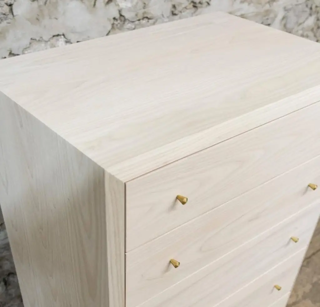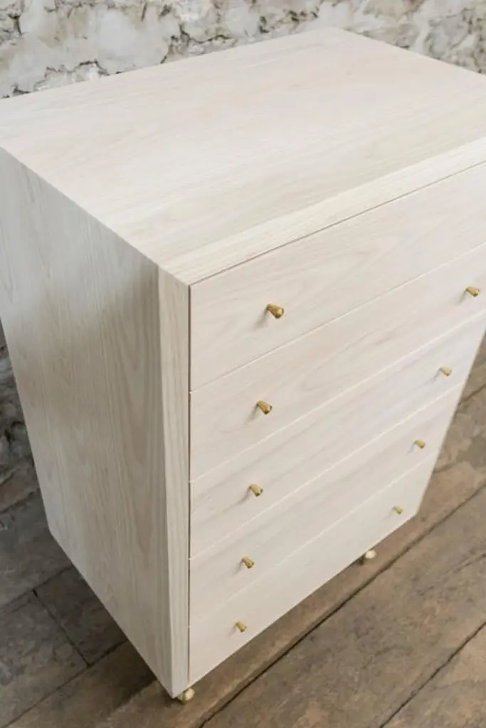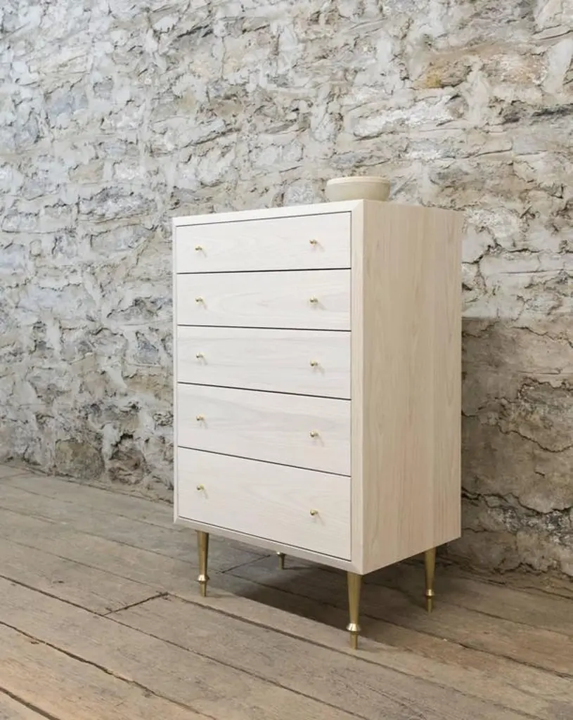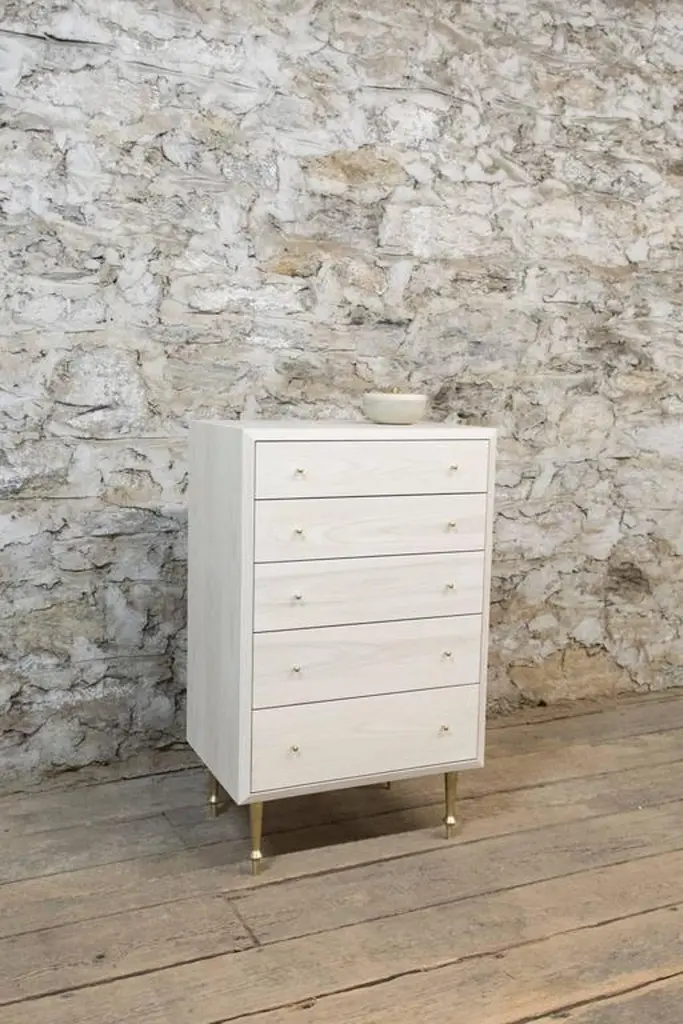 Solid bleached ash with turned brass legs and drawer pulls.Fabric drawer linings upon request for an additional fee.Flat waterborne finish.Dimensions: 42” H x 26” W x 18” D.Custom sizing and configurations available.Offered in a variety of hardwoods and finishes.