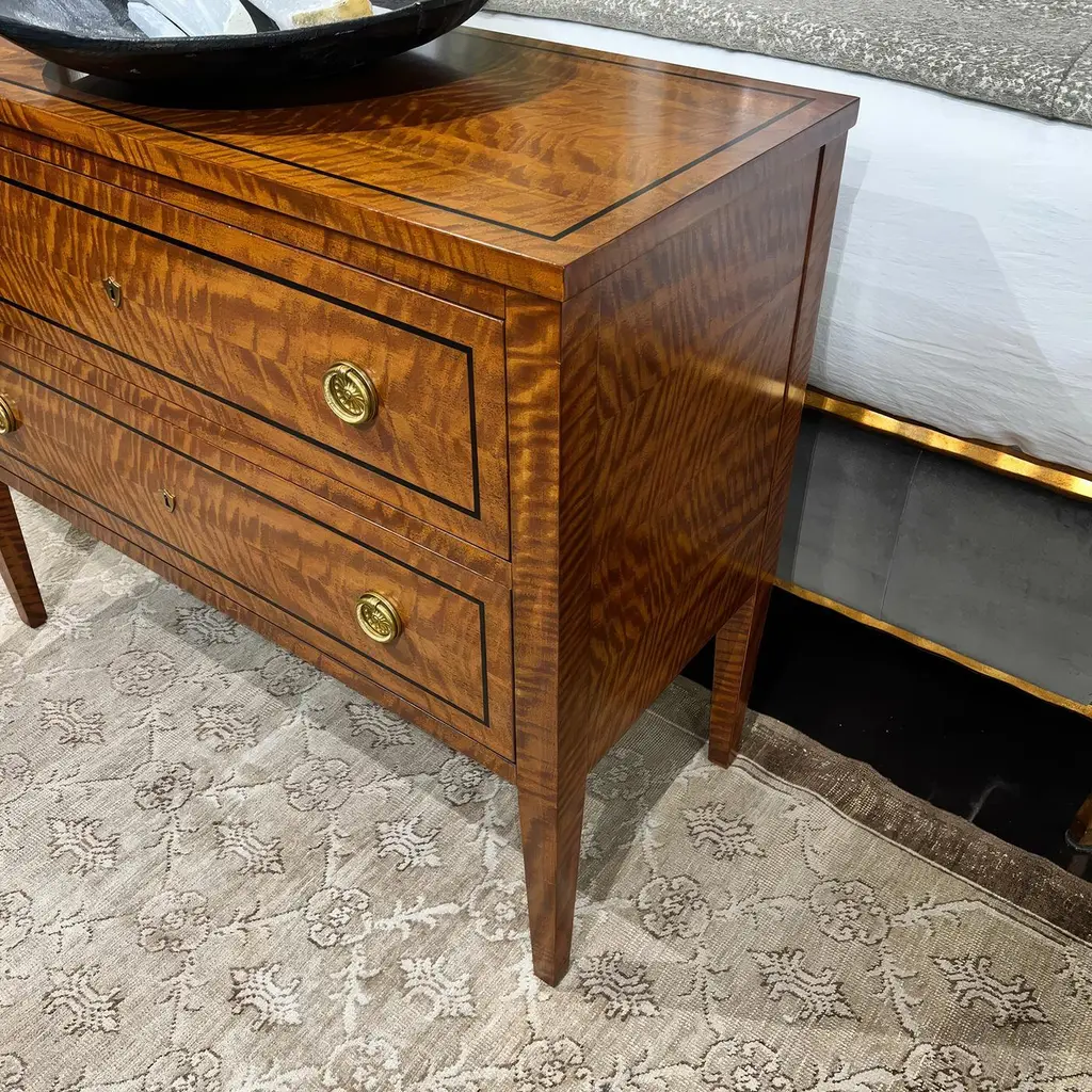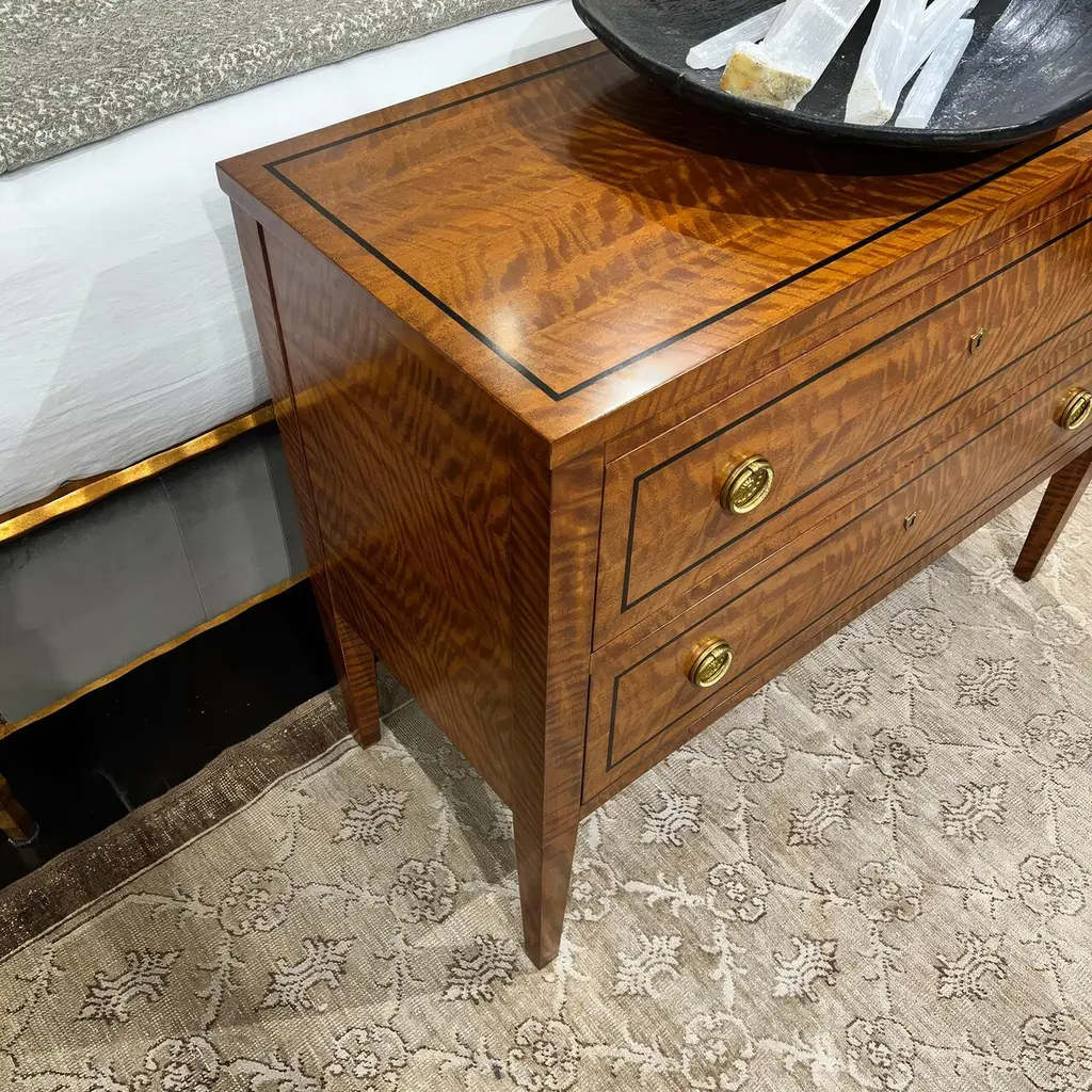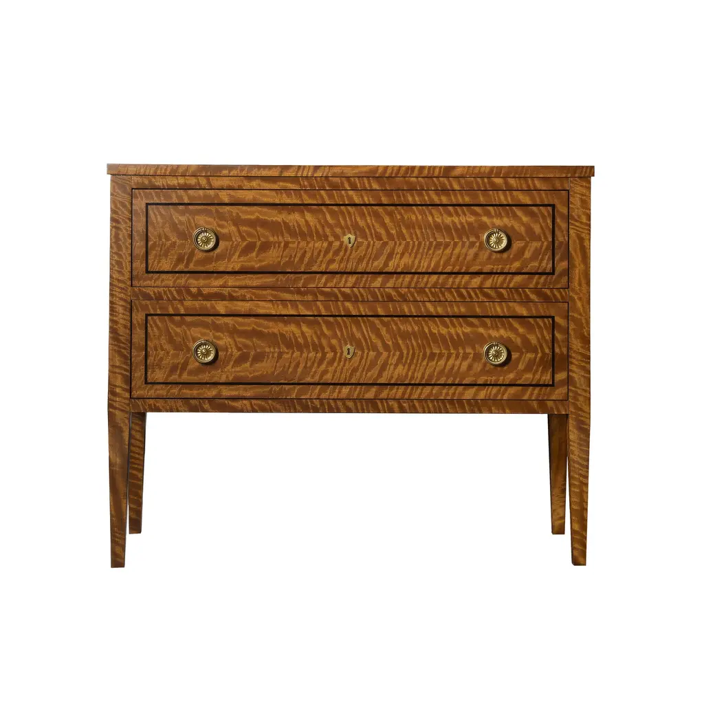 Crafted from exotic figured movingui veneer with refined black line inlays, this luxurious chest exemplifies timeless sophistication. The oak drawers, equipped with modern soft-close mechanisms, ensure smooth and silent functionality, blending beauty with convenience. Ring pull brass hardware enhances the classic design. Blending classic design with practical features, this commode fits perfectly into any upscale interior. The smooth, polished finish shows off its natural beauty, making it a standout piece for bedrooms, living rooms, or entryways. With two spacious drawers, it provides plenty of storage space while keeping a simple yet elegant style. Dimensions: 44" W x 18.5" D x 36" H
