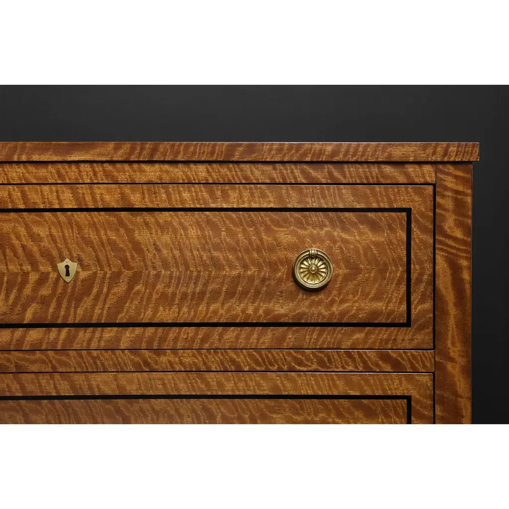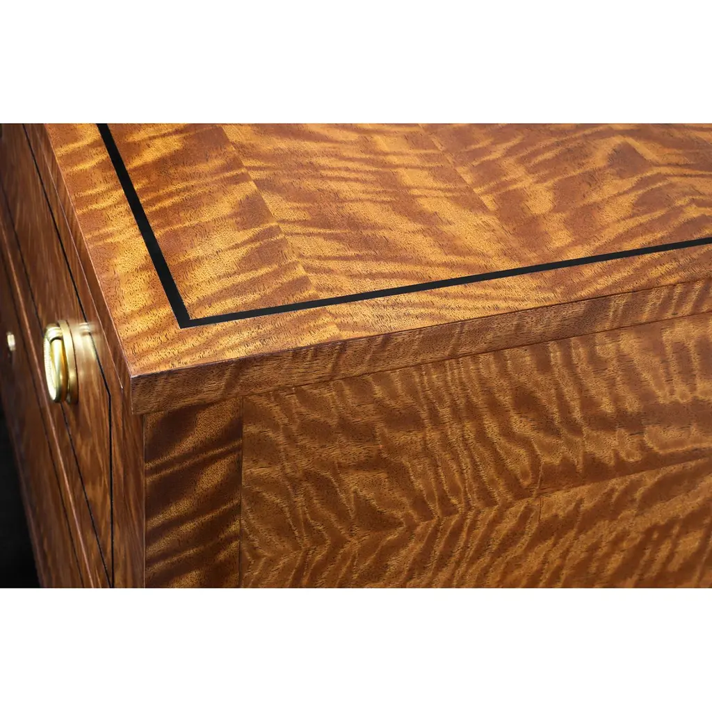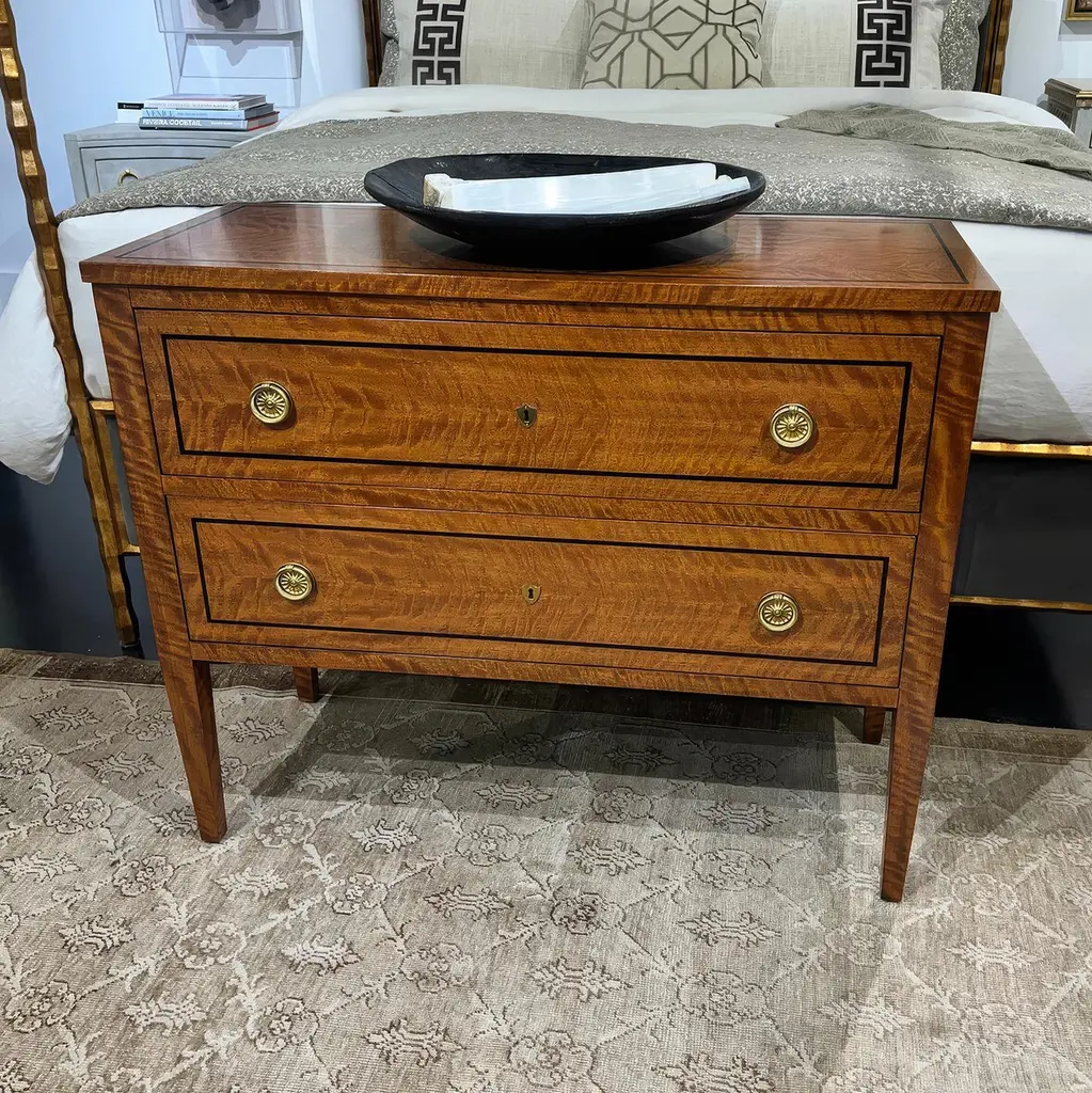 Crafted from exotic figured movingui veneer with refined black line inlays, this luxurious chest exemplifies timeless sophistication. The oak drawers, equipped with modern soft-close mechanisms, ensure smooth and silent functionality, blending beauty with convenience. Ring pull brass hardware enhances the classic design. Blending classic design with practical features, this commode fits perfectly into any upscale interior. The smooth, polished finish shows off its natural beauty, making it a standout piece for bedrooms, living rooms, or entryways. With two spacious drawers, it provides plenty of storage space while keeping a simple yet elegant style. Dimensions: 44" W x 18.5" D x 36" H