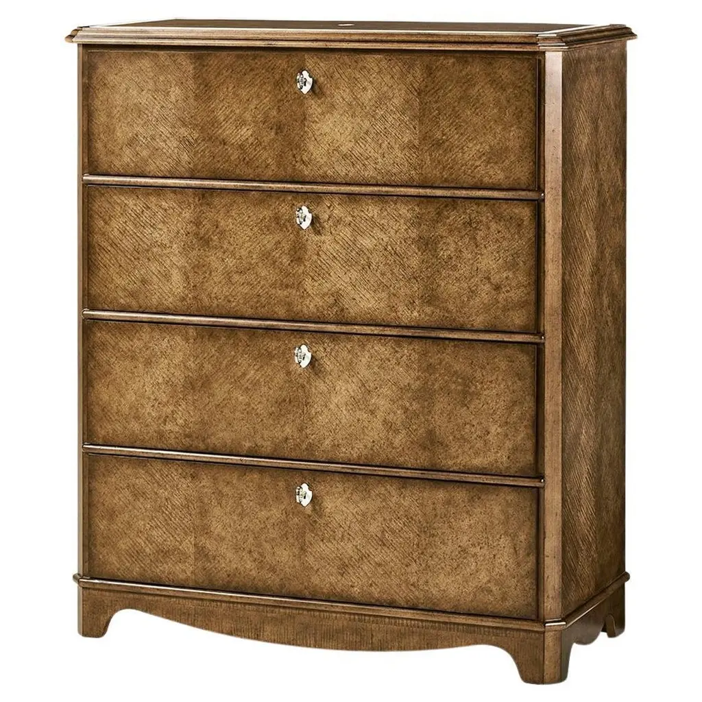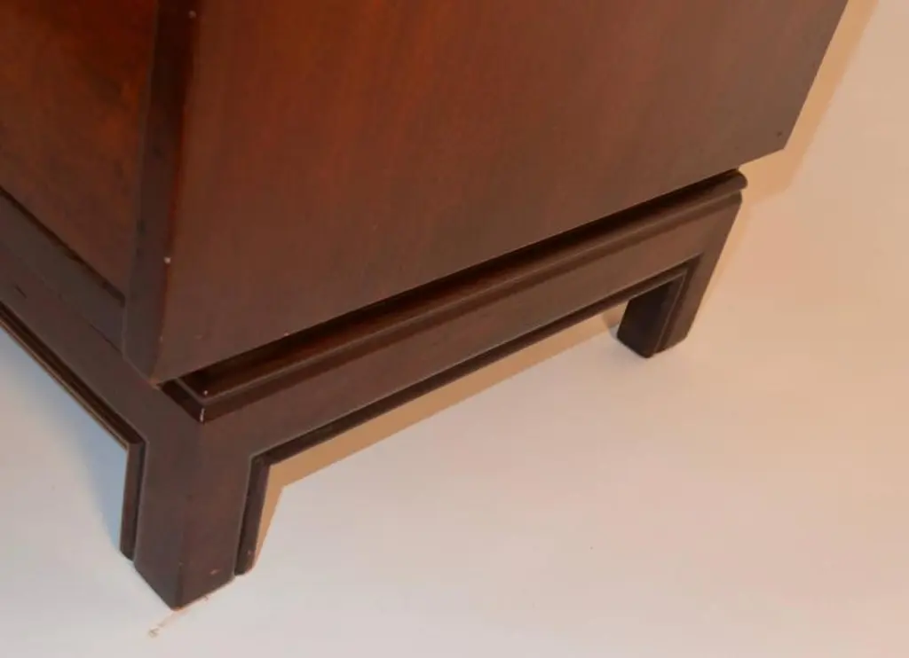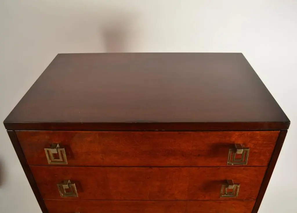 We are offering a matched pair of five-drawer chests designed by Renzo Rutili, for John Stuart. It is unusual and difficult to find a pair of High Boy form chests, however we are willing to separate and sell individually if you only need one.Dark mahogany case, burl drawer fronts. Nice deep drawers, deepest one 10".(bottom drawer). These chests show cosmetic wear, normal and consistent with age, but are structurally sound. Usable as is, or could be refinished to perfection if you prefer. Hollywood Regency, Asia Modern, Art Deco style design, high quality construction, good vintage condition.We are also offering the matching bachelors chest if you are looking for a large set.