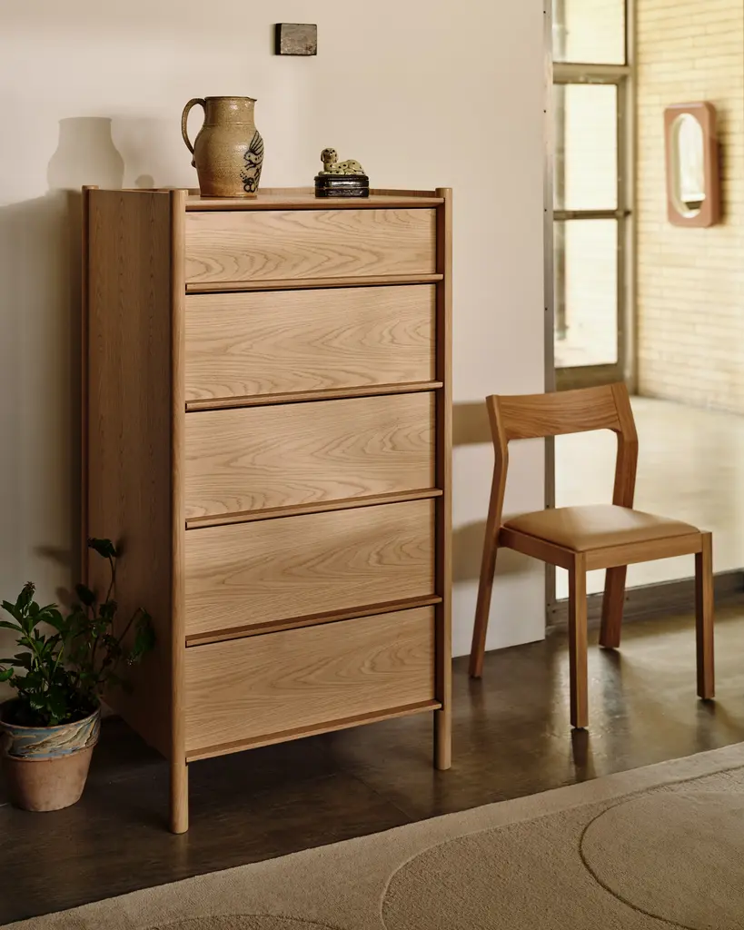 By Studio Böttger, the Pala Dresser (2025) balances refined design with thoughtful functionality to elevate everyday organization and rituals. Two shallow drawers complement four spacious drawers, providing plenty of practical storage. The upper trough offers extra room for the optional mirror as well as small items, while thoughtful cut-outs accommodate clever cable management. Made in Turkey.