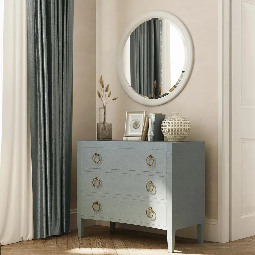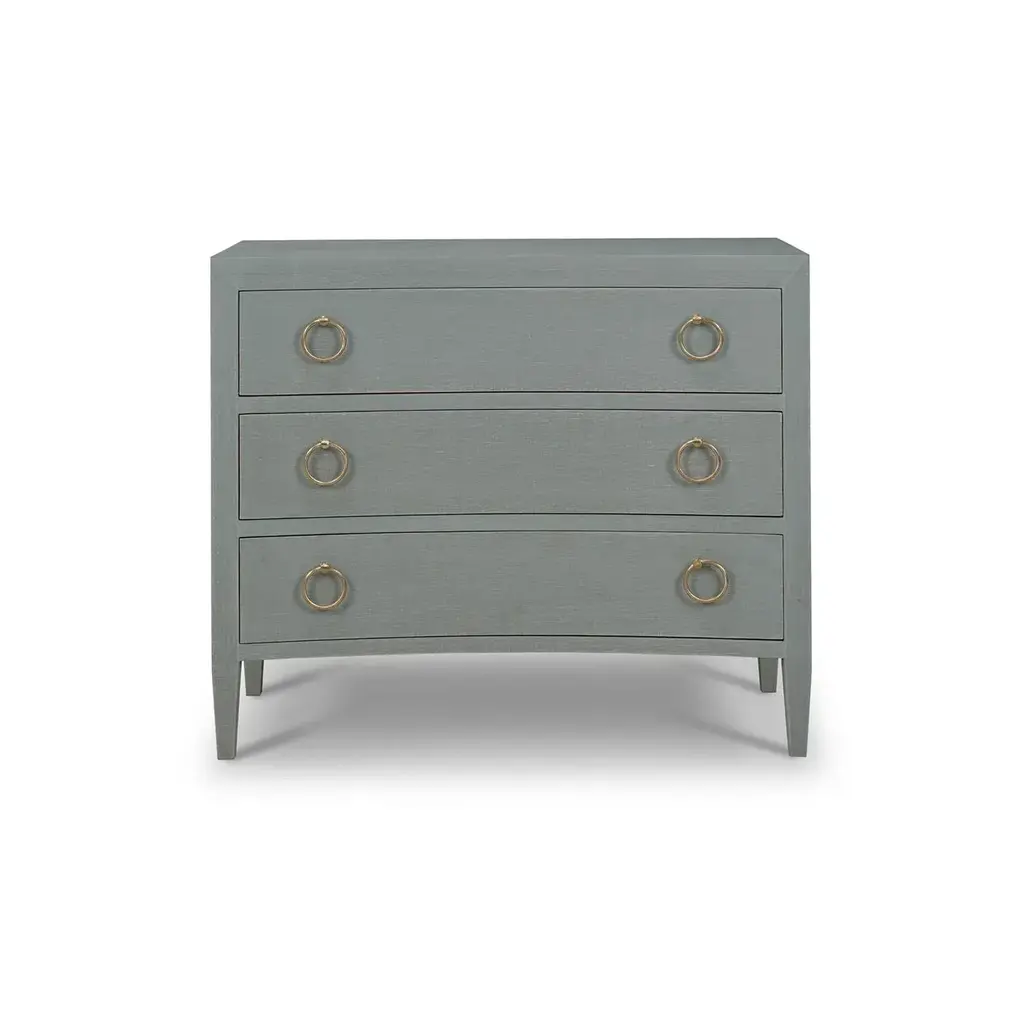 A stylish and sophisticated addition to any contemporary living space. This elegant piece features a sleek, minimalist design wrapped in soft pale blue linen, exuding a calm and serene aesthetic. The subtle texture of the linen finish enhances its modern appeal, while the three spacious drawers provide ample storage for your essentials. Adorned with chic gold ring pulls, this chest effortlessly combines functionality with refined elegance, making it a standout piece in any room. Dimensions: 42" W x 20" D x 36" H