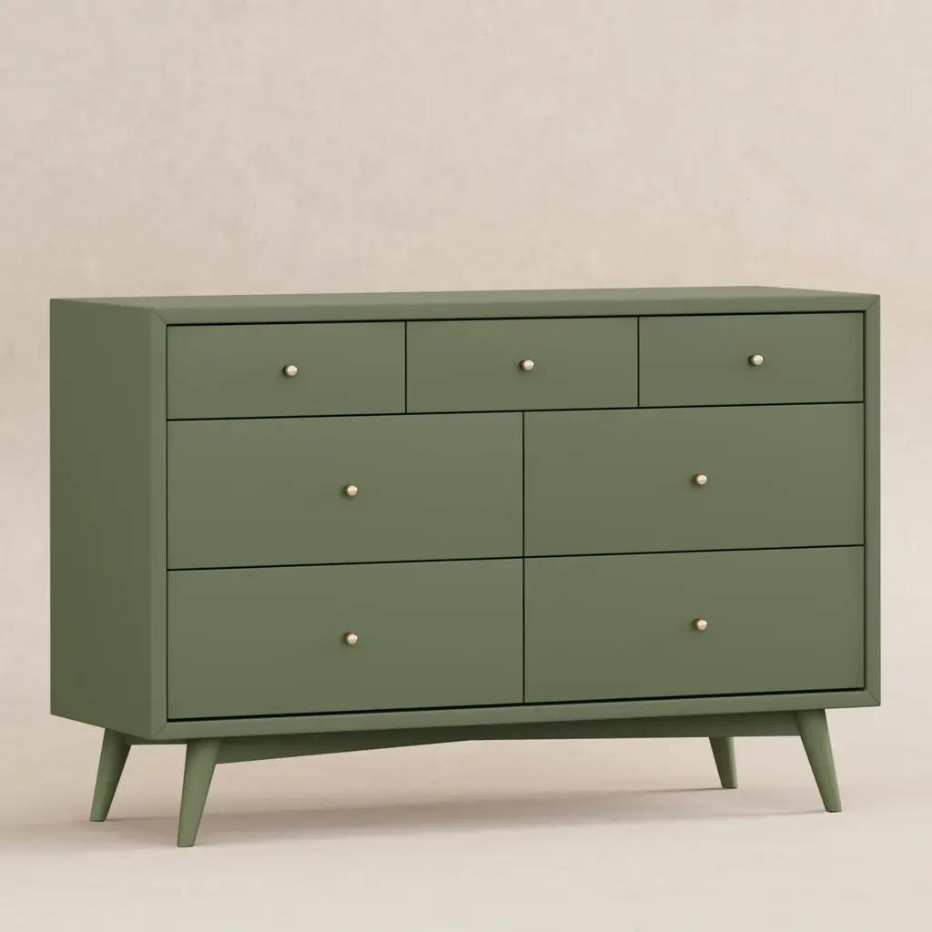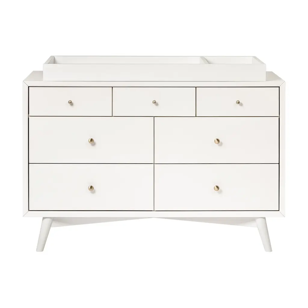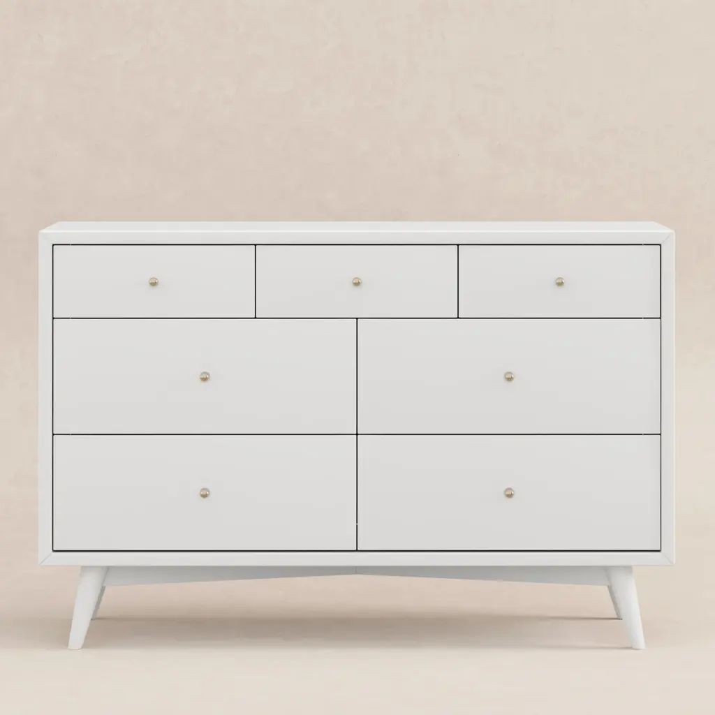 Elevate your little one's sleep space with the Palma 7-drawer Double Dresser from Babyletto. Boasting a refined mid-century aesthetic, this double dresser showcases tapered legs, brushed metal hardware, and silent drawers that glide open with ease. Its versatile design offers substantial storage with three top drawers and four large bottom drawers, ready to hold babe's daily essentials, keeping your space clean and clutter-free. Highlights