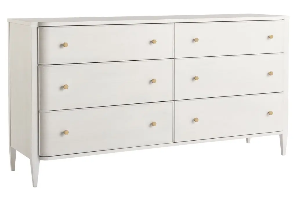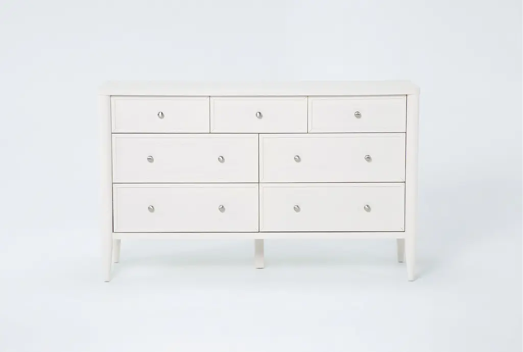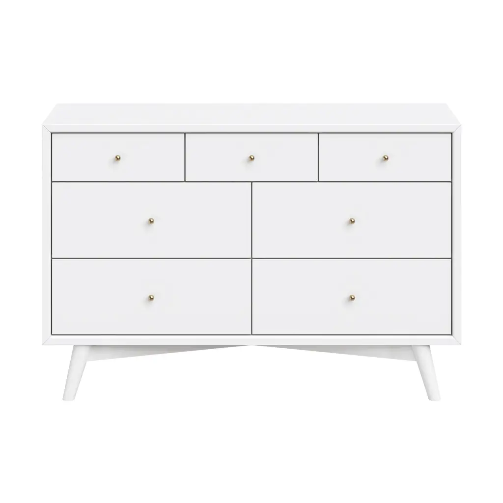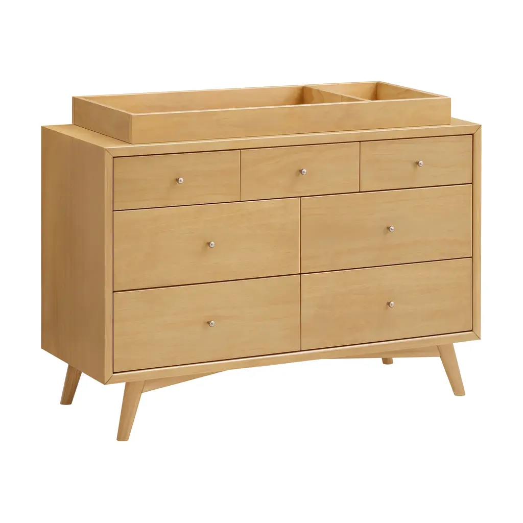 Elevate your little one's sleep space with the Palma 7-drawer Double Dresser from Babyletto. Boasting a refined mid-century aesthetic, this double dresser showcases tapered legs, brushed metal hardware, and silent drawers that glide open with ease. Its versatile design offers substantial storage with three top drawers and four large bottom drawers, ready to hold babe's daily essentials, keeping your space clean and clutter-free. Highlights