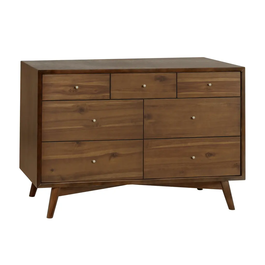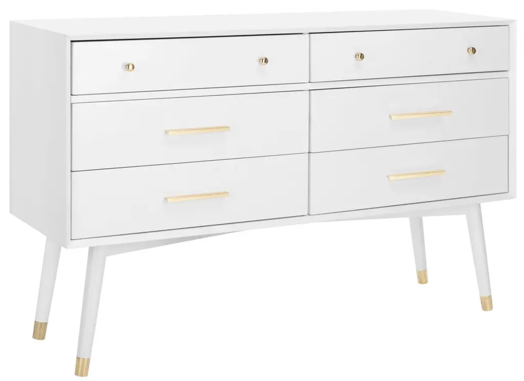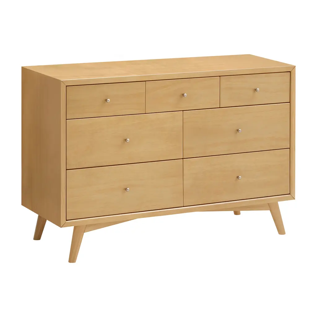 Elevate your little one's sleep space with the Palma 7-drawer Double Dresser from Babyletto. Boasting a refined mid-century aesthetic, this double dresser showcases tapered legs, brushed metal hardware, and silent drawers that glide open with ease. Its versatile design offers substantial storage with three top drawers and four large bottom drawers, ready to hold babe's daily essentials, keeping your space clean and clutter-free. Highlights