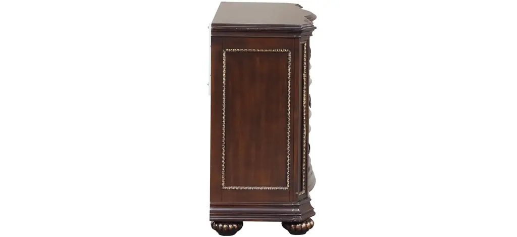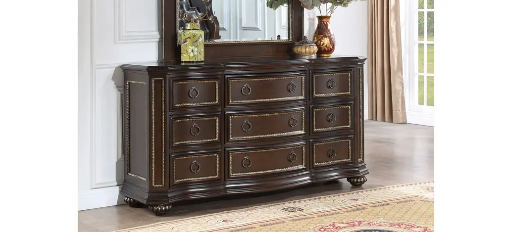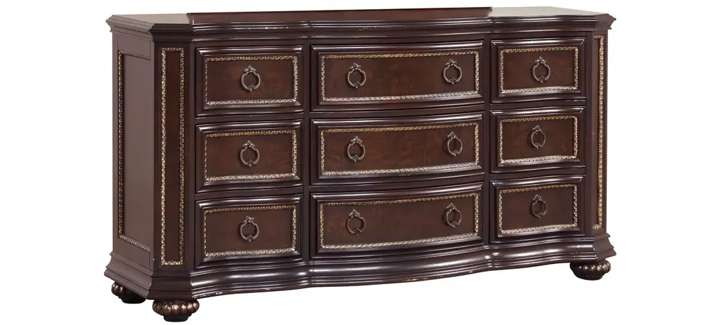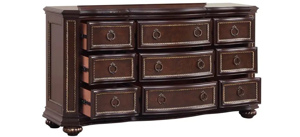 the Paris 9 Drawer Dresser features real wood veneers and is finished in a deep cherry. The drawer fronts feature deep grain wood panels surrounded by gold hand painted beadwork trim . Smooth drawer operation with side mounted ball bearing drawers that include velvet lining on the top drawer.