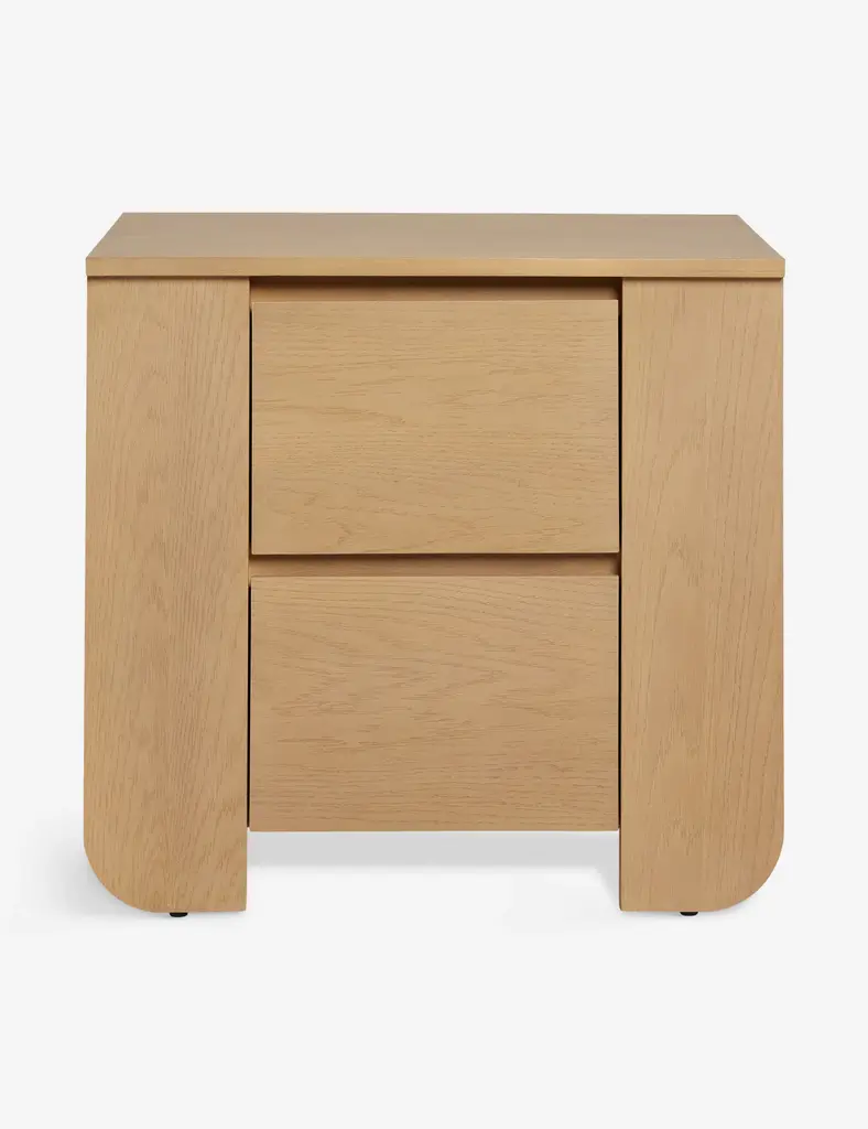 This streamlined piece features two spacious drawers complemented by open shelving for a beautiful blend of hidden and visual storage. Its natural bleached white oak finish lends simple elegance, further elevated by brass hardware and petite leg accents. Style a pair around a bed for a tasteful design.