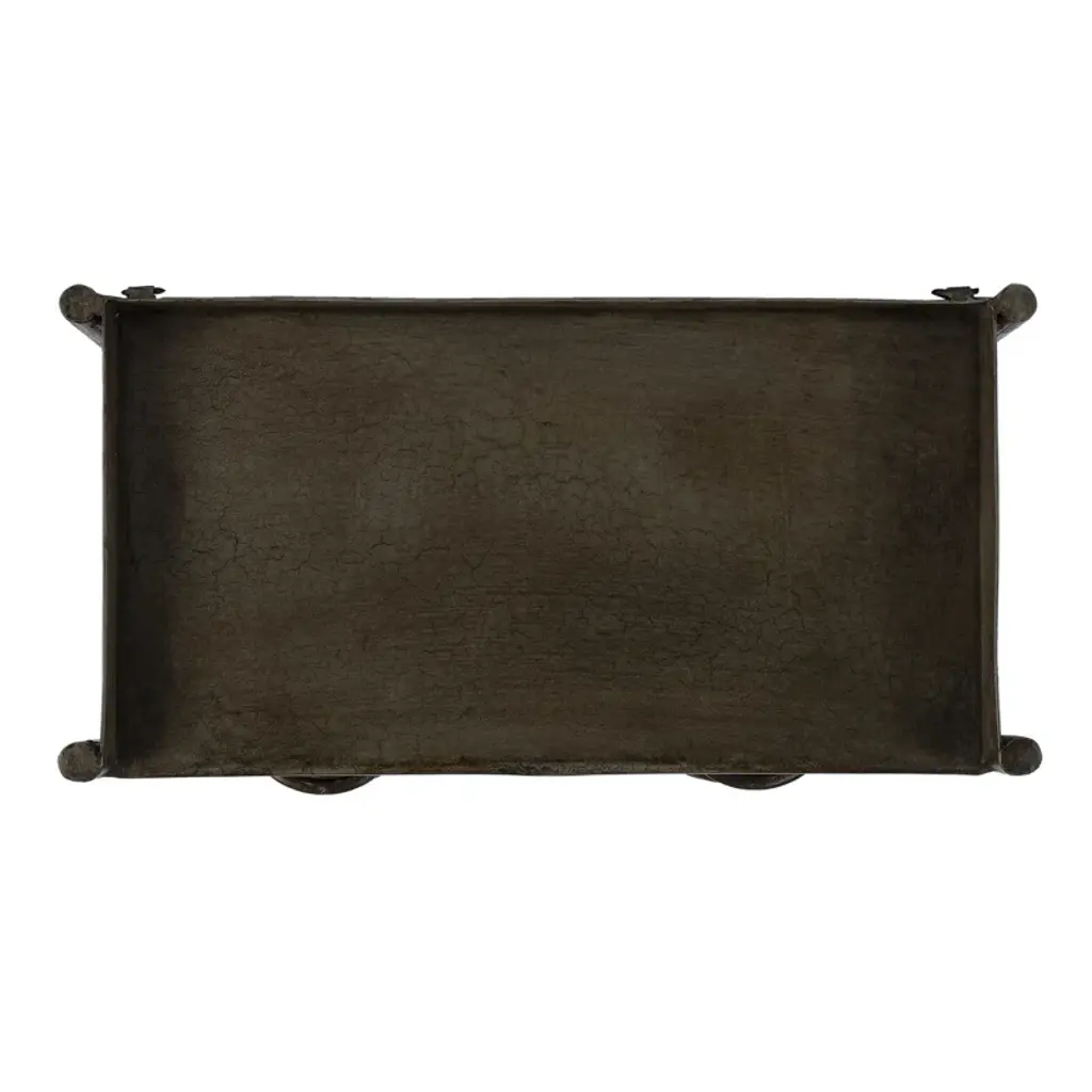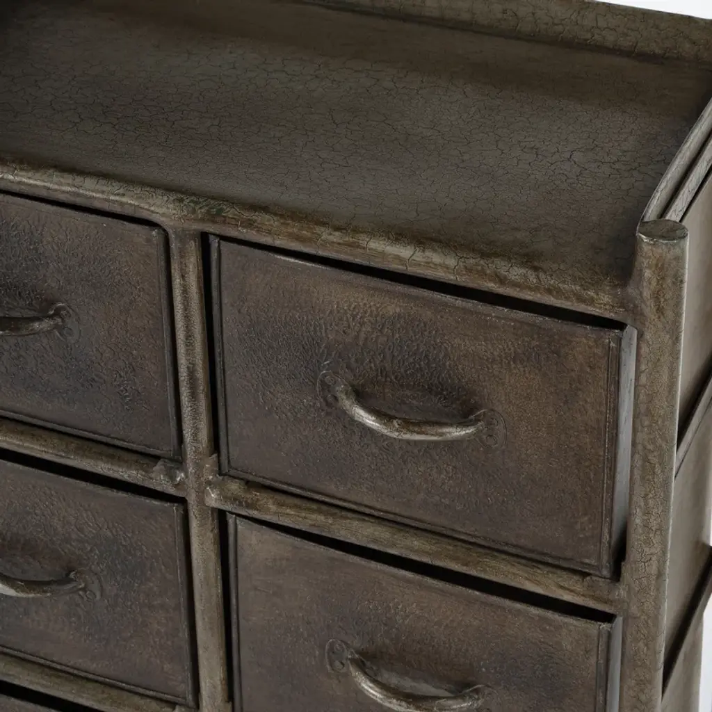 With its aged bronze finish, this accent cabinet offers a timeless look and feel that complements spaces of all sorts. It's made from iron with an apothecary-style look and feel in the form of six slim drawers set within the tubular frame. Up top, the lipped table helps ensure that nothing rolls off the back or sides. We especially love the matching bronze drawer pulls, which complement the crackle details on the front of each drawer to add to the vintage vibes of this seventeenth-century-inspired chest.