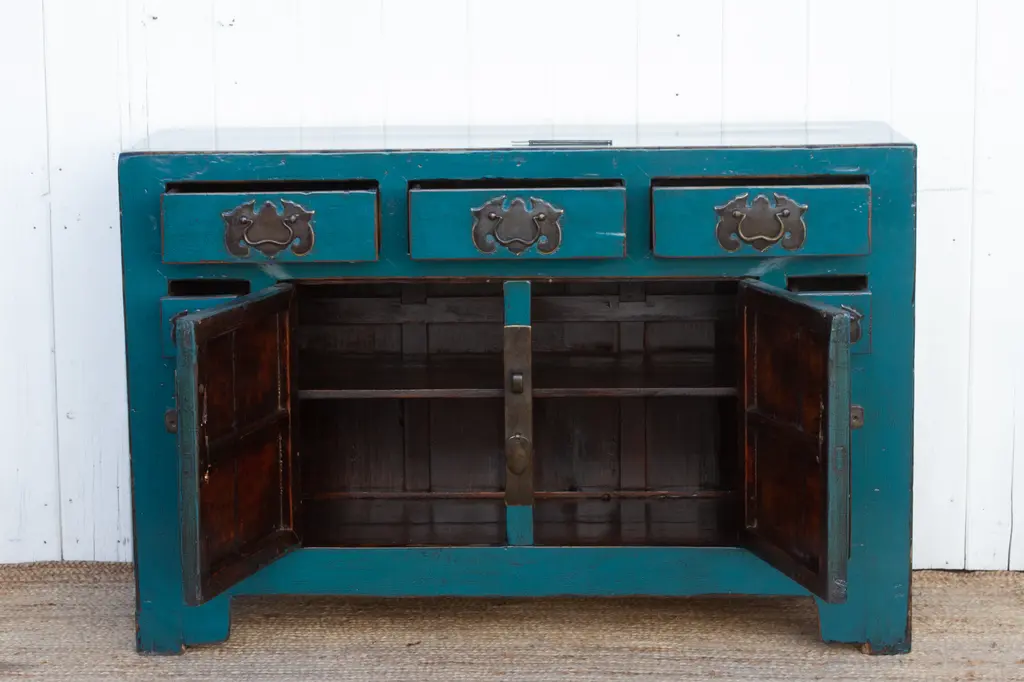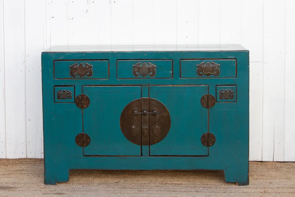 This breathtaking Chinese elm credenza whispers stories of the Qing Dynasty. Handcrafted from solid elmwood, it exudes a commanding presence, a testament to the enduring skill of its makers. This antique Chinese Buffet cabinet has an unusual storage setup with 2 center doors, 2 smaller side doors and five drawers above. The rich royal blue lacquer finish has graced with a captivating patina.