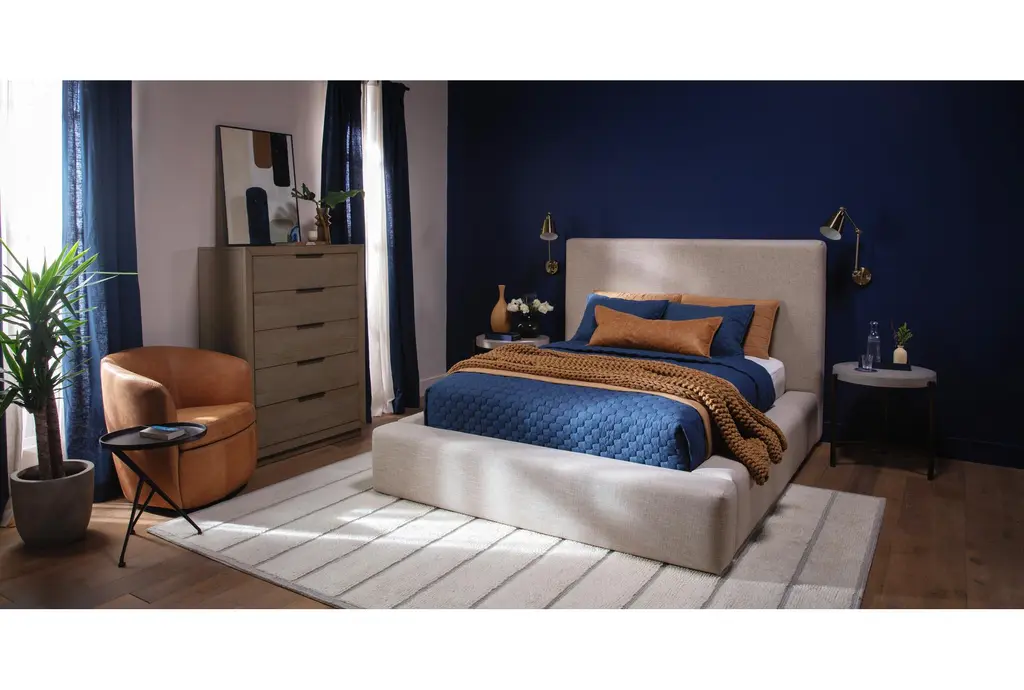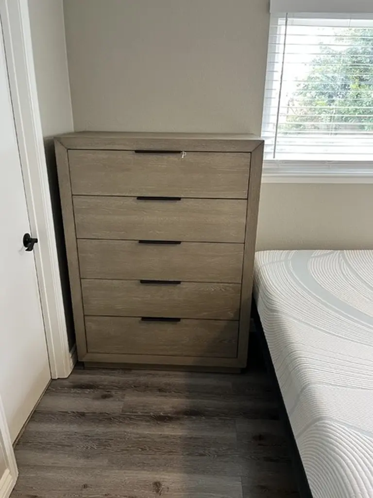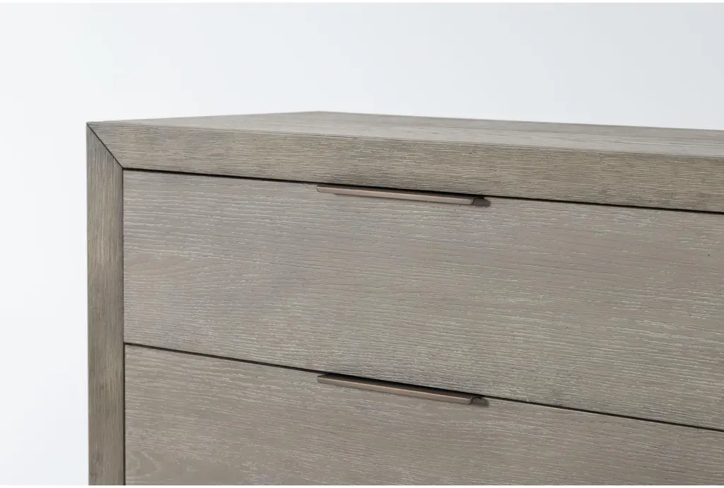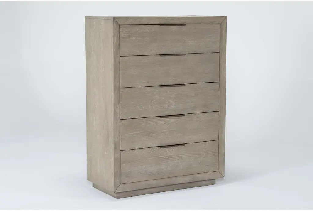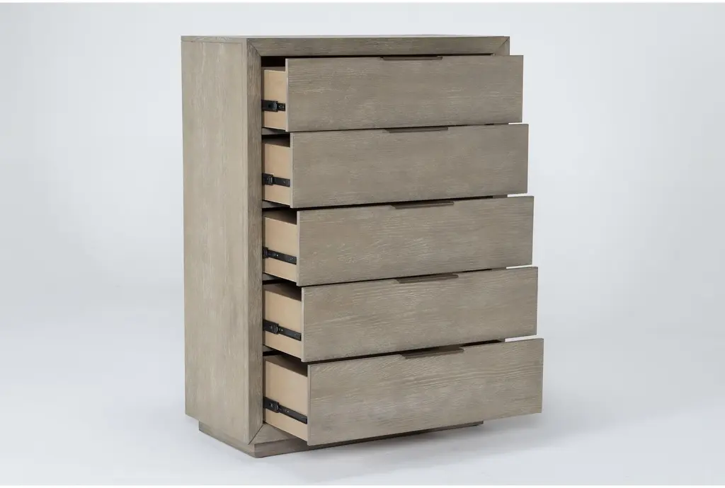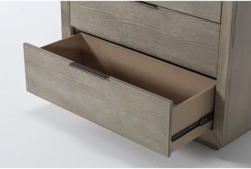 Bring bold minimalism and high function to your personal retreat with our Pierce chest of drawers. From clean, strong lines, to a contemporary color, this design has it all at an unbelievable value. Hardwood and oak veneer instill strength and character, which comes through distinctly in the wood grain. The streamlined, boxy profile is also balanced by thin metal handles and a natural finish. You will love having this chest of drawers in your bedroom.