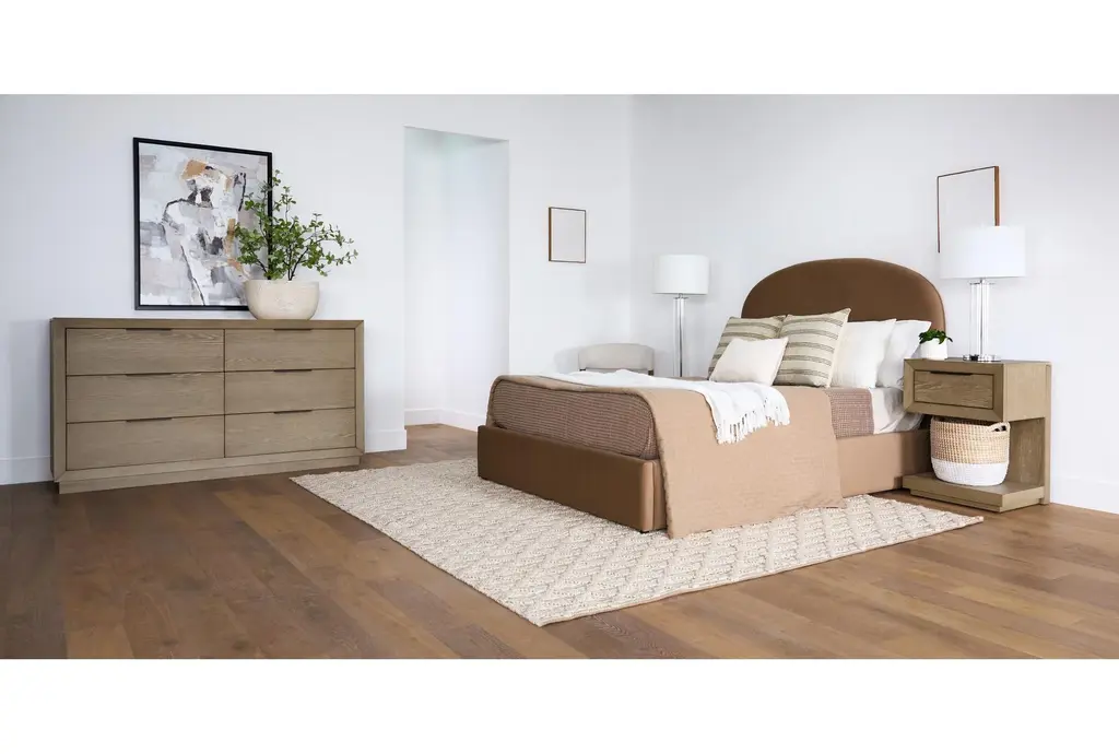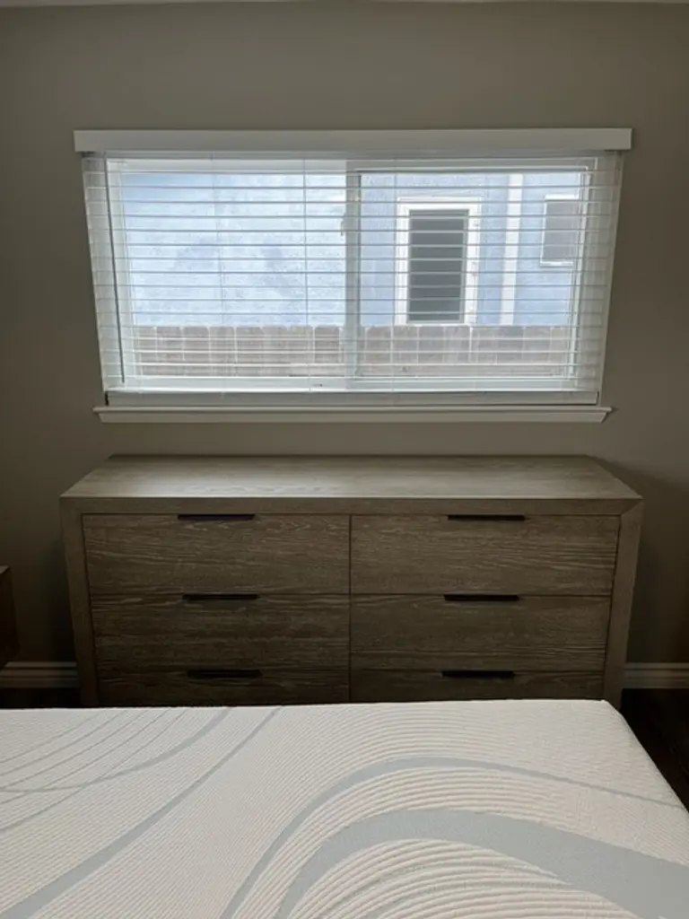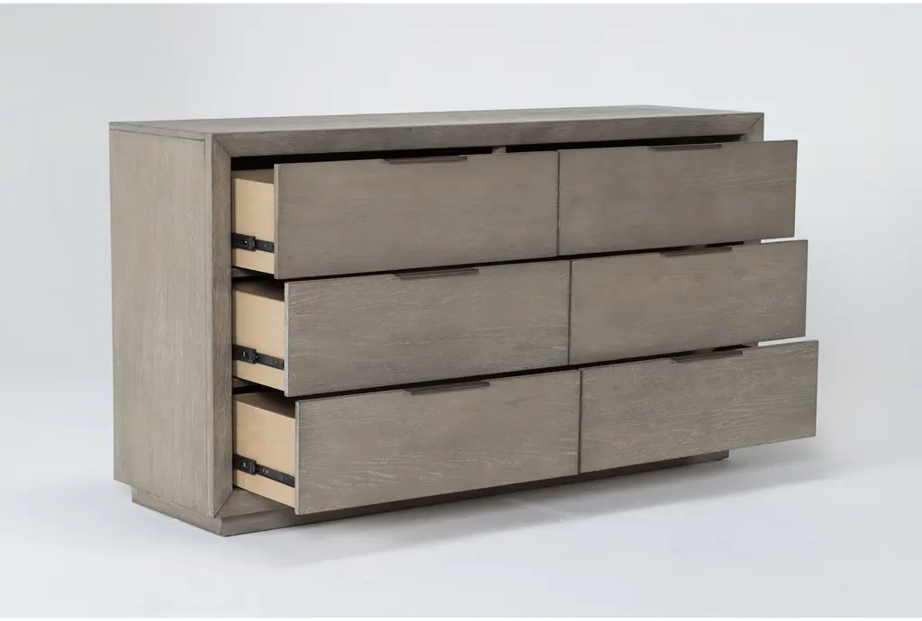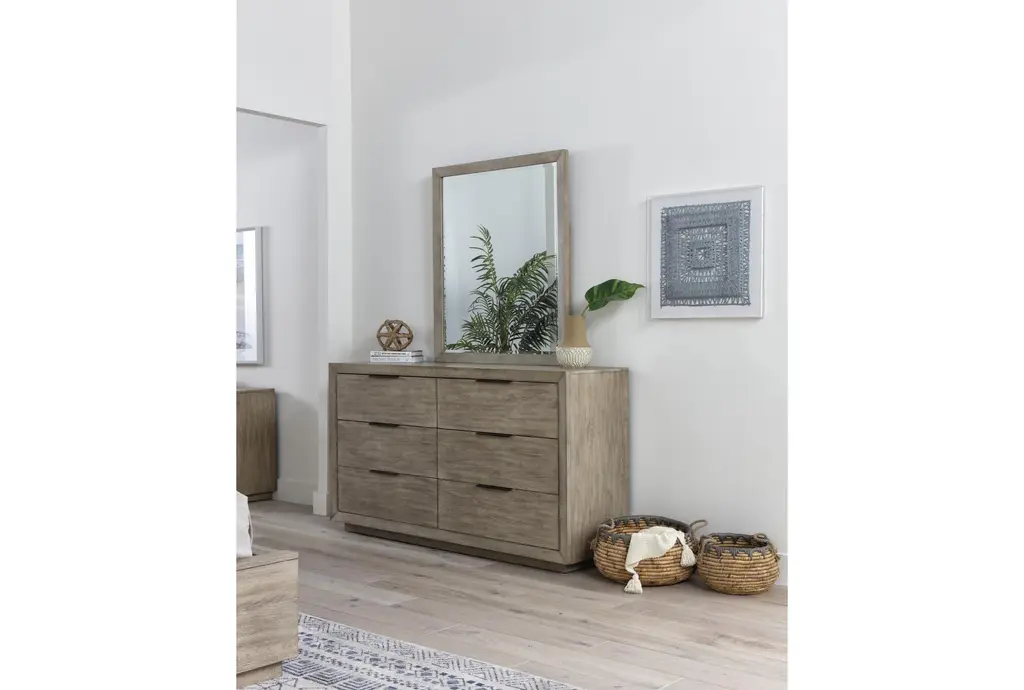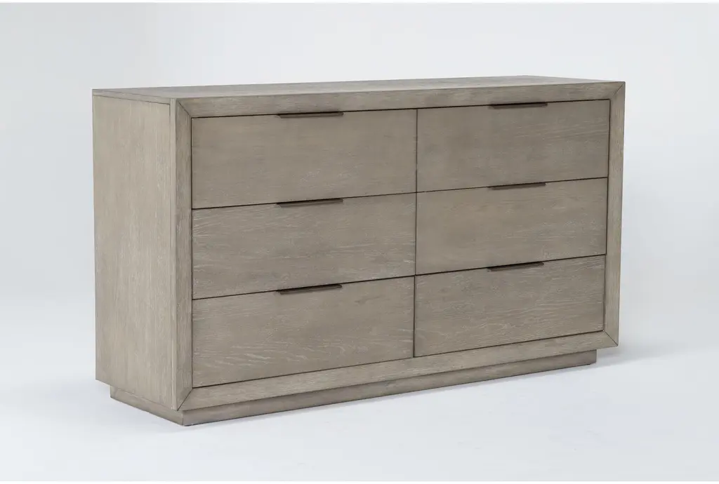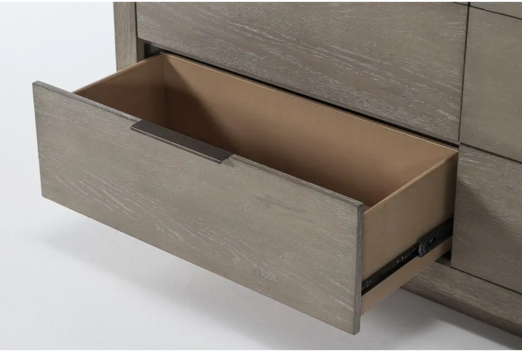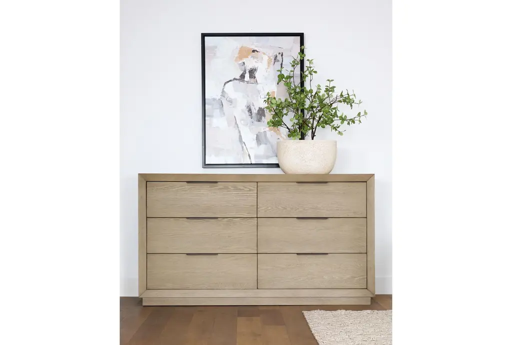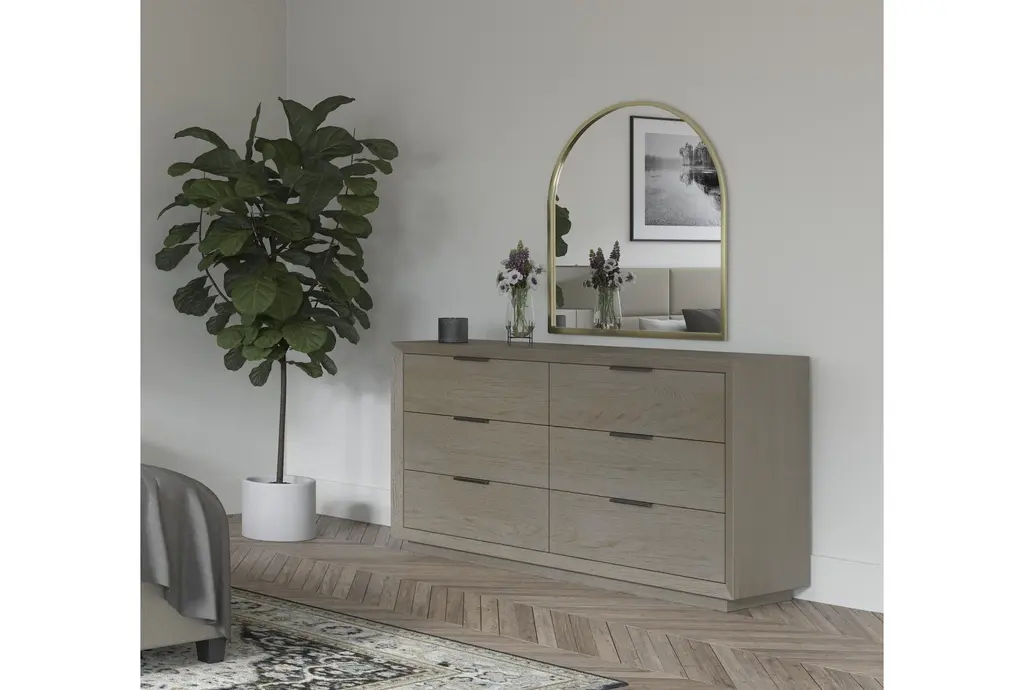 The Pierce Natural Wood Tall 38" 6 Drawer Dresser is the perfect addition to any modern bedroom. Made from a combination of oak veneer and solid rubberwood, this dresser offers durability and a sleek, natural grey finish. With six spacious drawers, it provides ample storage space while maintaining a stylish, minimalistic design.