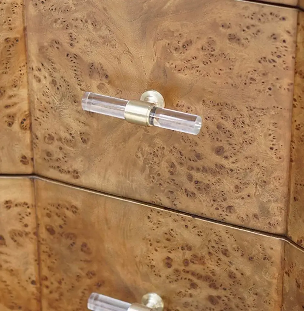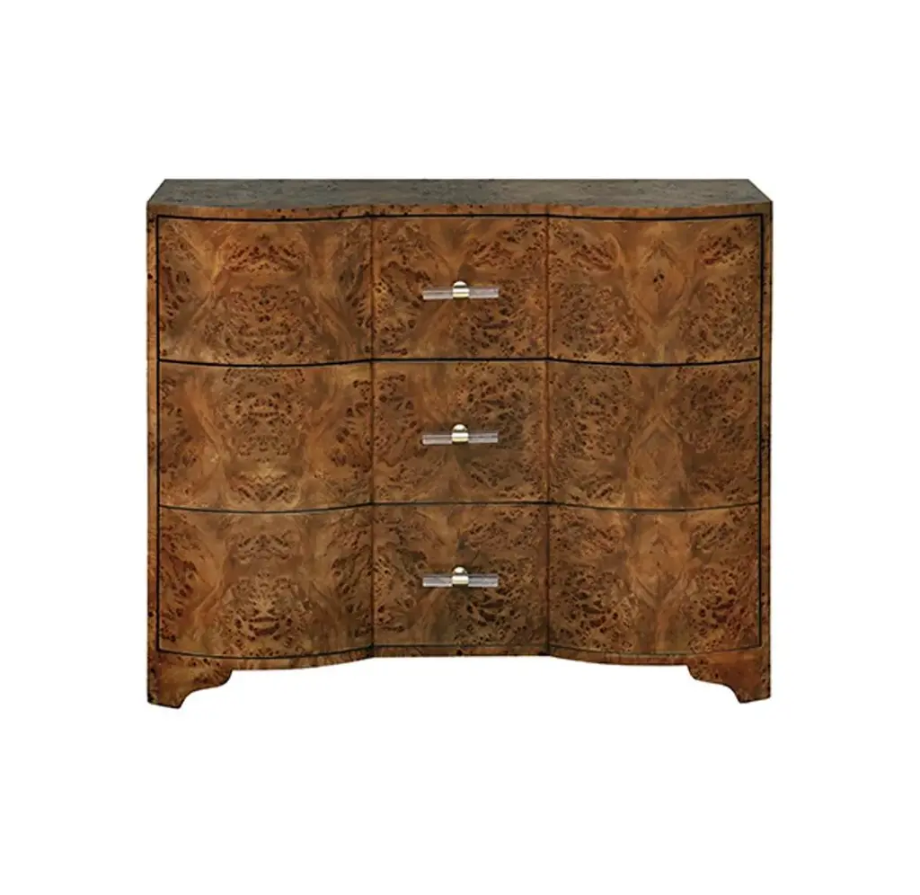 New item. Not vintage. Our stunning Plymouth three drawer chest is a modern heirloom in the making! Distinctive, serpentine profile is dressed in exquisite, matte dark burl finish and accented with acrylic cylinder & brass hardware. Three generously scaled drawers make Plymouth an elegant storage solution for any interior. 42" W X 34" H X 18" D *Burl wood has natural variations and may differ slightly between panels. Width: 42.00" Height: 34.00" Depth: 18.00"
