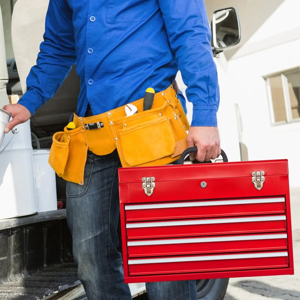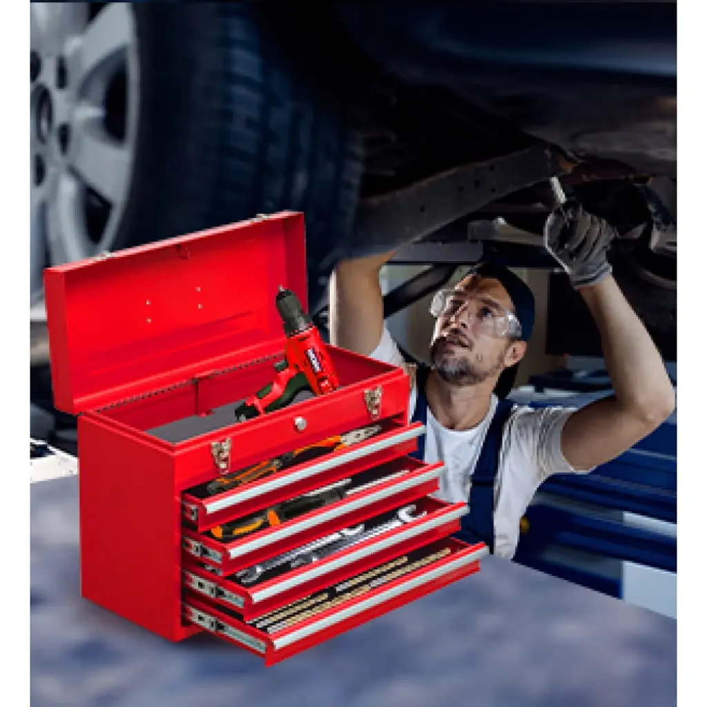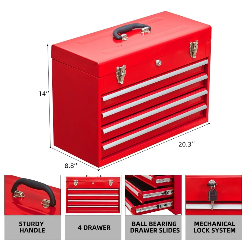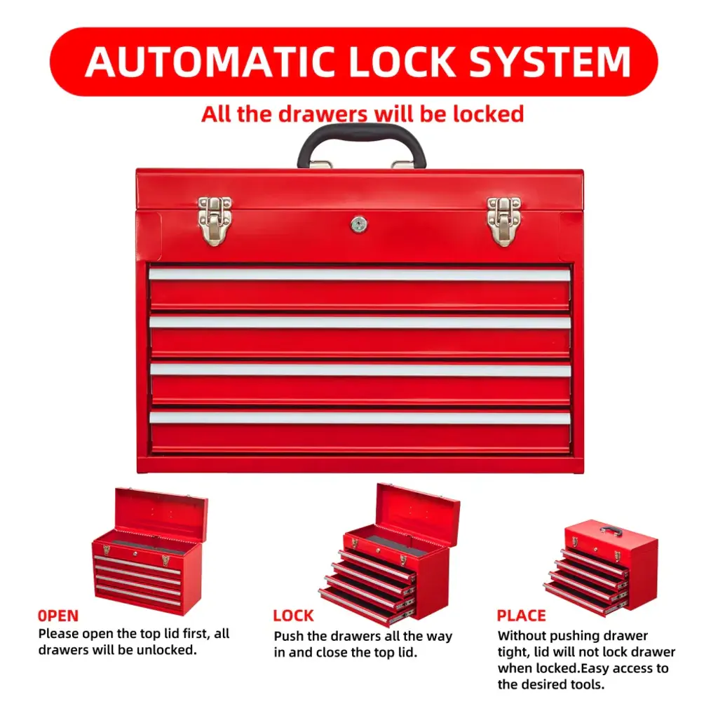 20'' Metal Tool Box, Portable Steel Tool Chest with two Latches Closure and one cylinder Lock for Garage, Home and Workbench, Black and Red two color available. Tool Box is with 4 Drawer and one deep top box, flexible for tool organizer in home, Garage, warehouse even office. With a comfortable plastics handle offers a good grip that allows you to carry the toolbox organizer easily.
