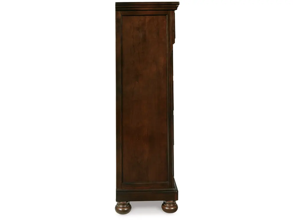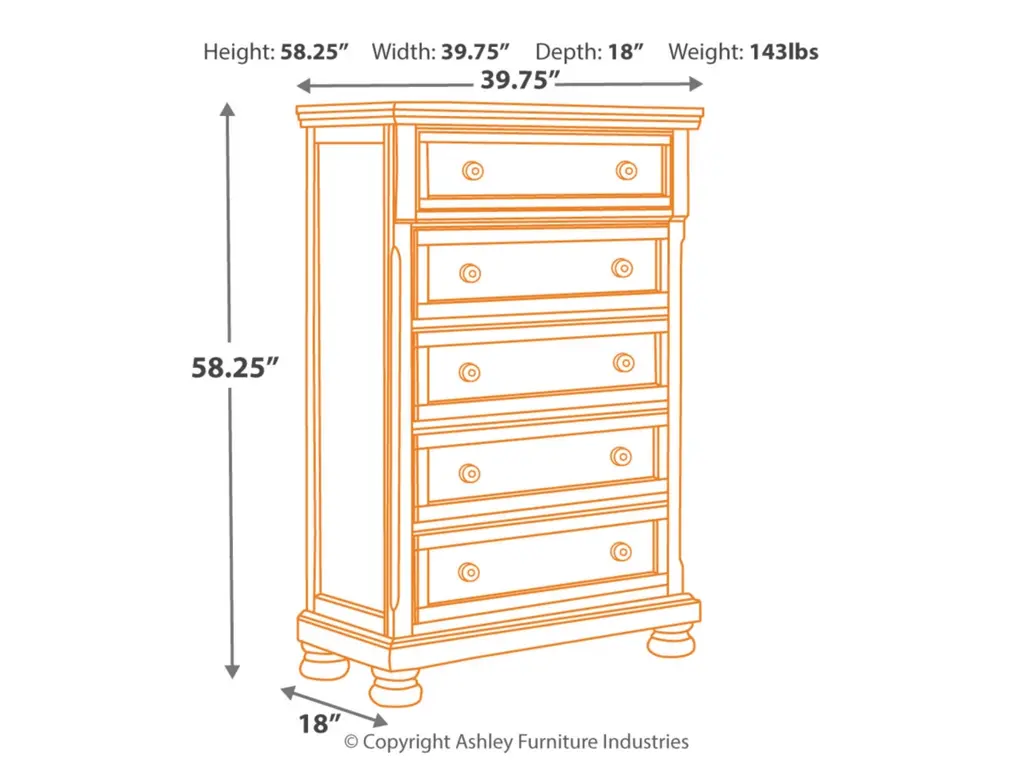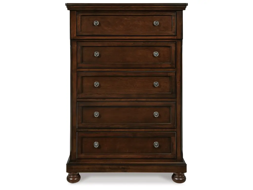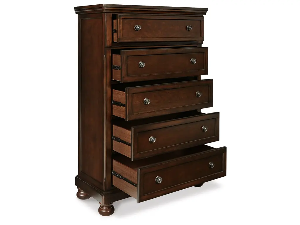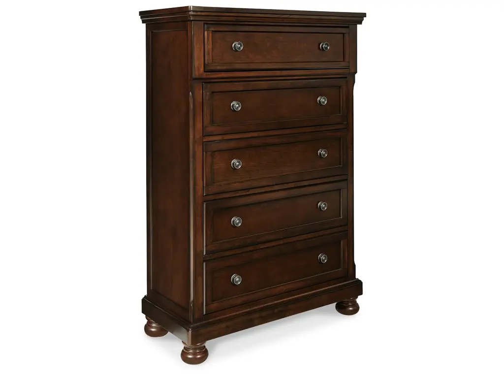 The quality craftsmanship is clear to see. The classic design elements—including antiqued hardware and bun feet—are easy to love. Satisfying your taste for traditional furnishings, the Porter chest of drawers is elegant without looking fussy. Five roomy drawers keep your wardrobe organized in style.