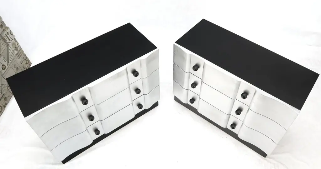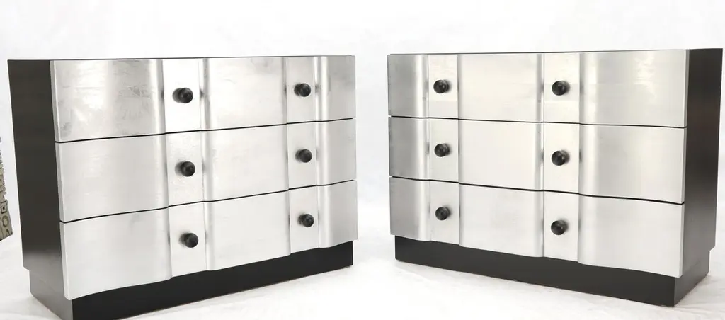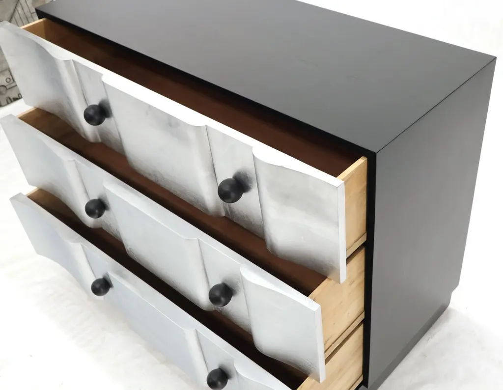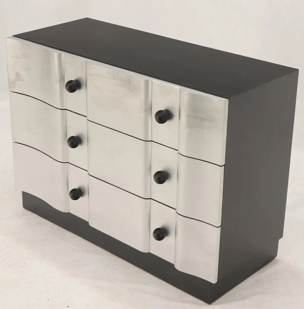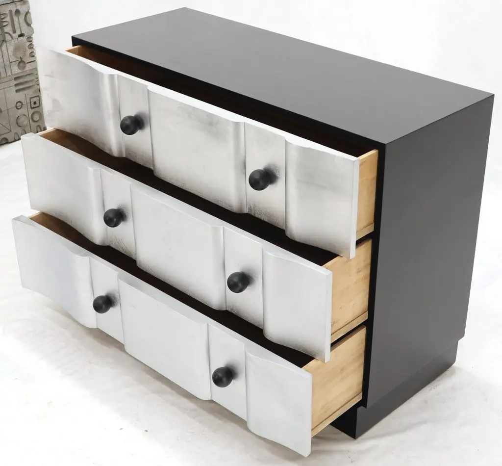 Pair of Mid-Century Modern decorator signed dressers or bachelor chests by James Mont.Silver drawer fronts with large ball shape pulls. Heavy solid birch waved shape block drawer fronts. Black lacquer and silver two-tone finish.