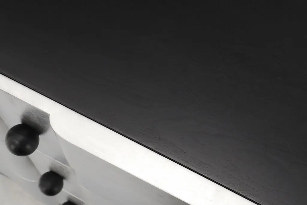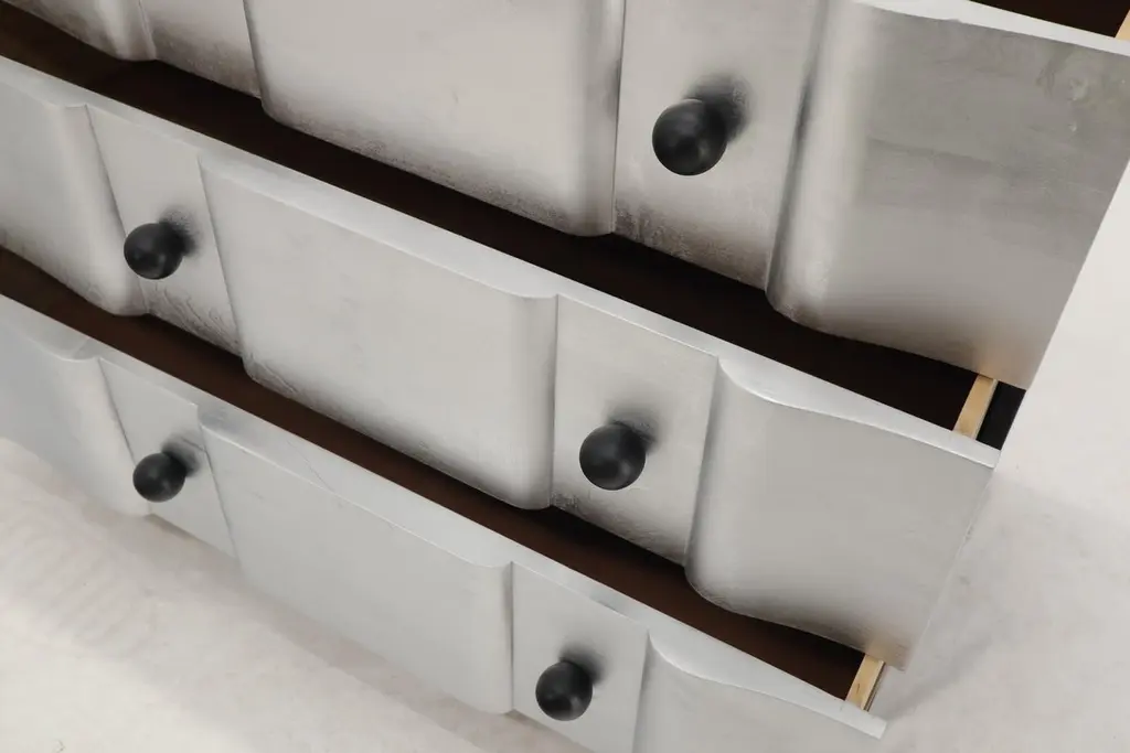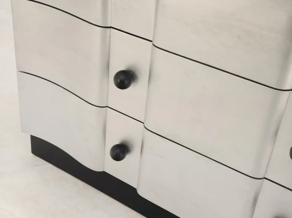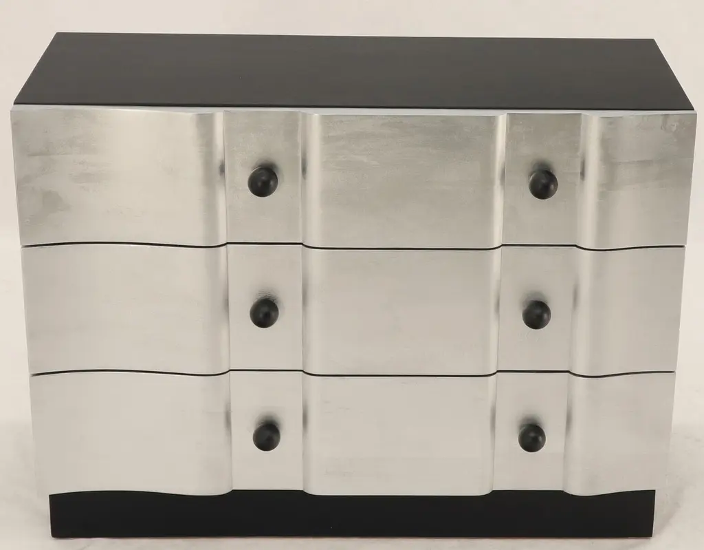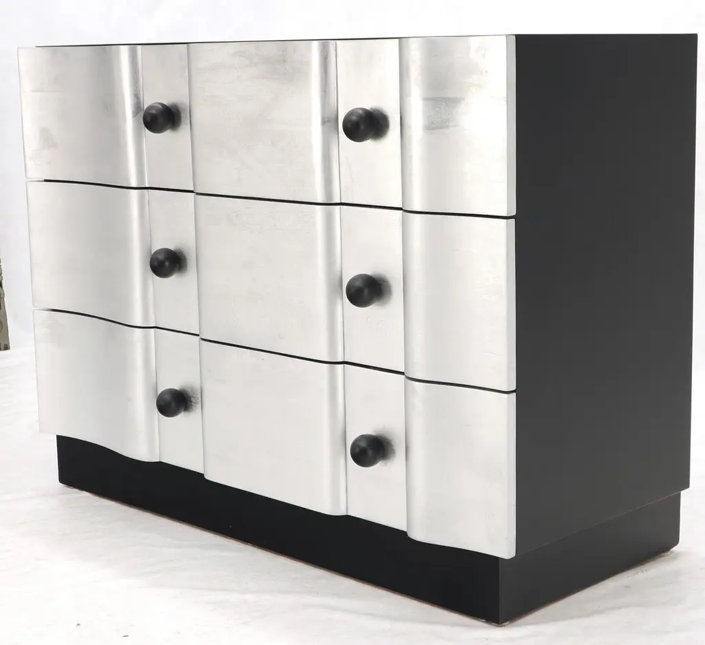 Pair of Mid-Century Modern decorator signed dressers or bachelor chests by James Mont.Silver drawer fronts with large ball shape pulls. Heavy solid birch waved shape block drawer fronts. Black lacquer and silver two-tone finish.