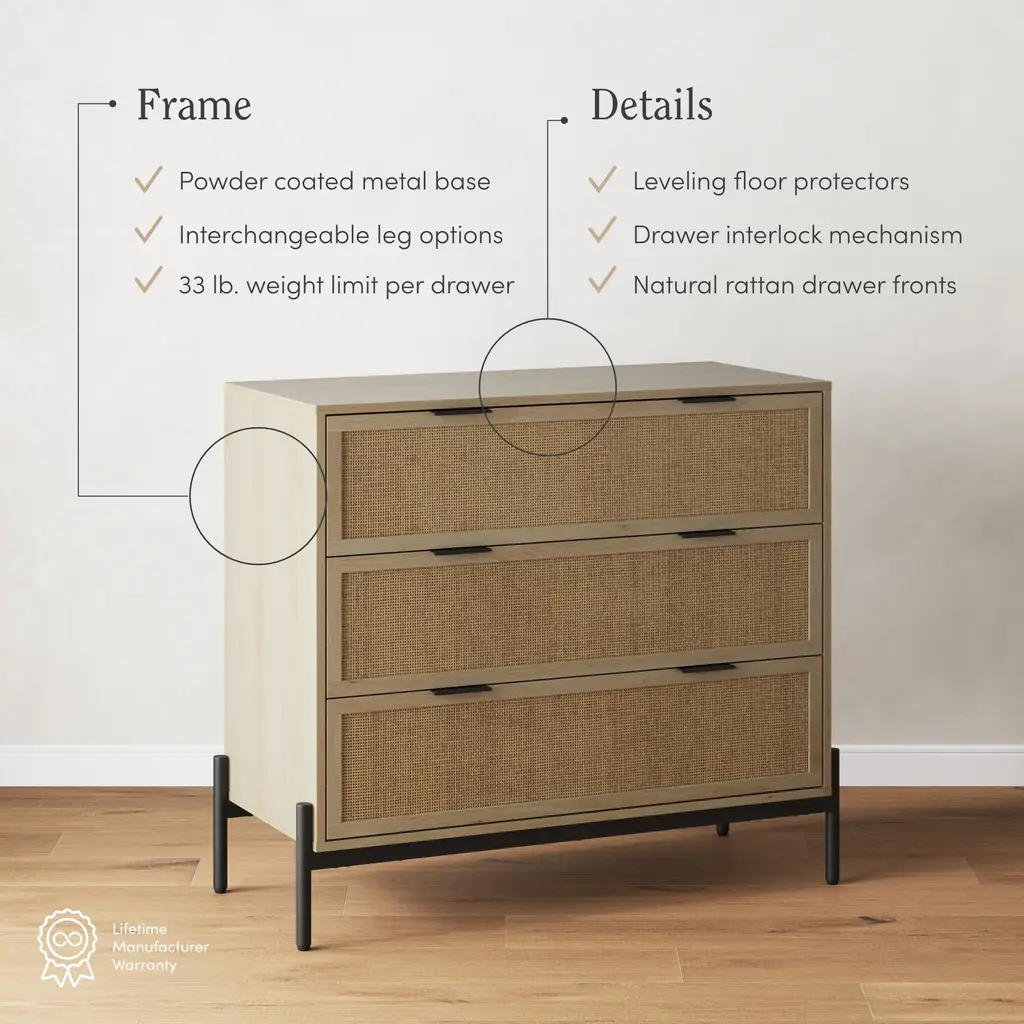 Rattan & Wood 3-Drawer Dresser Light Oak