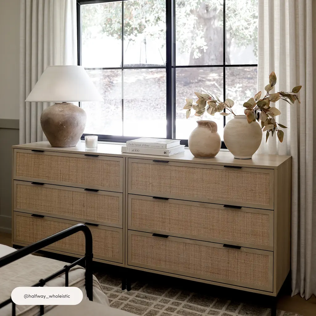 Get ready to fall in love with the Andrew Dresser—a piece that's as unique and captivating as your personal style. With three spacious drawers that smoothly glide on sturdy metal slides, staying organized has never been this easy. Our unique drawer interlock safety mechanism ensures safety by allowing only one drawer to be open at a time, preventing any tipping hazards. With interchangeable leg options, this dresser allows you to place multiple side-by-side and have them sit flush against each other, providing endless design possibilities. Embrace bohemian charm and make your home uniquely yours with the Andrew Dresser!
