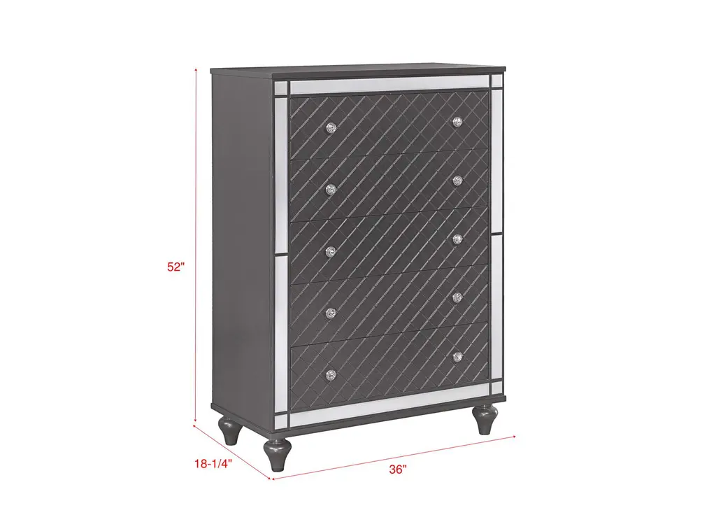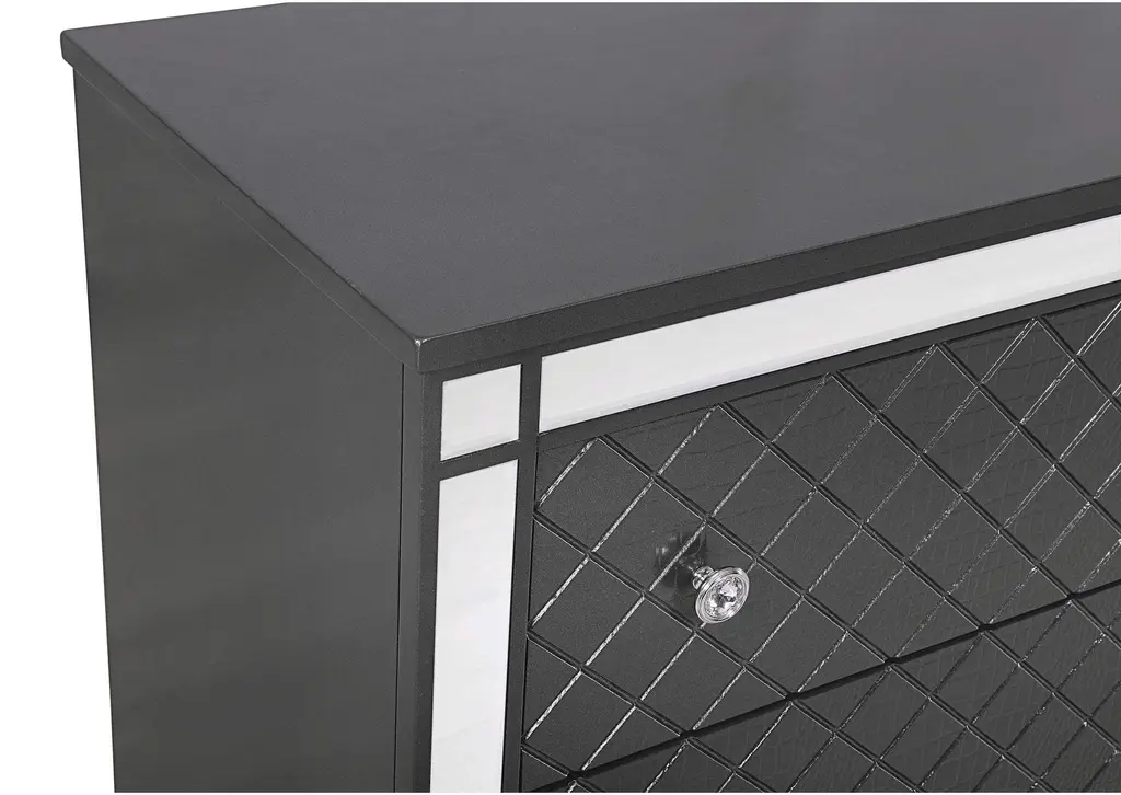 Elevate your sanctuary with this dazzling bedroom collection, where contemporary chic meets timeless charm. The suite boasts a stunning graphite finish, imbuing your space with an air of sophistication and modern luxury. At the heart lies a plush, tufted bed that invites you to indulge in comfort, highlighted by integrated LED lighting. Ample storage solutions are provided through sleek, lined dressers and nightstands, where functionality meets finesse. Weight 180.400 lbs. (81.18kgs.)