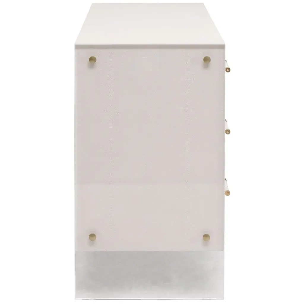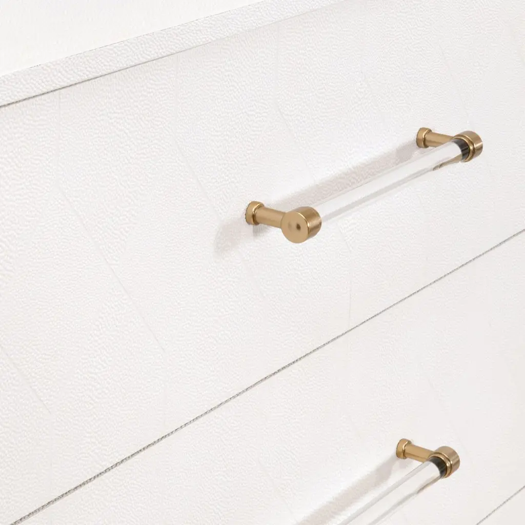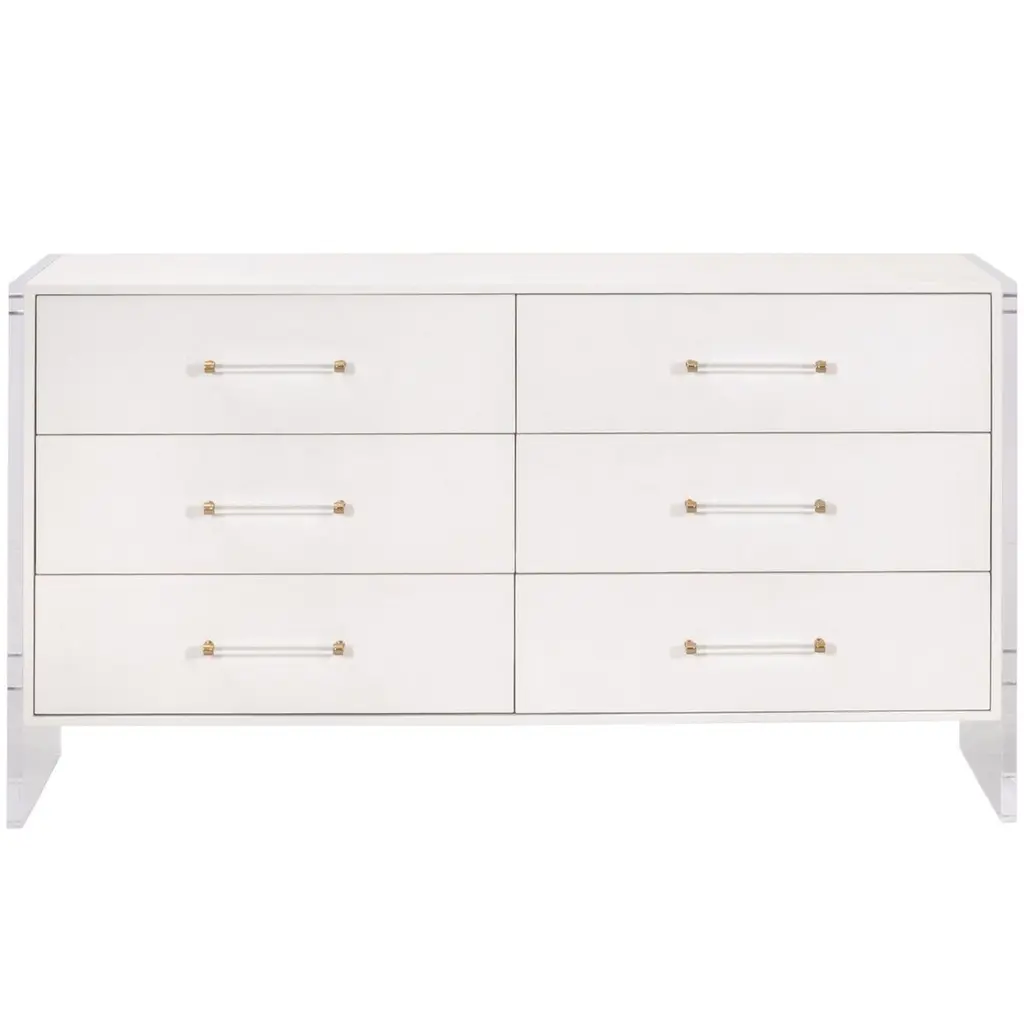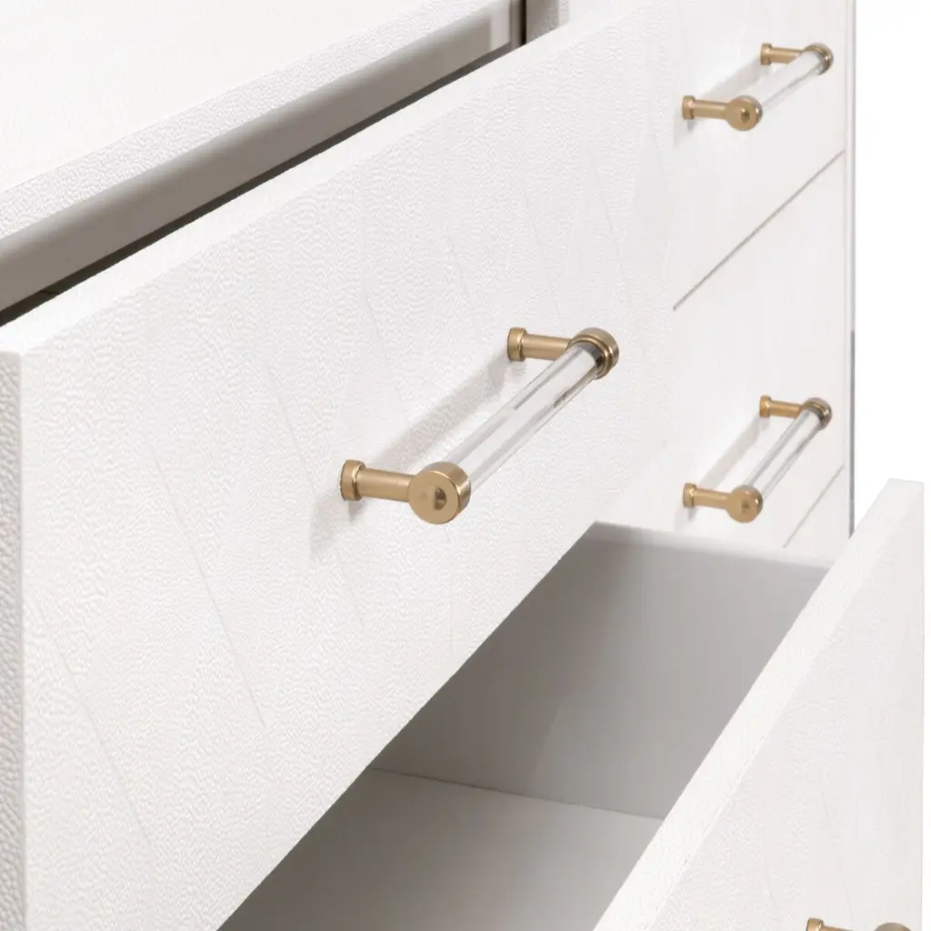 Crafted with a handful of uniquely paired materials, this dresser features a pearl white shagreen resin, rubberwood, beech wood, and clear acrylic. The faux shagreen is made to mimic real stingray skin, which has natural characteristics in color and texture. The drawer fronts feature a subtle geometric diamond pattern and clear acrylic handles. With six spacious storage drawers equipped with dual metal ball bearing glides and a hold-in detent to prevent roll-out, this dresser combines functionality and style effortlessly. The clear acrylic panel legs provide a modern twist, creating a harmonious blend of classic and contemporary. Measuring 62.25" wide, 19.5" deep, and 34" high, this double dresser offers ample storage space and is an embodiment of blended styles.