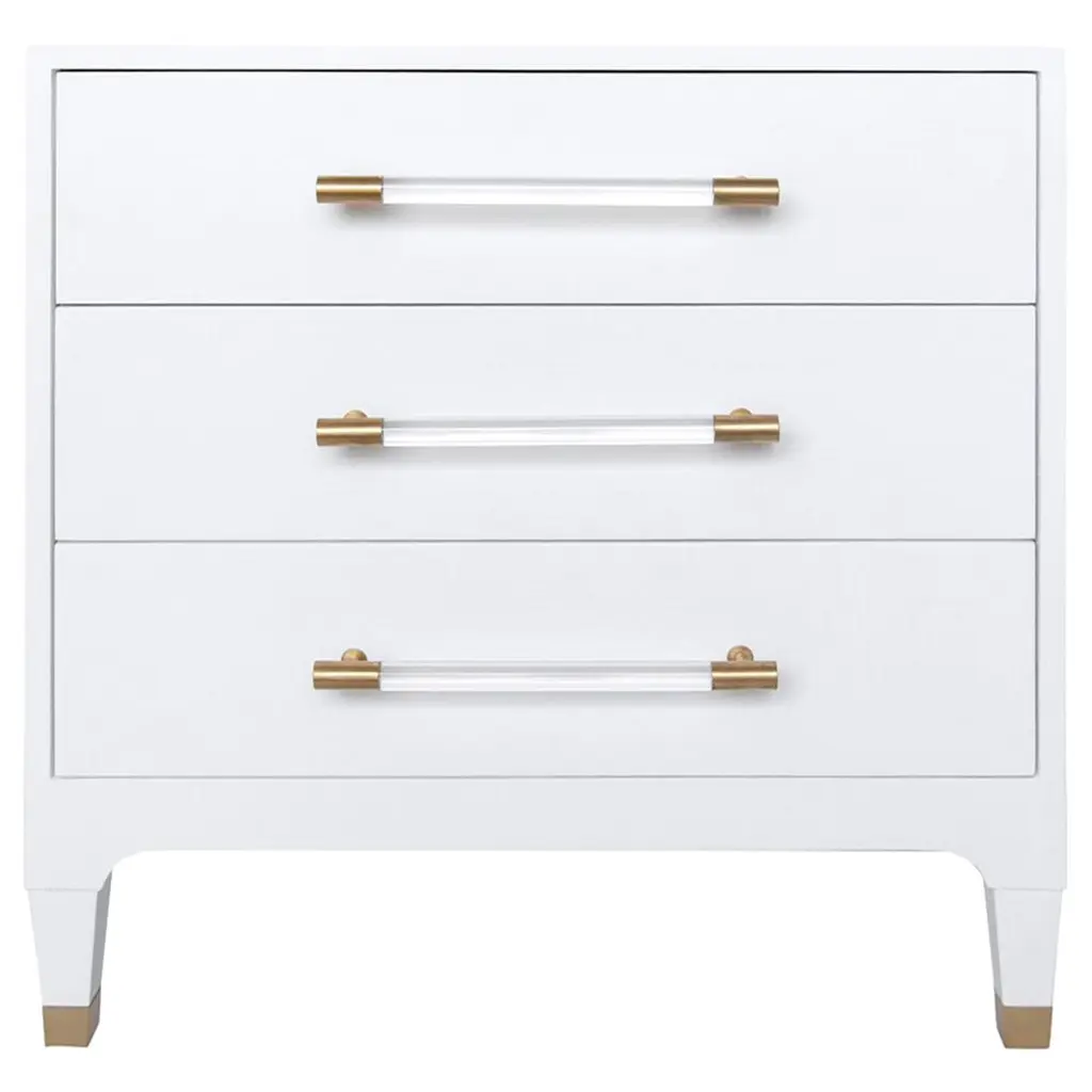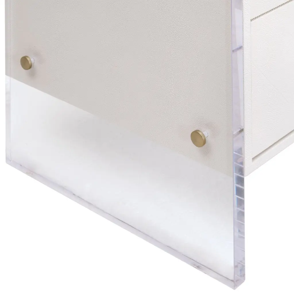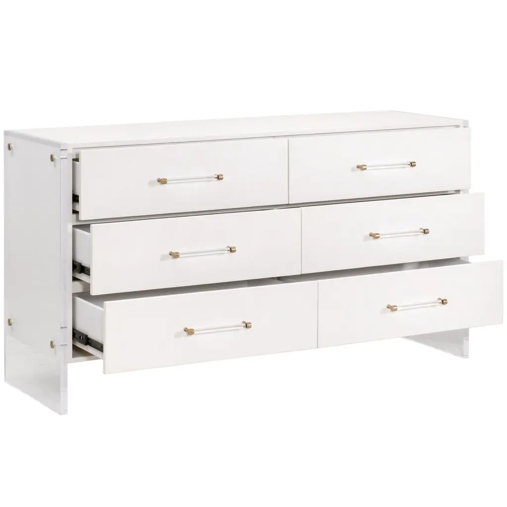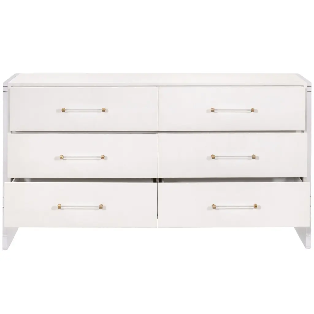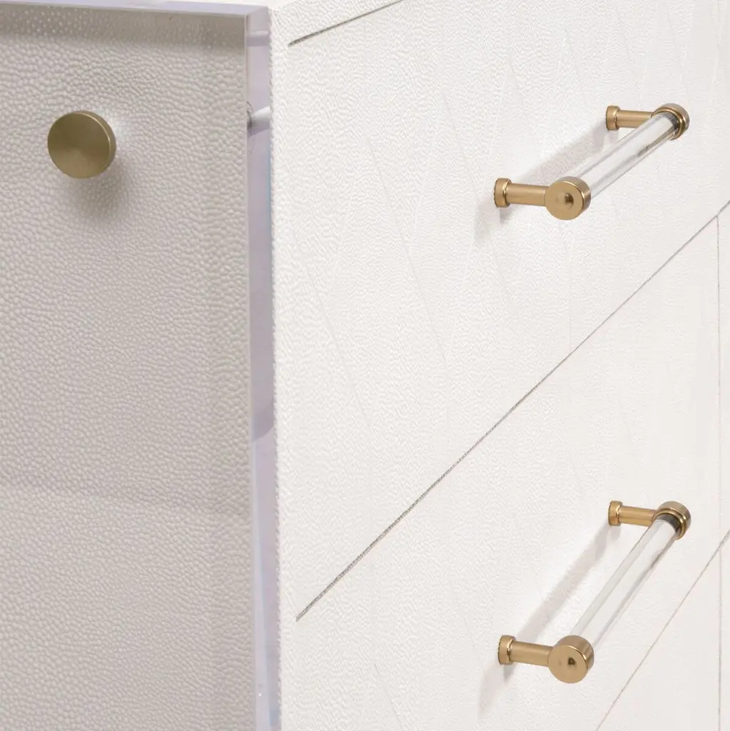 Crafted with a handful of uniquely paired materials, this dresser features a pearl white shagreen resin, rubberwood, beech wood, and clear acrylic. The faux shagreen is made to mimic real stingray skin, which has natural characteristics in color and texture. The drawer fronts feature a subtle geometric diamond pattern and clear acrylic handles. With six spacious storage drawers equipped with dual metal ball bearing glides and a hold-in detent to prevent roll-out, this dresser combines functionality and style effortlessly. The clear acrylic panel legs provide a modern twist, creating a harmonious blend of classic and contemporary. Measuring 62.25" wide, 19.5" deep, and 34" high, this double dresser offers ample storage space and is an embodiment of blended styles.