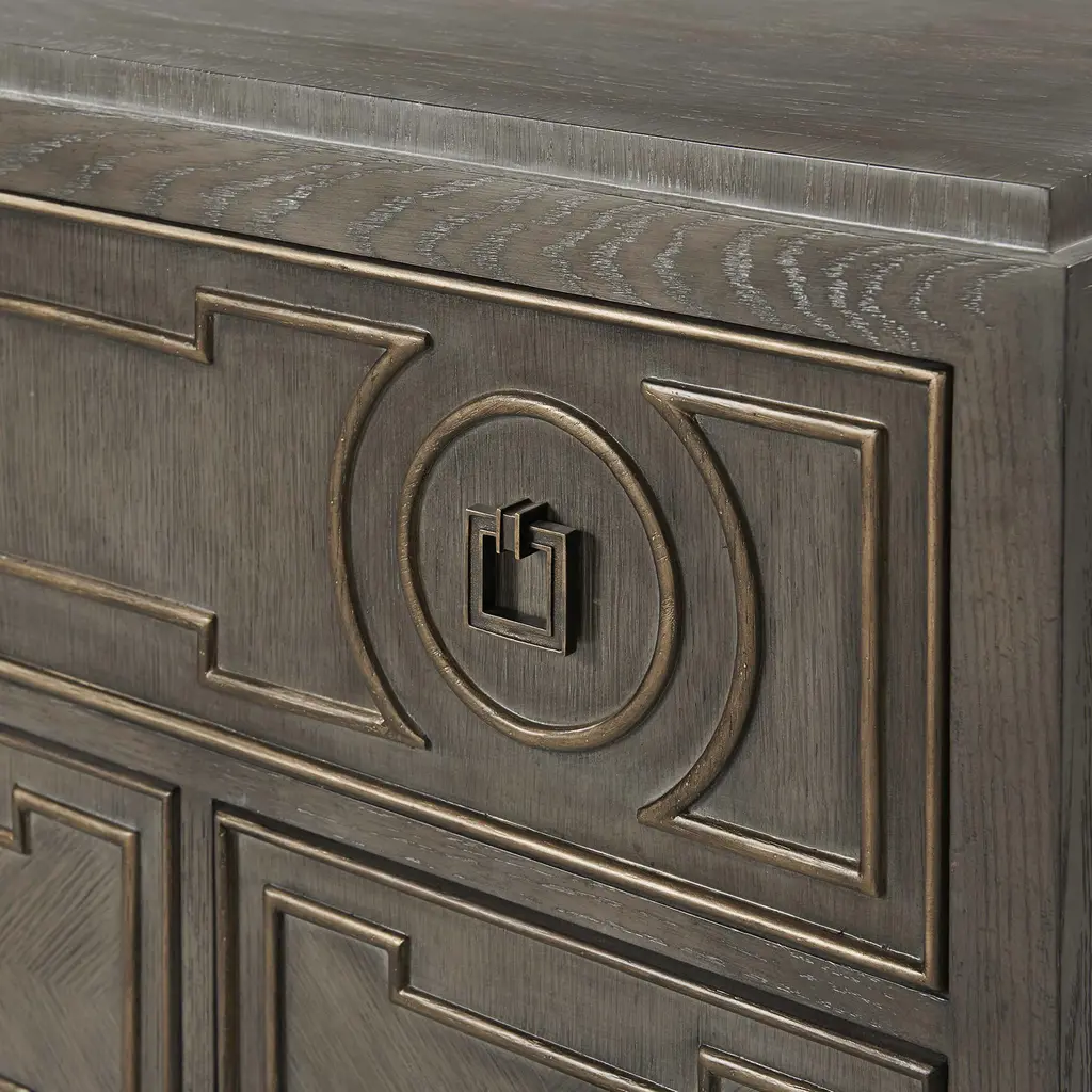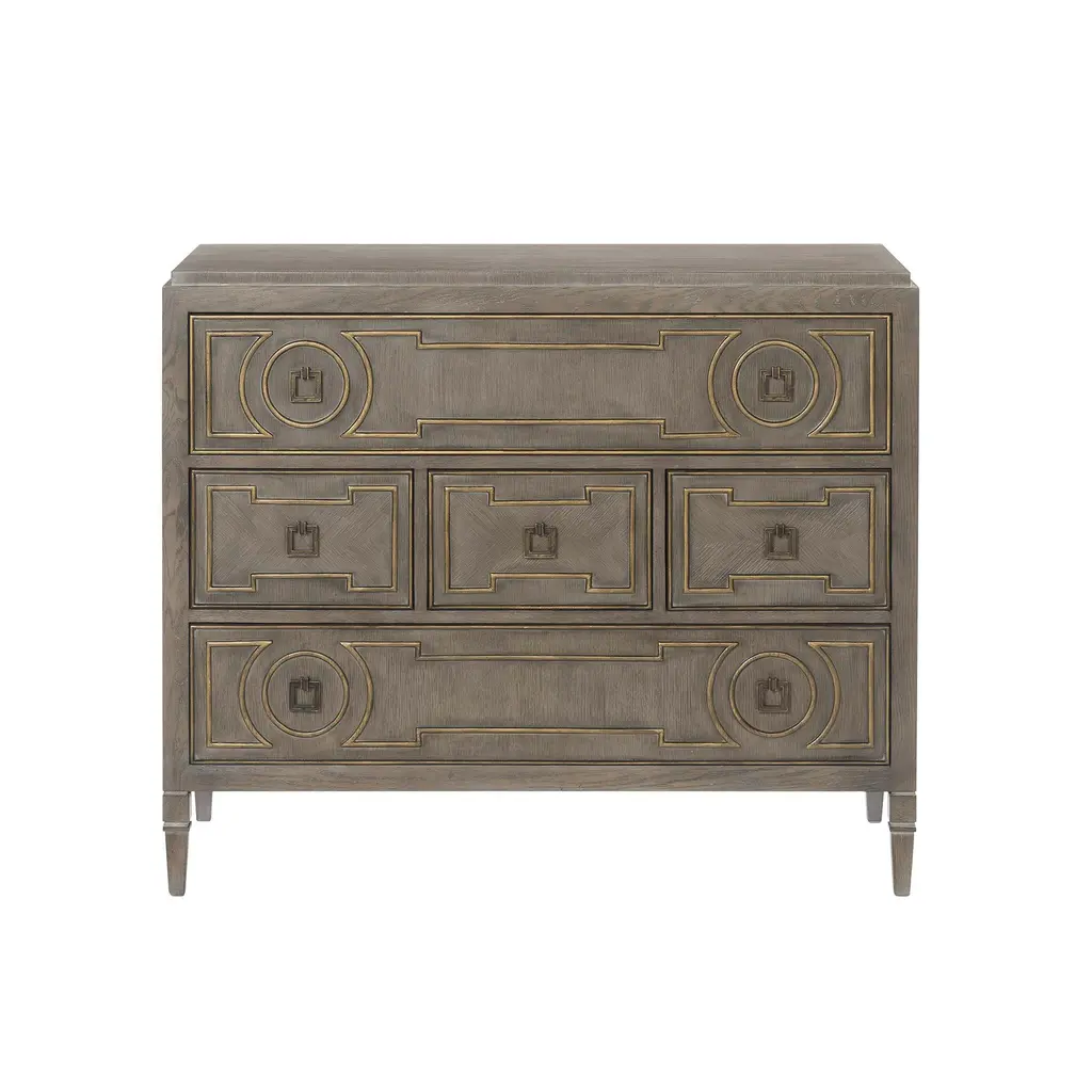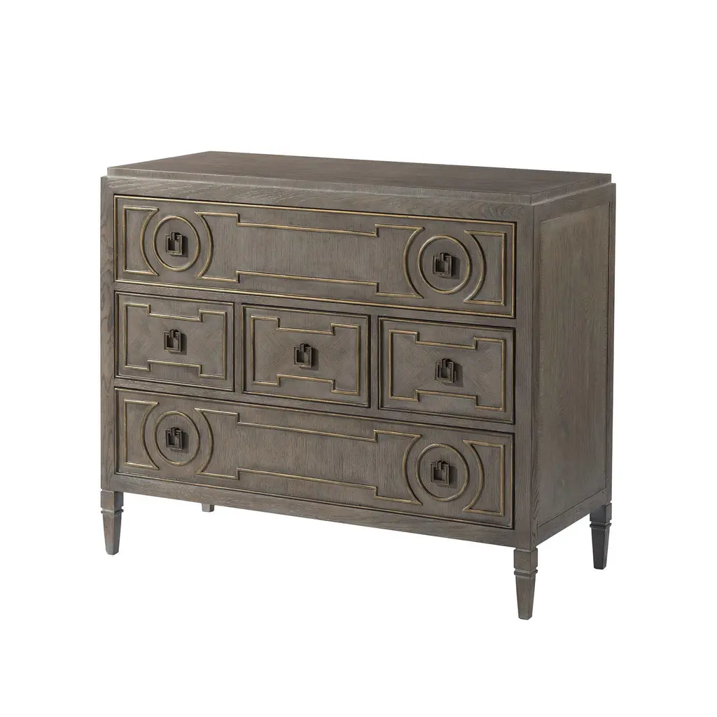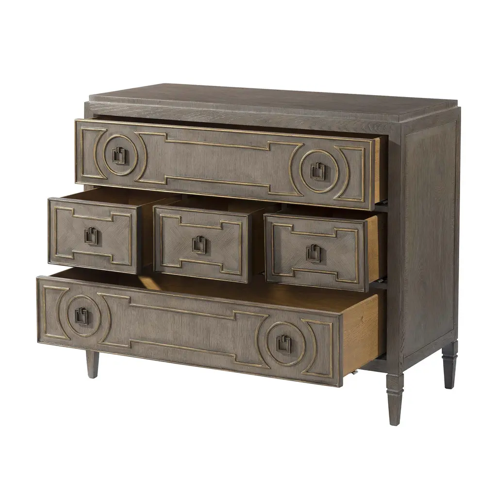 This classically inspired furniture piece is both stunning in design and very practiclly designed with 5 drawers. The wood is solid white Oak and the grain shows with the off white cerusing. Accented raised details all done in antique gold. Solid brass drawer pulls. We also have this listed in black and white and gold.