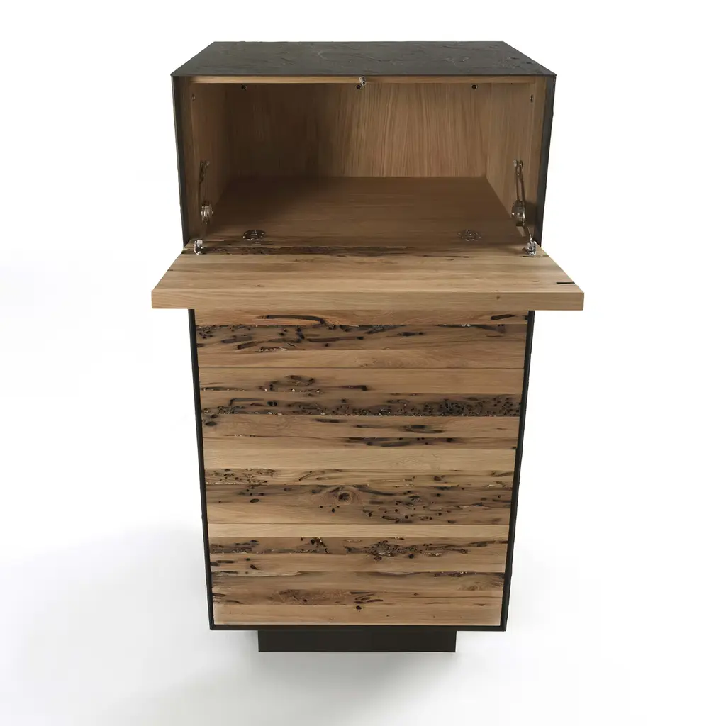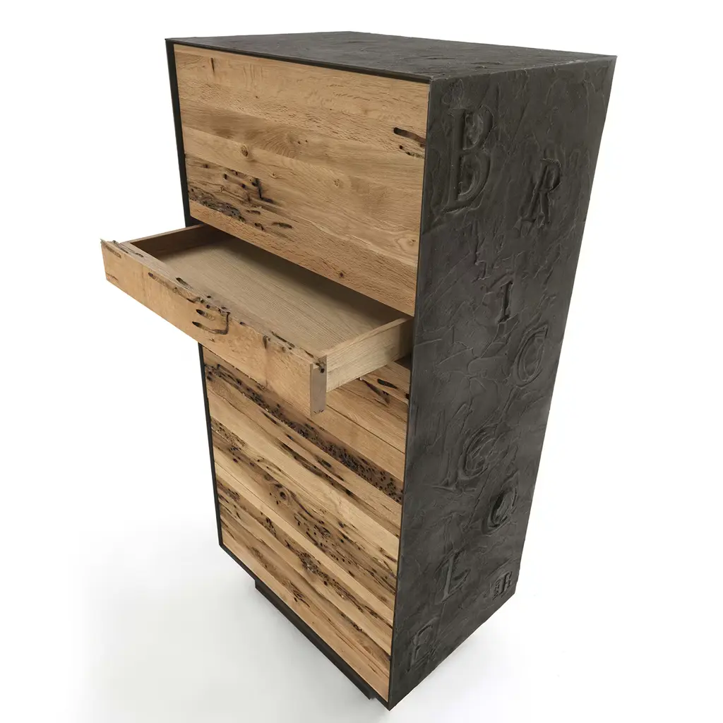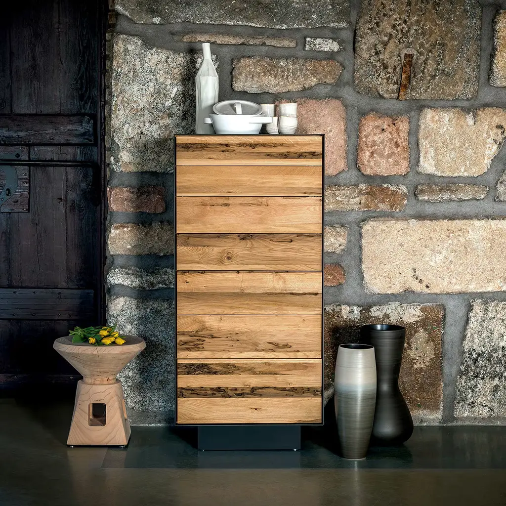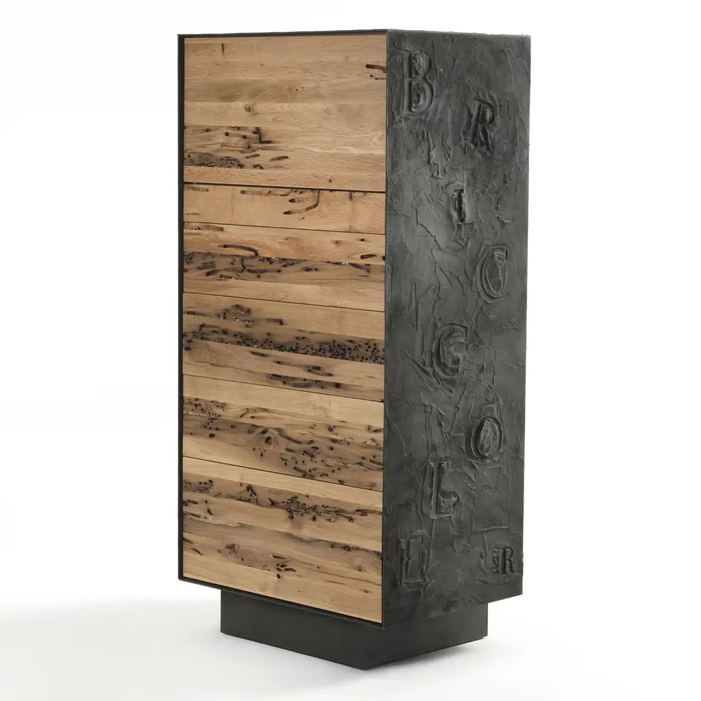 A minimalist iron shell lacquered in anthracite gray completed by a bold plinth base lends this design that essential character that favors the standing out of its rustic elements. Finished with wax, the drawers' fronts are fashioned of briccola, the same wood used to make the poles dotting the Venetian lagoon. Its striking dark holes and swirls create an unrepeatable decoration.