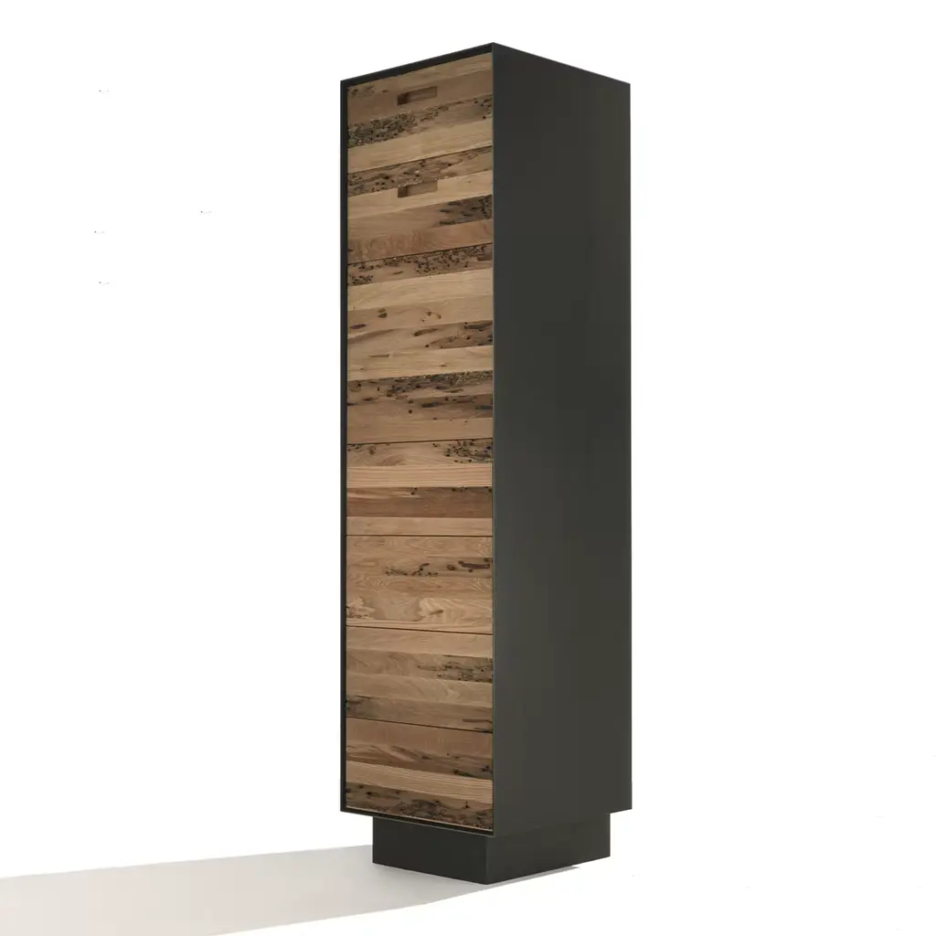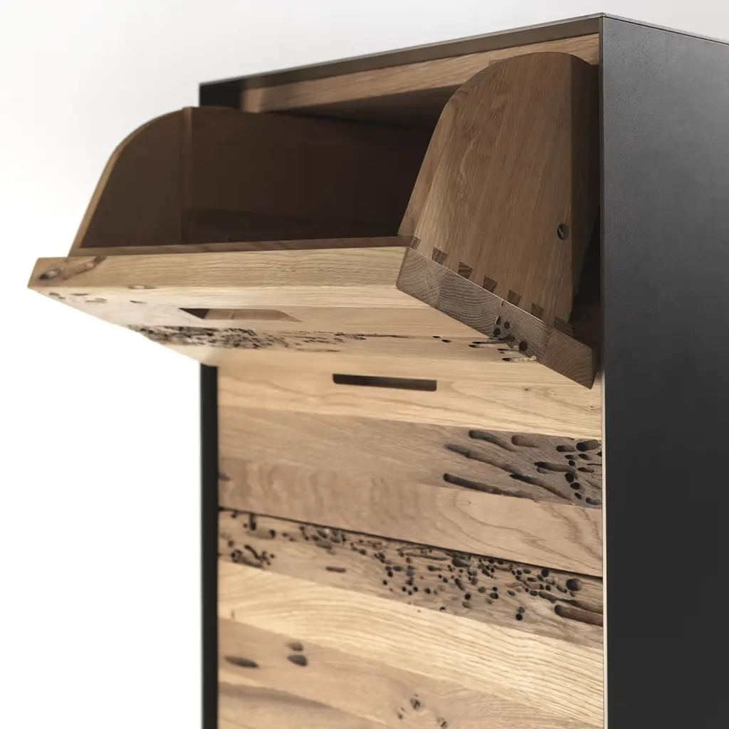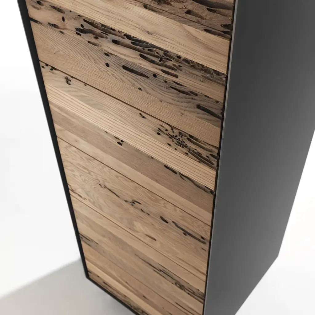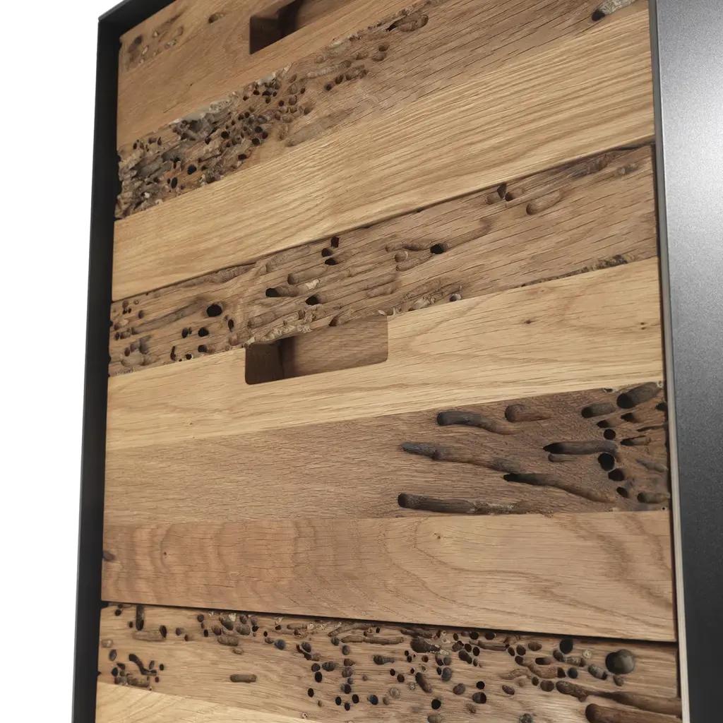 A totemic design stating its boldness at first glance distinguishes this singular chest of drawers. The external shell and plinth base are both fashioned of anthracite-gray-lacquered iron, an urban feel superbly contrasted by the natural grain of the drawers' front in briccola - the same wood used to craft the poles in the Venetian lagoon. A layer of wax seals the wooden surfaces.