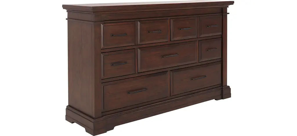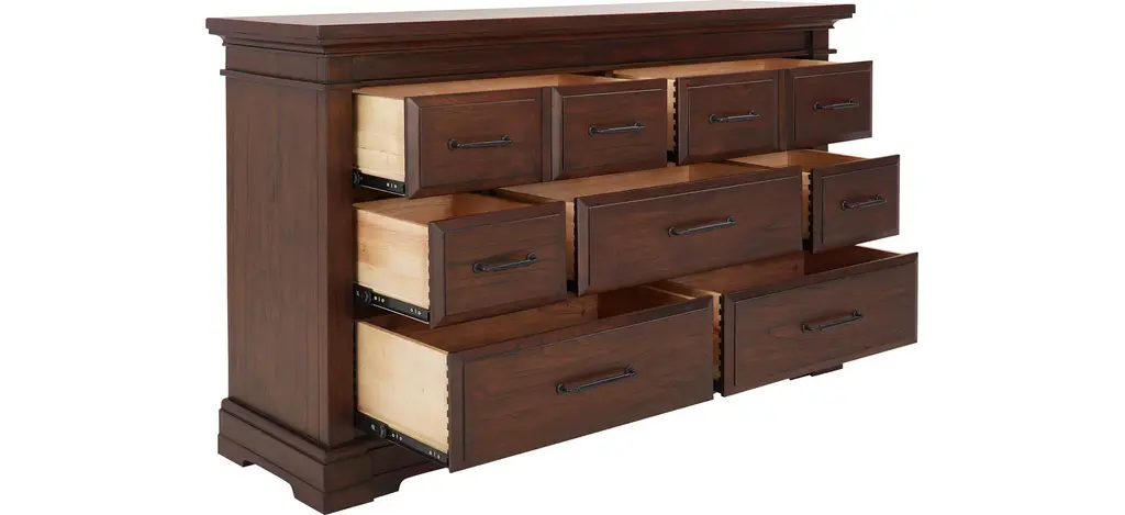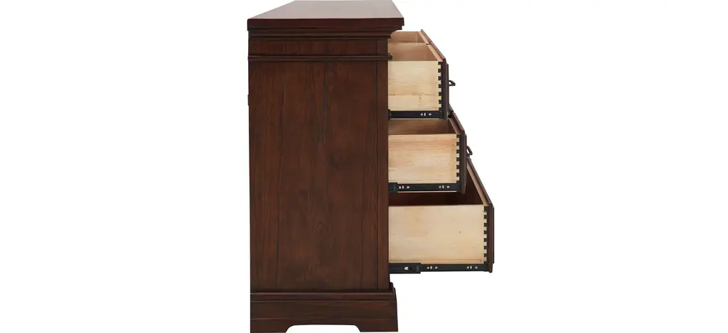 This rich-looking Richmond Dresser, with its dark wood finish and traditional design, is a fitting choice for your traditional bedroom. It also features roomy drawers and antiqued finish hardware for classic style.
