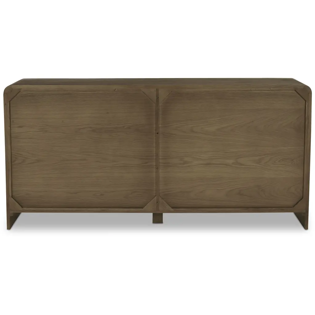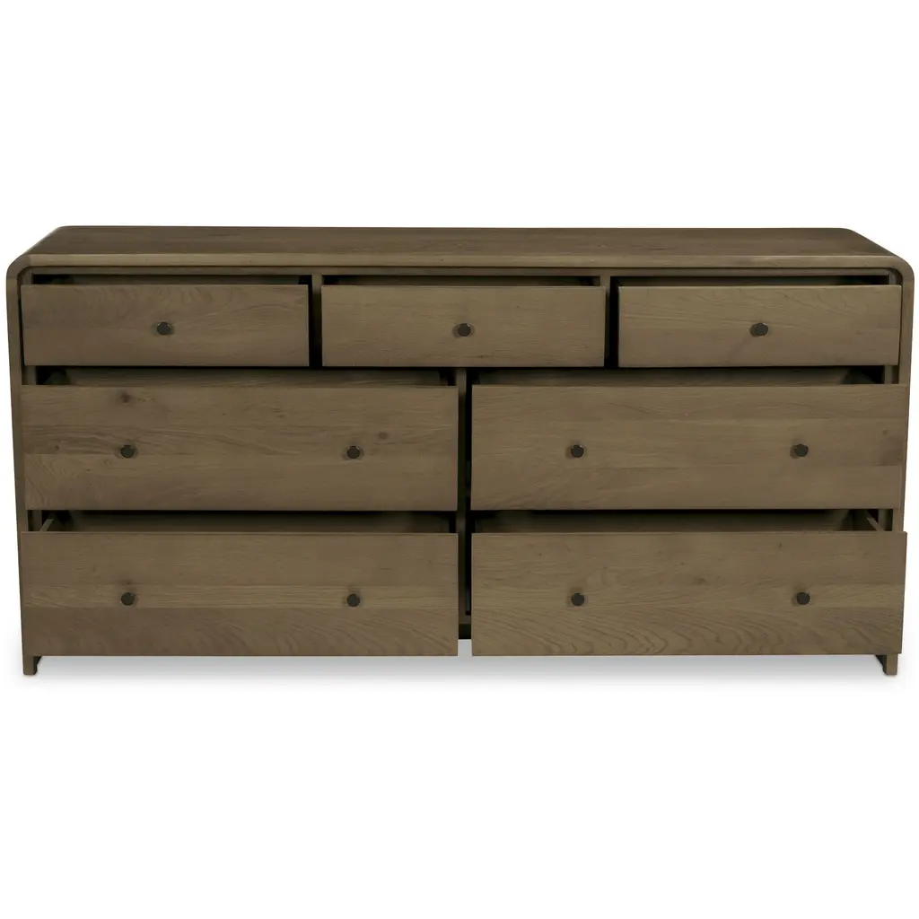 Featuring a unique waterfall edge and overhang detailing, the Riley 7-drawer dresser offers captivating visual interest, underscored by its solid oak construction. The seamless design is a timeless blend of sophistication and practicality, with ample seven-drawer storage.