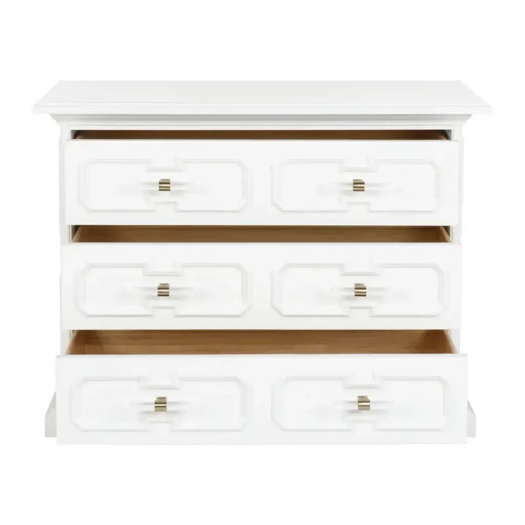 A fresh perspective that was inspired by a classic piece, the River Steet Chest is an inviting silhouette with a garden trellis design finished in white lacquer and modern acrylic handles. Perfect for any entryway or living room. Designed by Bill Cain.