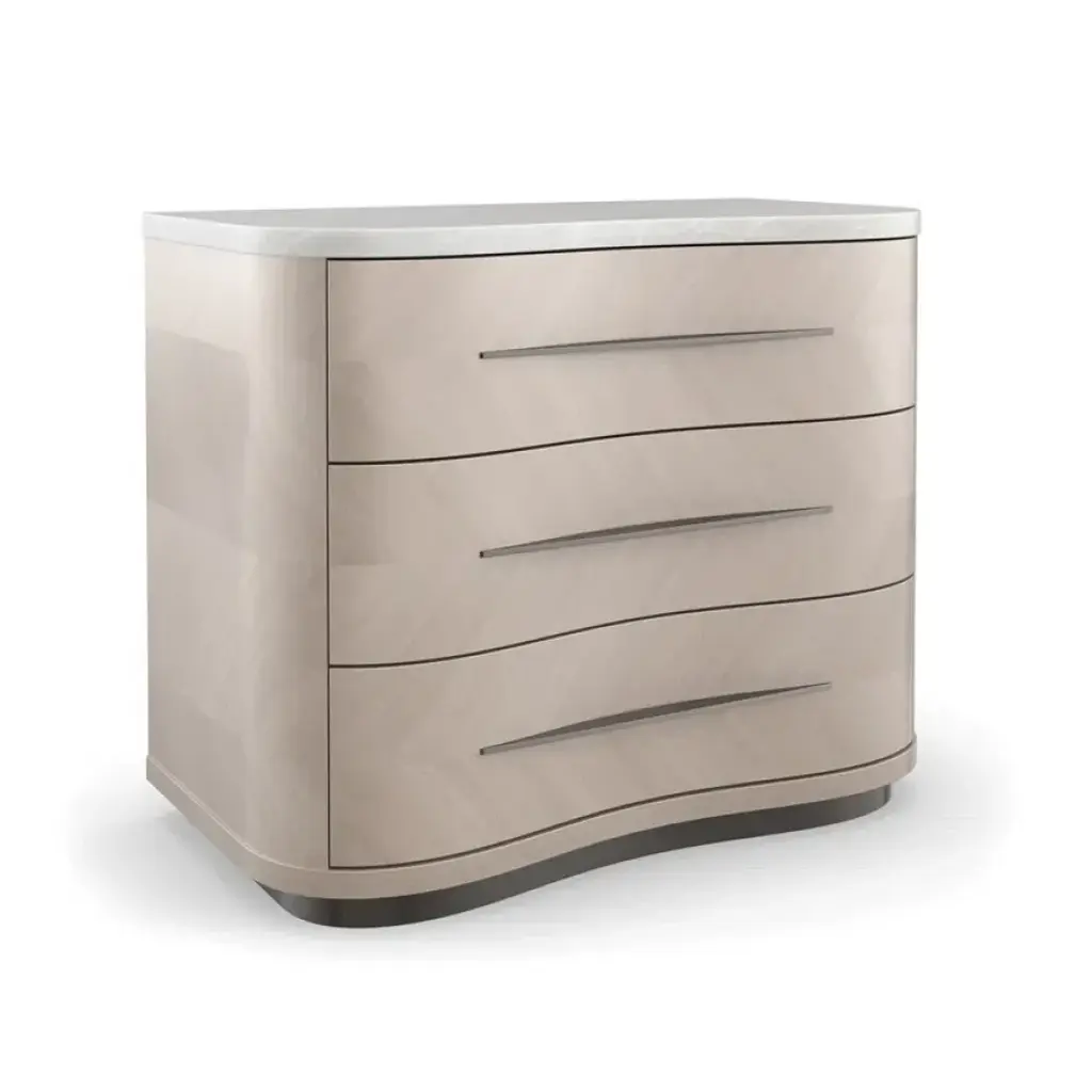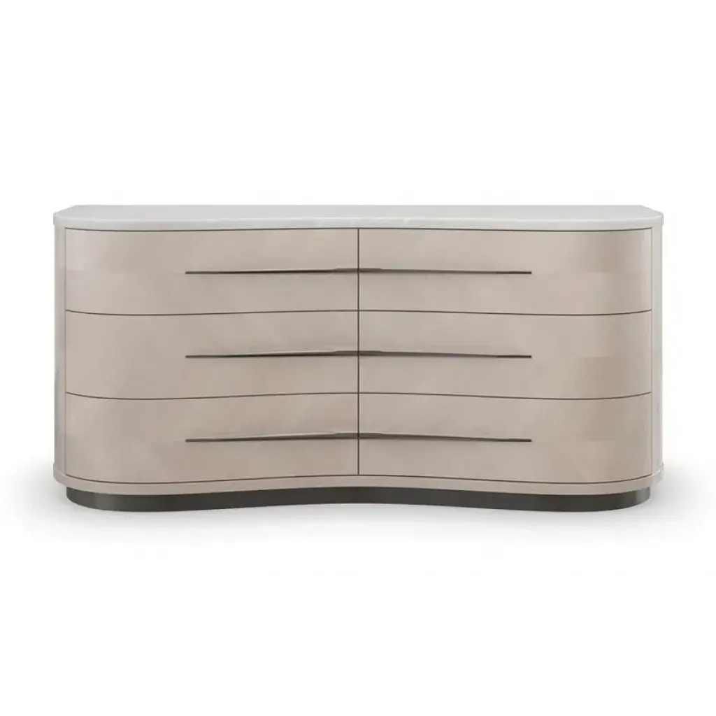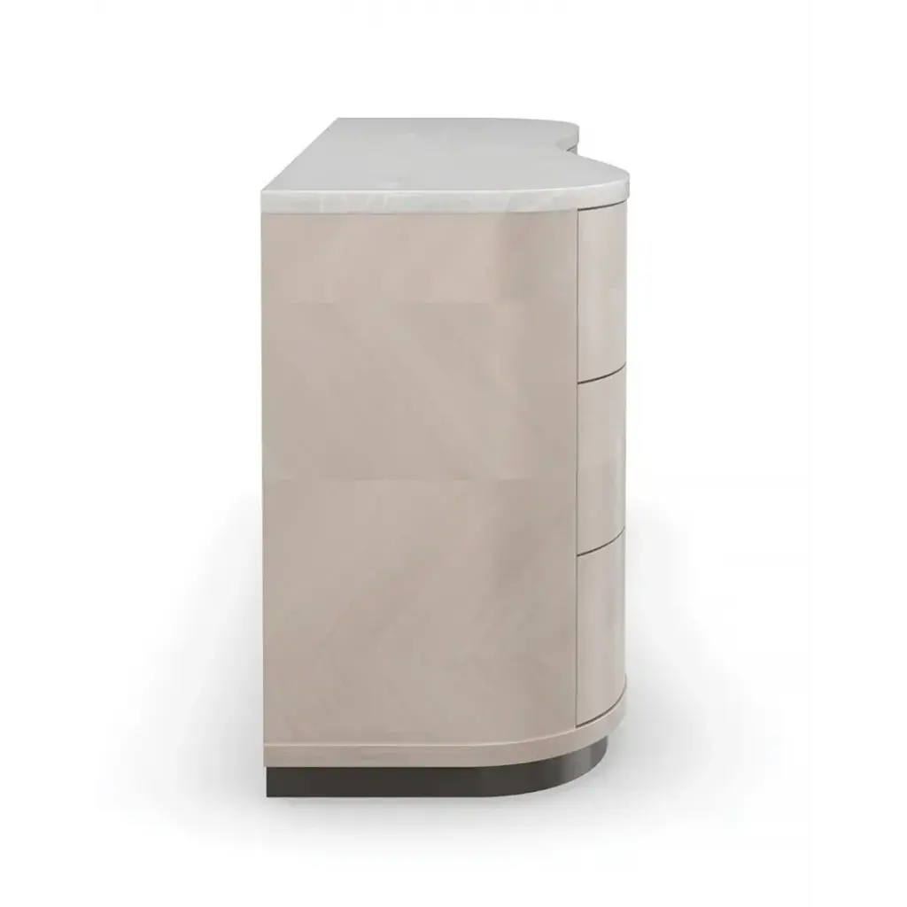 Sleek and sinuous in a pearlescent Moonstone finish, this dresser introduces an elegant form with organic simplicity. Chevron-patterned Koto veneers highlight its fluidity, defined by six gently curving, soft-close drawers with horizontal hardware in a Deep Bronze finish. A White Rhino marble top adds a touch of luxe and durable top surface. With ample potential for style and storage, Roam is a naturally appealing addition to bedrooms and living interiors.