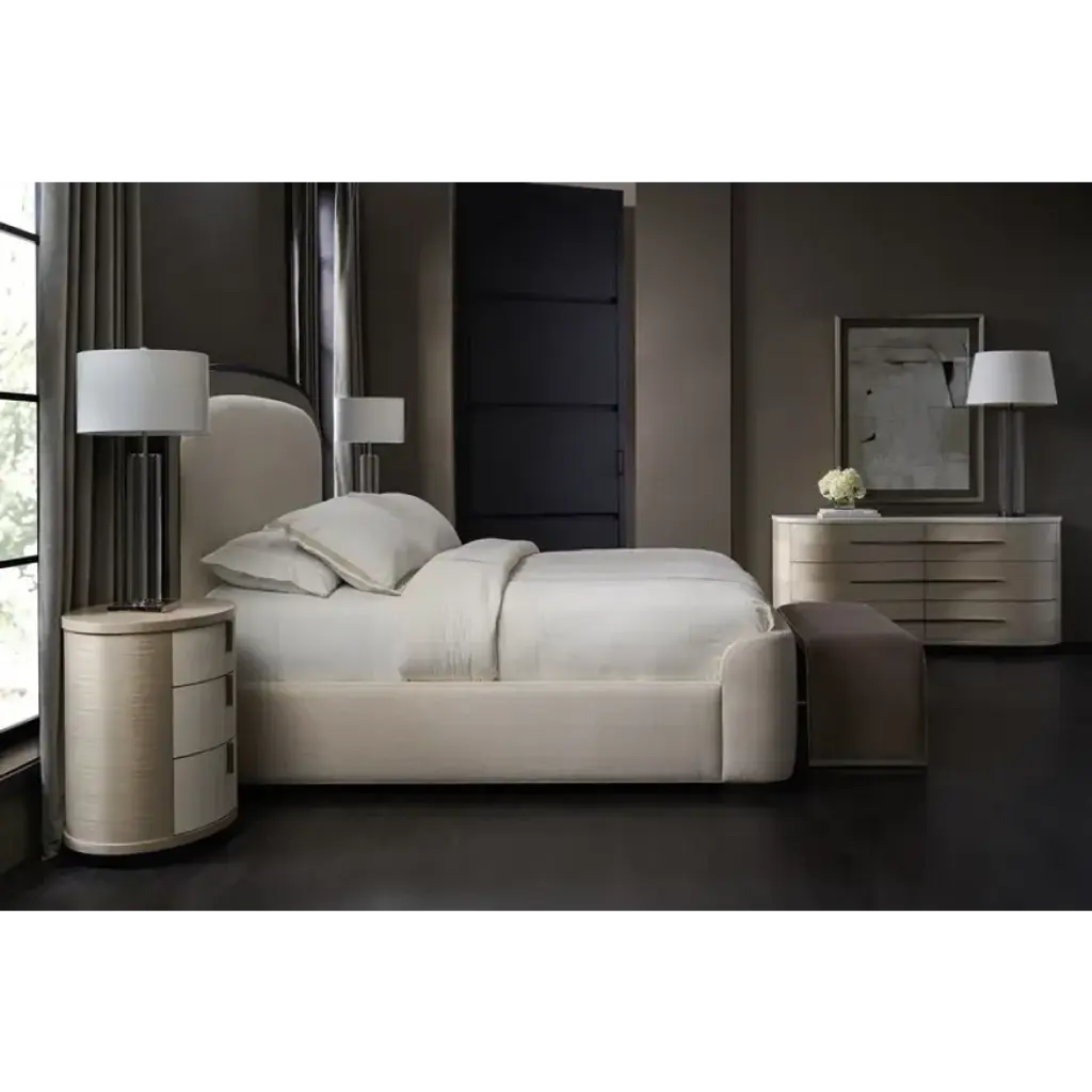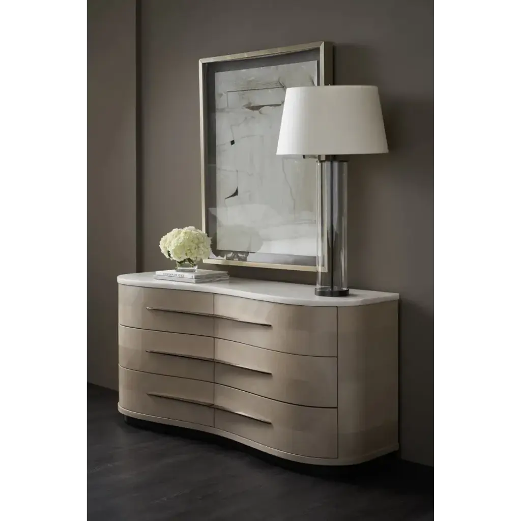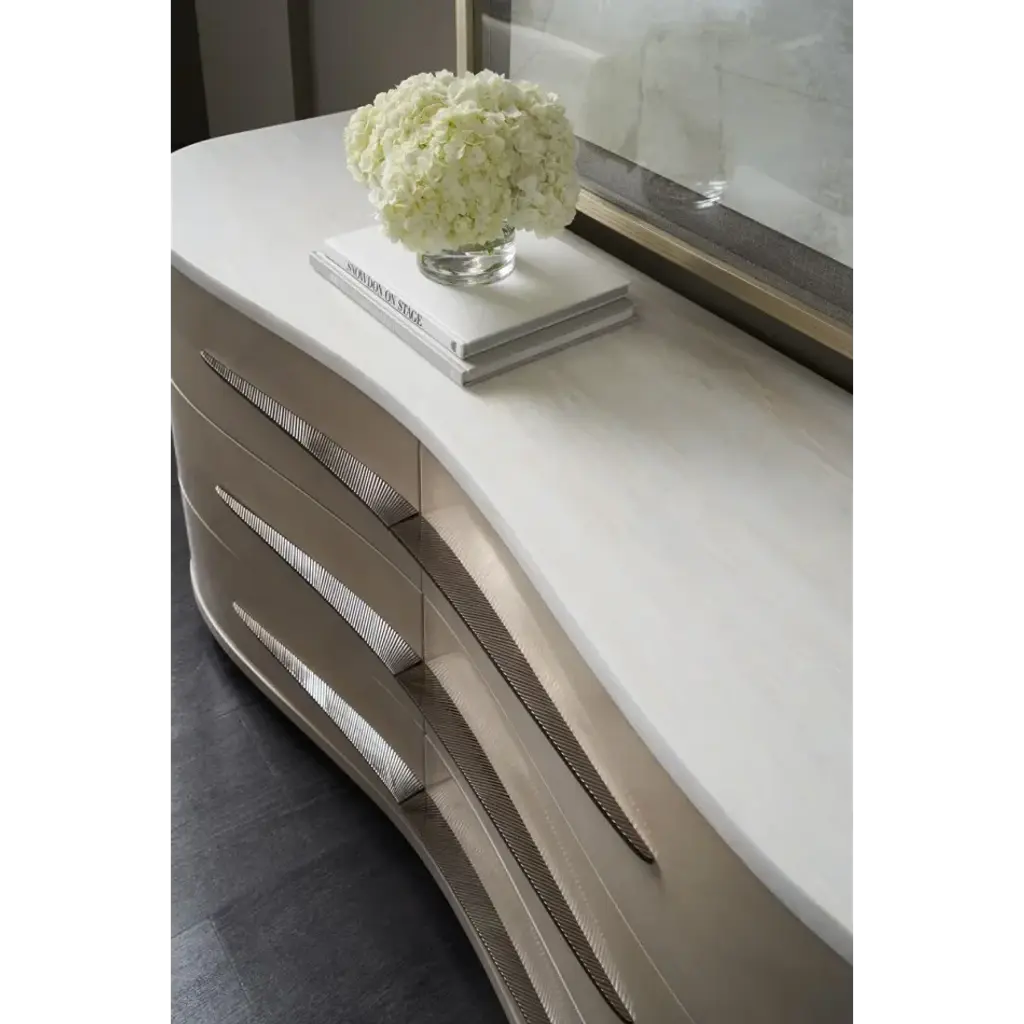 Sleek and sinuous in a pearlescent Moonstone finish, this dresser introduces an elegant form with organic simplicity. Chevron-patterned Koto veneers highlight its fluidity, defined by six gently curving, soft-close drawers with horizontal hardware in a Deep Bronze finish. A White Rhino marble top adds a touch of luxe and durable top surface. With ample potential for style and storage, Roam is a naturally appealing addition to bedrooms and living interiors.