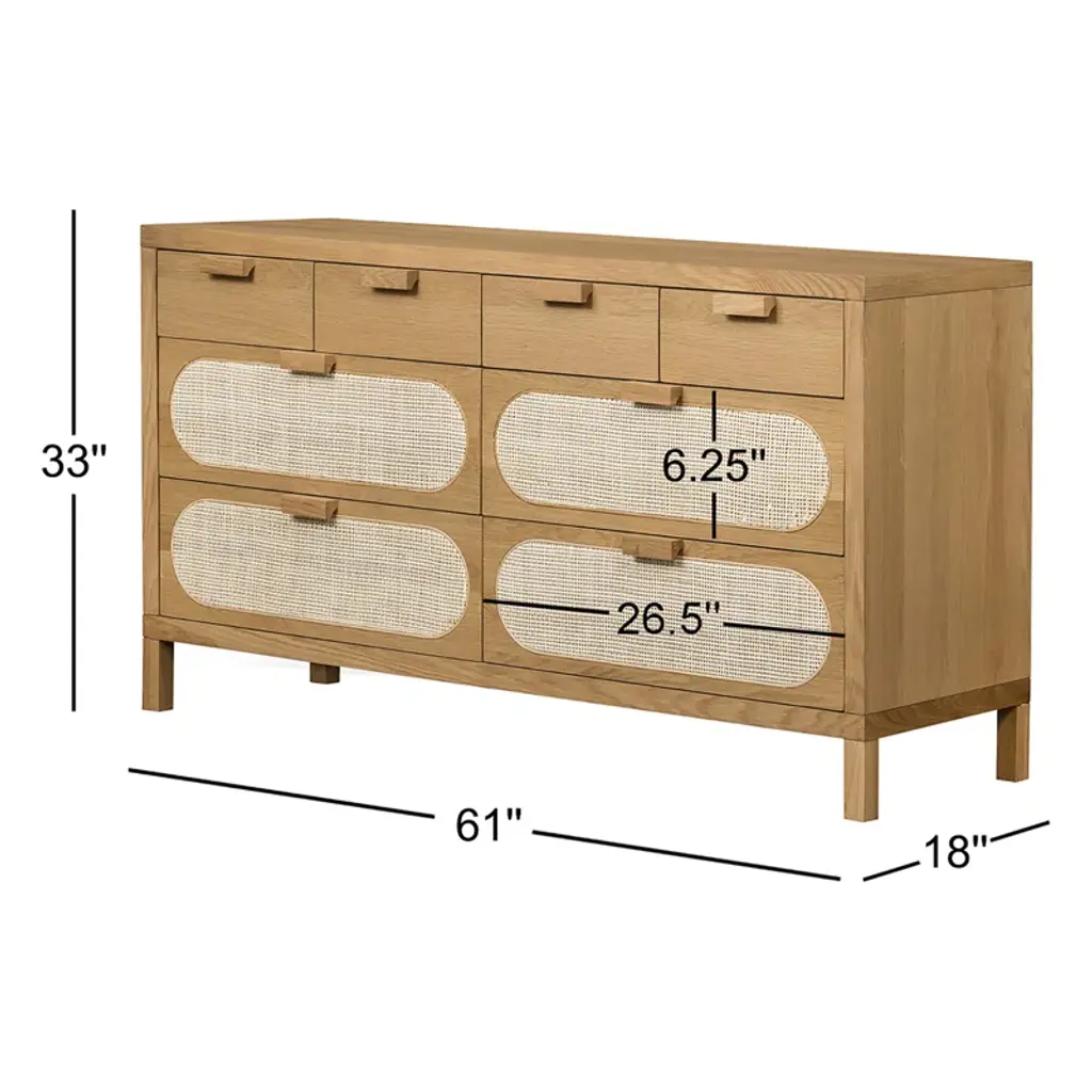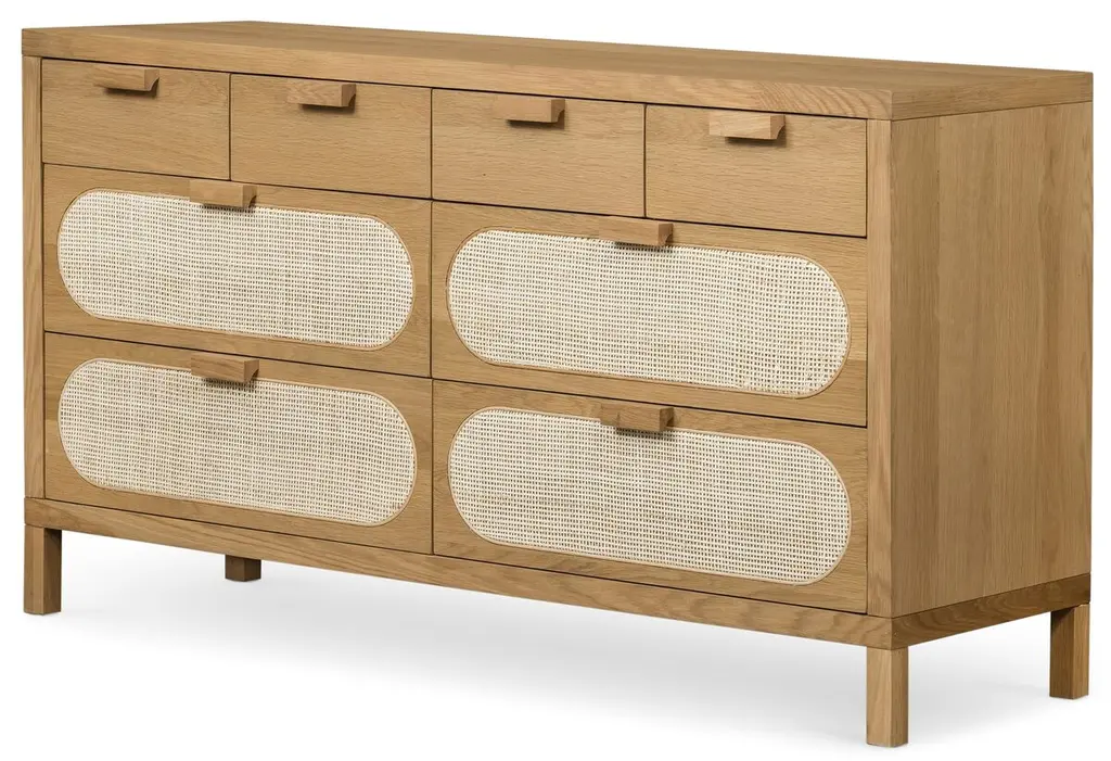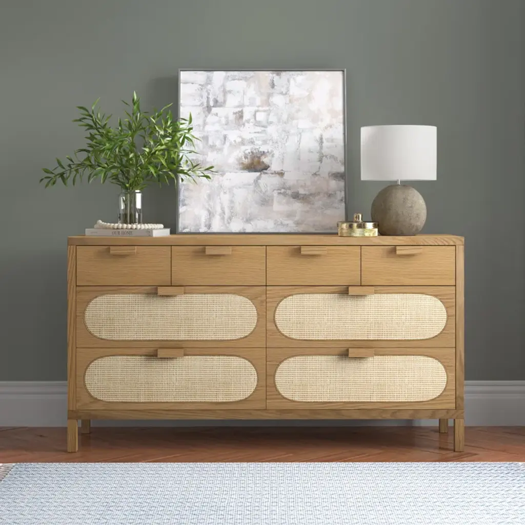 This 8-drawer double dresser has a soft, neutral look with lasting, on-trend modern details. It's made from solid and engineered wood with a natural honey oak finish. The 8 spacious drawers have pill-shaped cane fronts for a subtle mixed-material element we love. Each drawer boasts dovetail joinery, plus an eye-catching natural wood grain color variation throughout. Plus, this dresser arrives fully assembled for fuss-free installation.