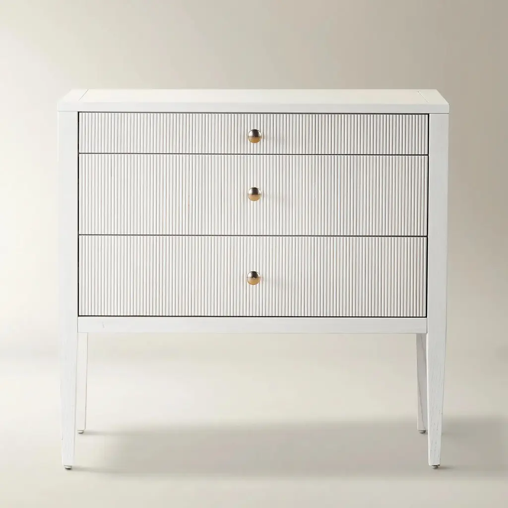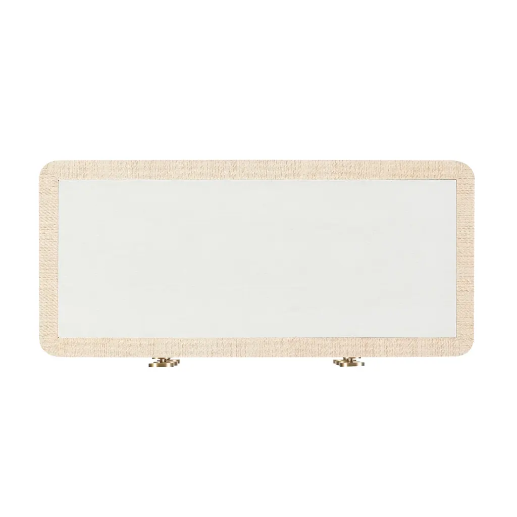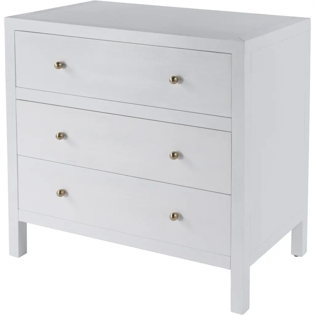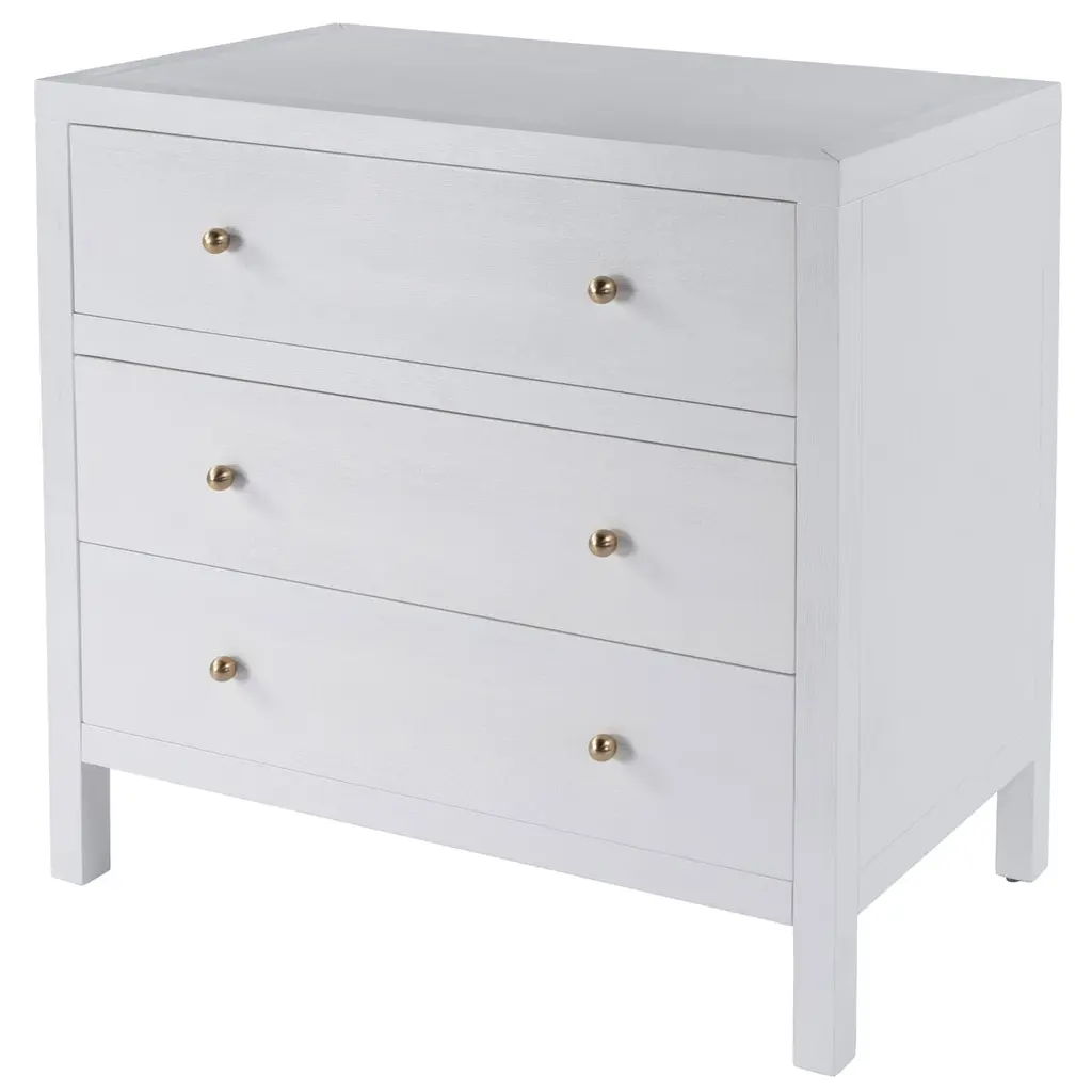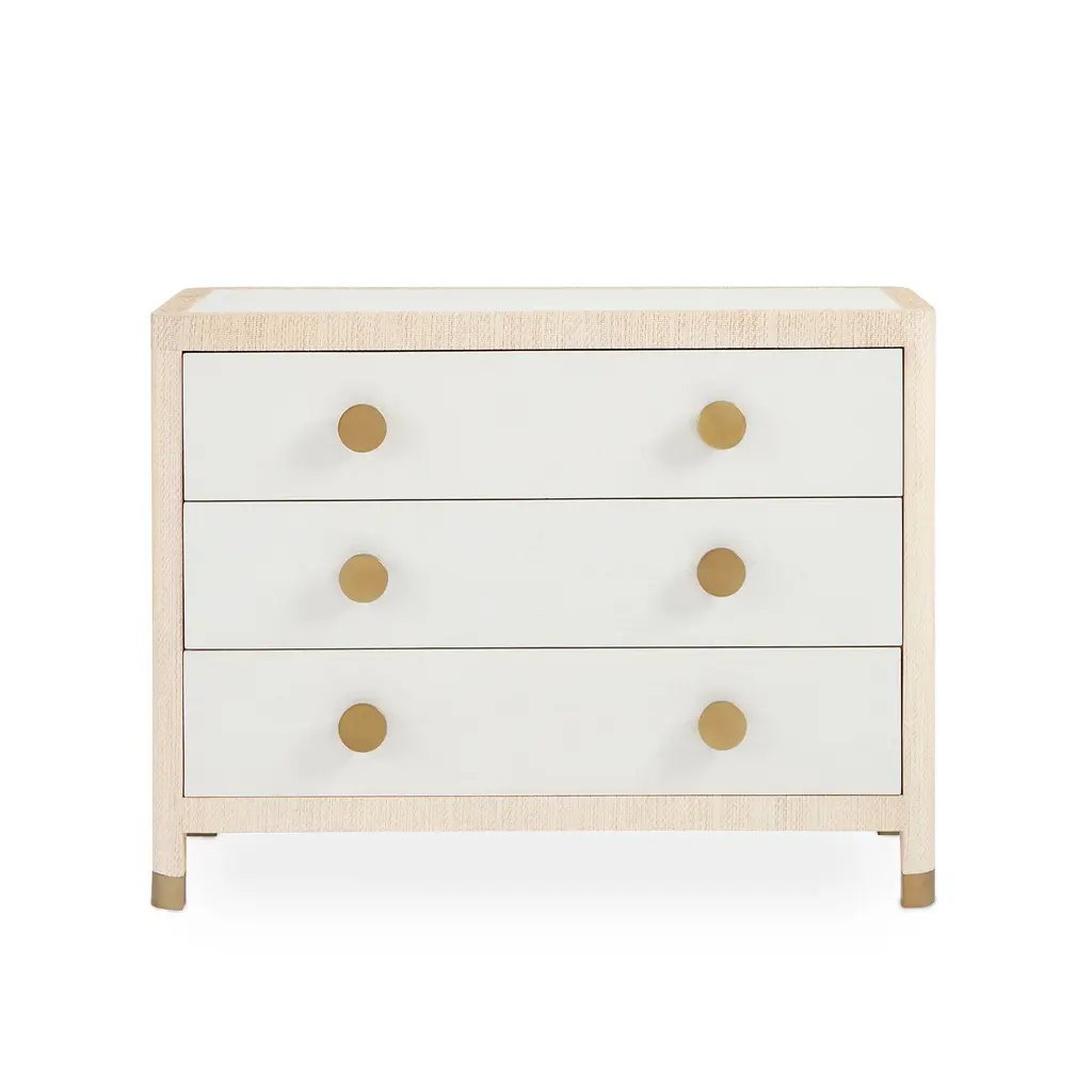An exquisite specimen of chic boho, the Rose Chest pairs contemporary angles and curves with the natural texture of raffia and linen, as well as the warmth of brass hardware and leg ferrules. Ships In 4-5 Weeks Brass hardware and accents Raffia and linen accents Three drawers This image is for illustrative purposes only. The colors shown are accurate within the constraints of lighting, photography, and the color accuracy of your screen.